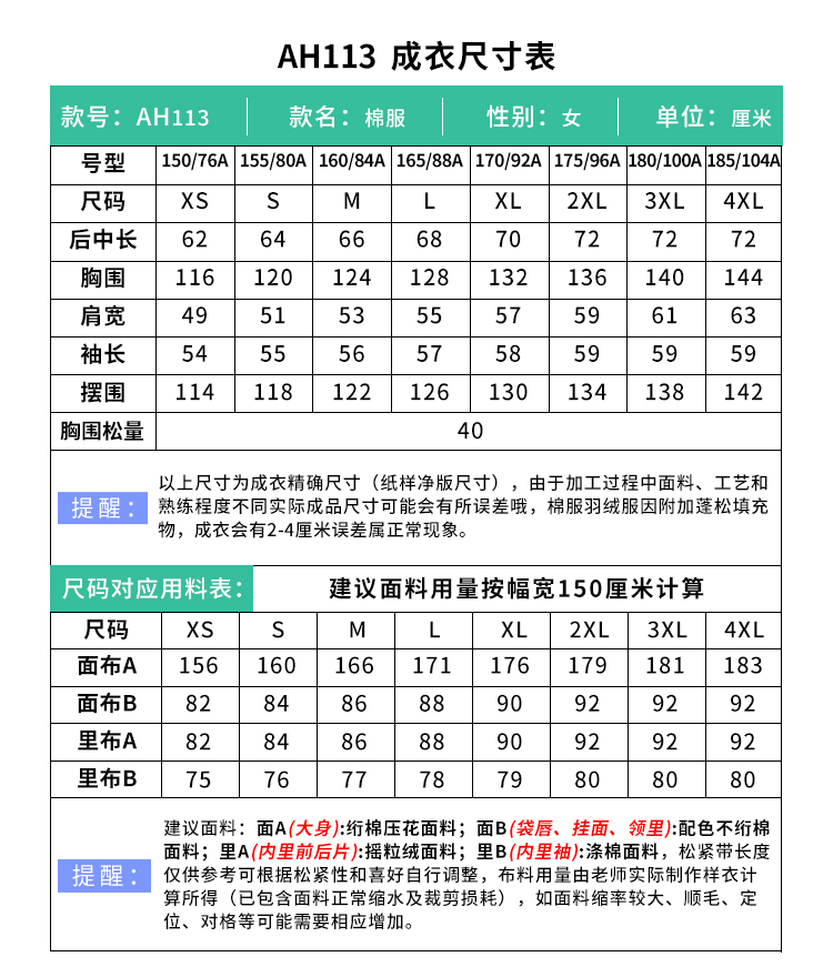 裁缝学苑AH113复古高领夹棉绗棉衣纸样女装棉服打版裁剪样板图