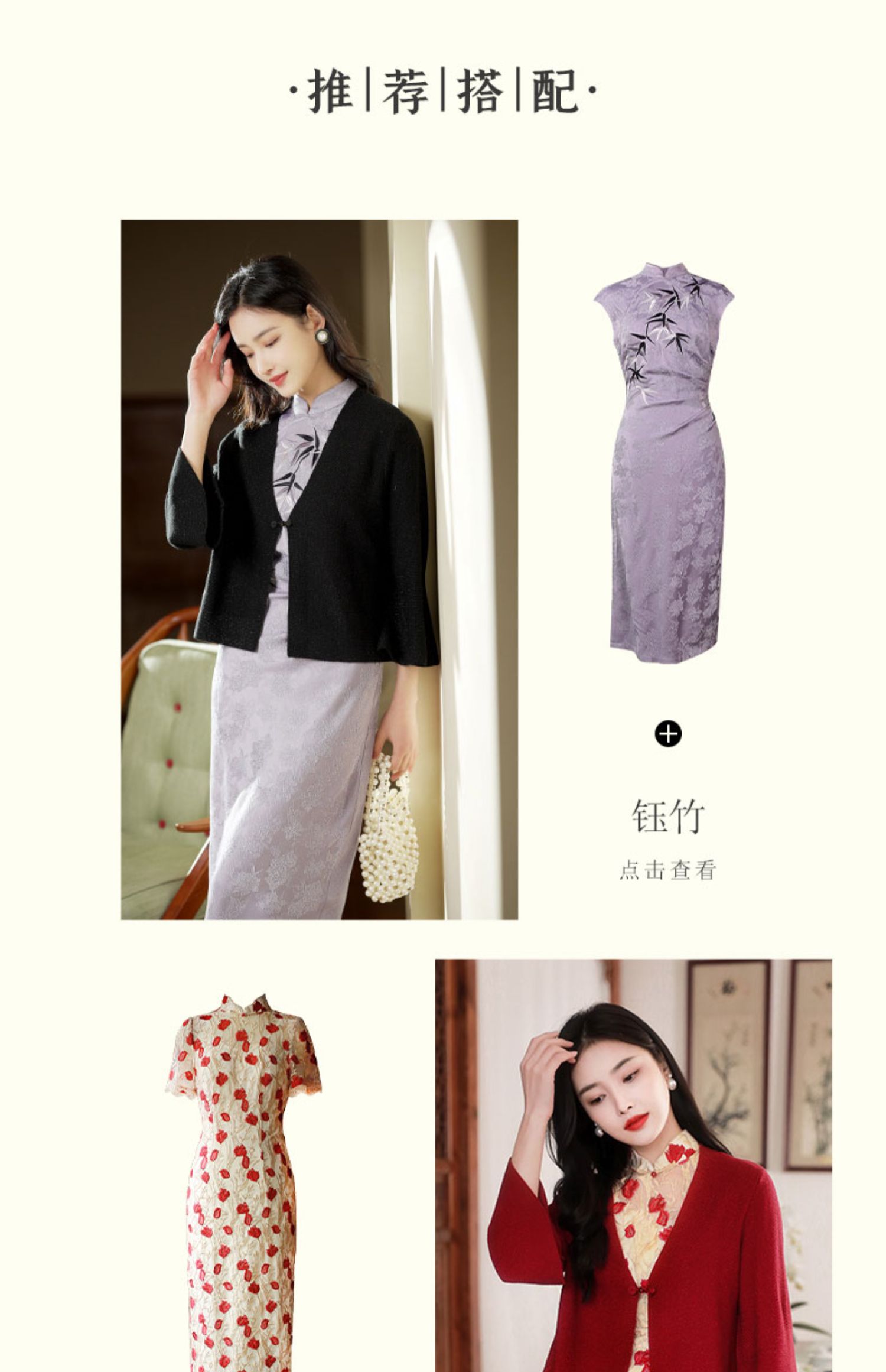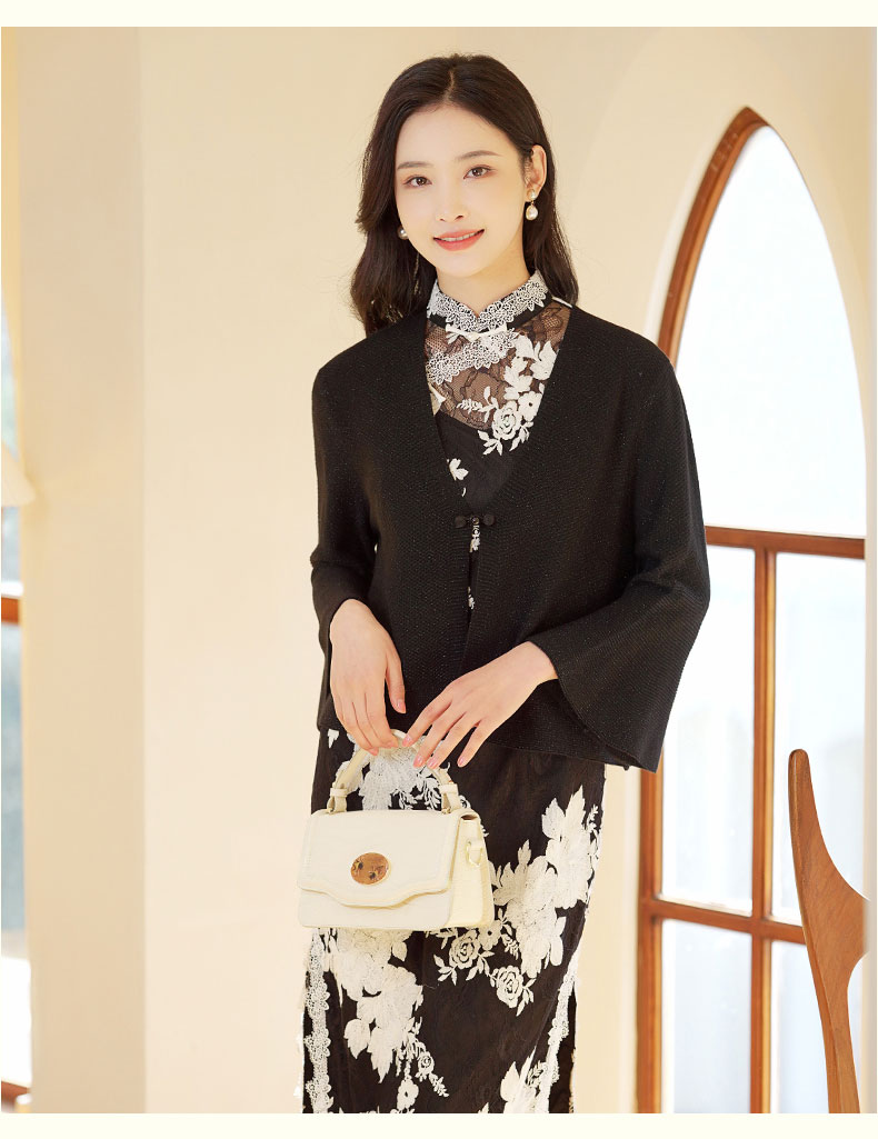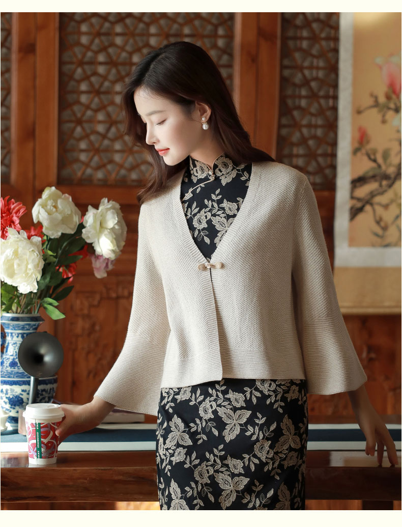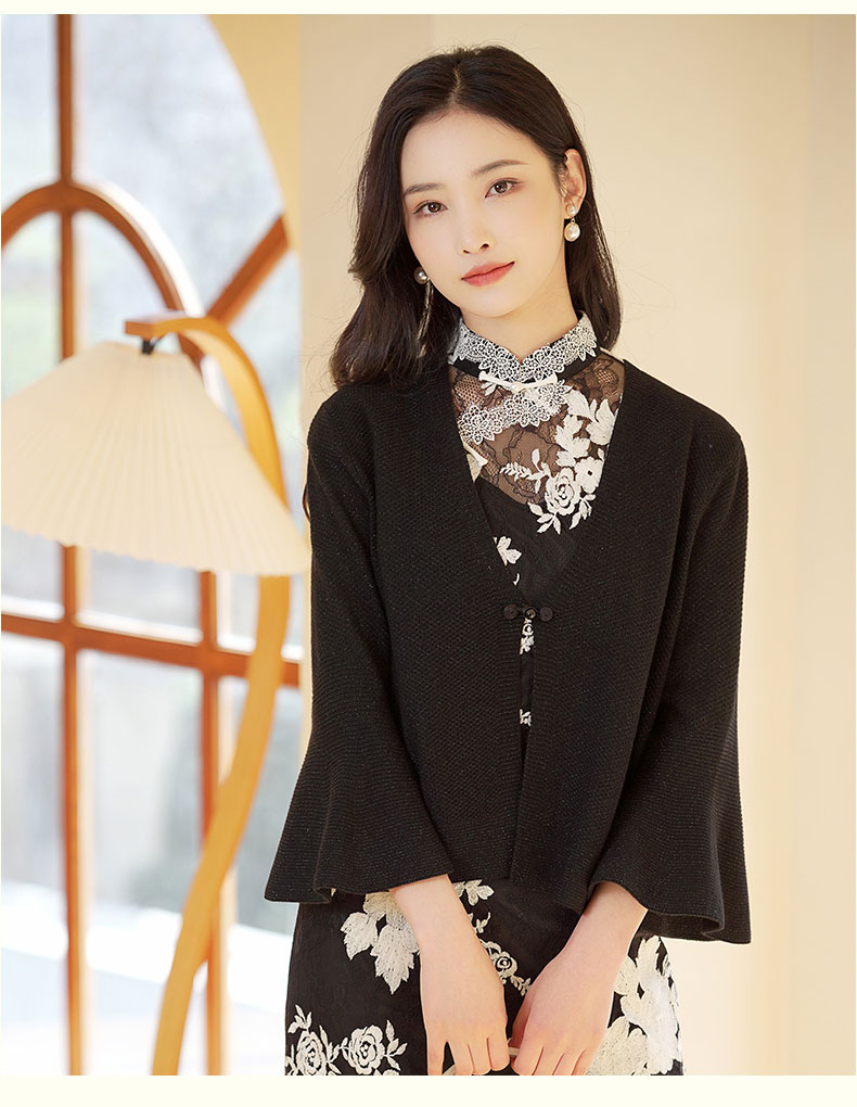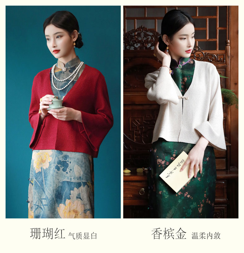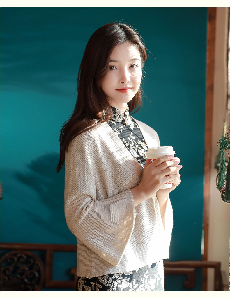 整件版型是A摆造型,搭配修身旗袍、吊带,叠穿营造空间层次感,显瘦飘逸。经典倒大袖,容量大,轻松容纳不同袖型旗袍,前中点缀玉石盘扣,精致复古。