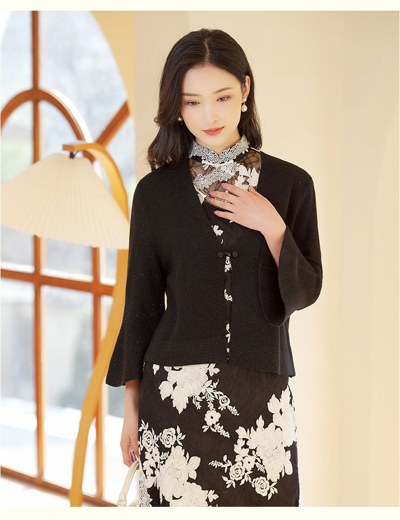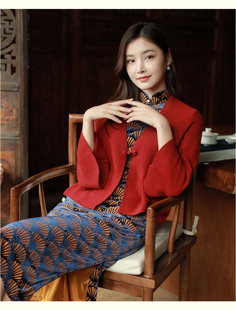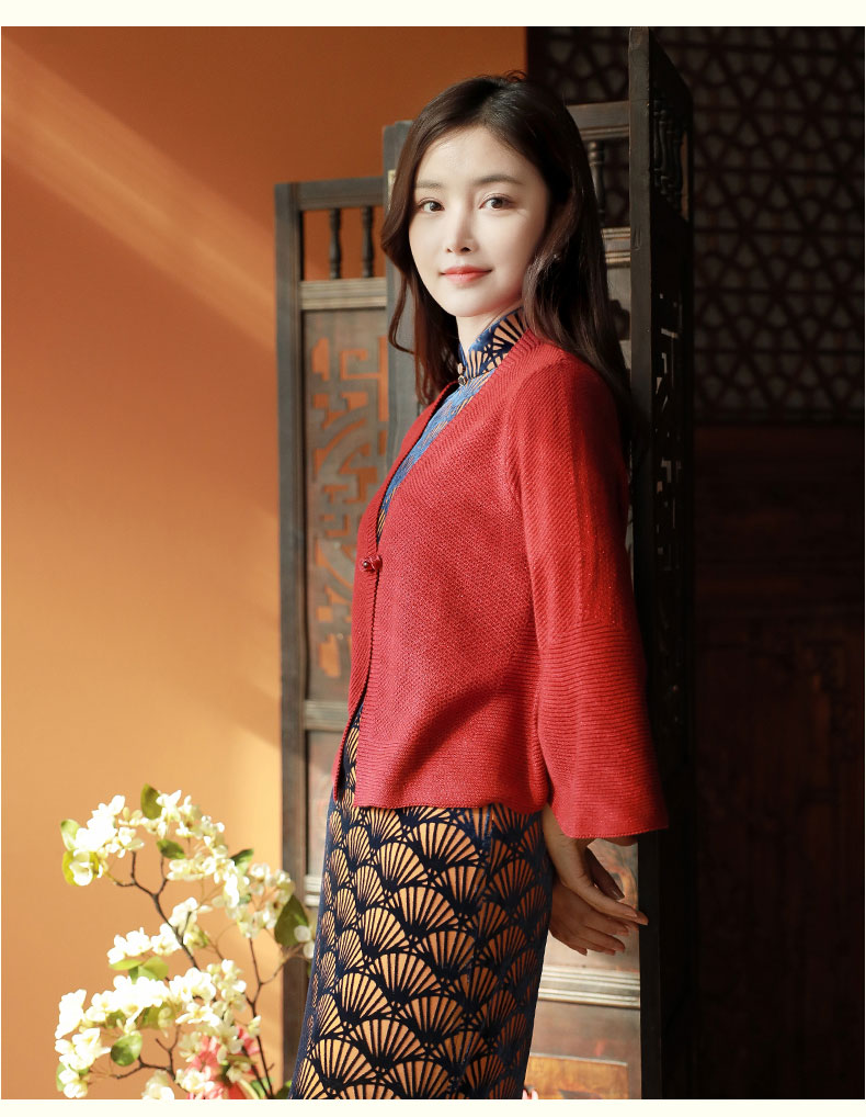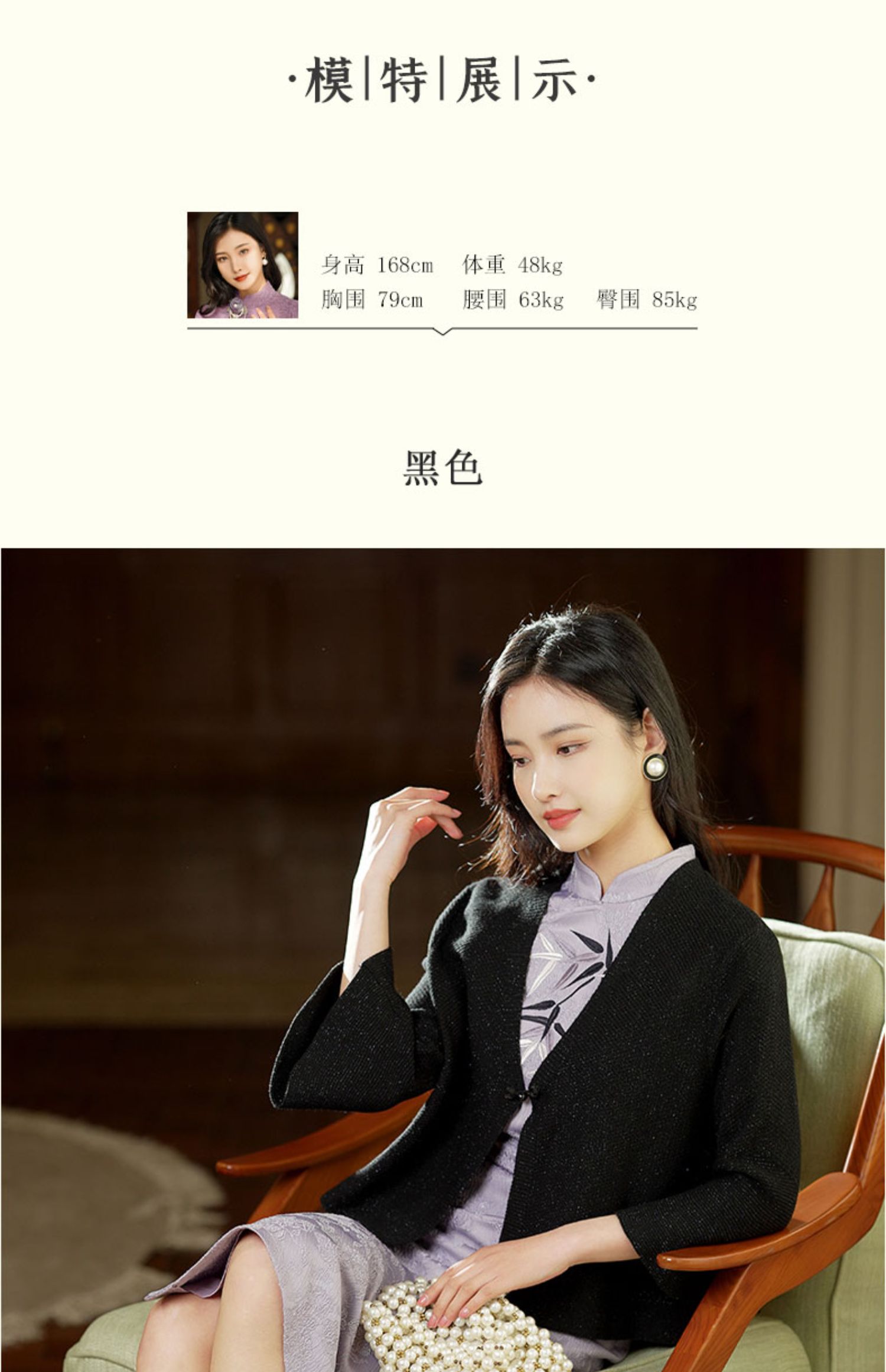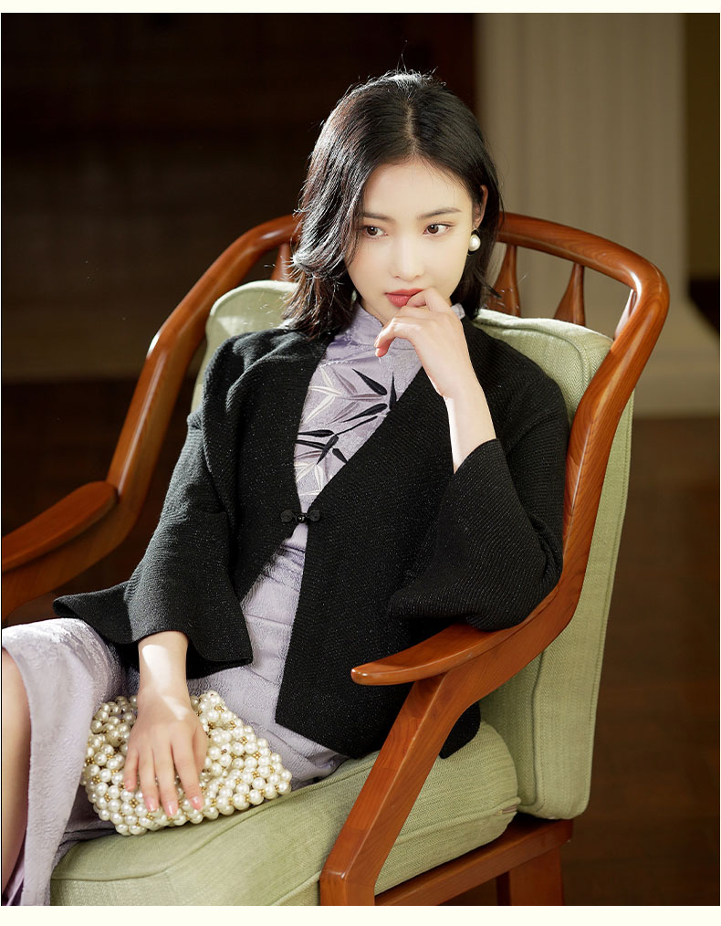 整件版型是A摆造型,搭配修身旗袍、吊带,叠穿营造空间层次感,显瘦飘逸。经典倒大袖,容量大,轻松容纳不同袖型旗袍,前中点缀玉石盘扣,精致复古。