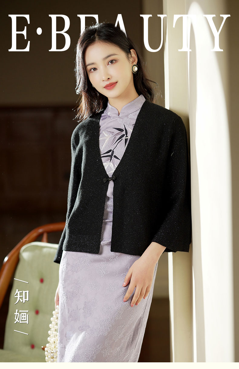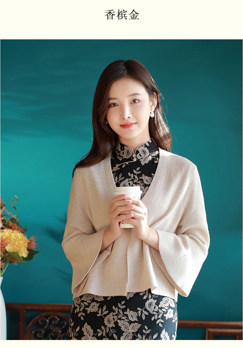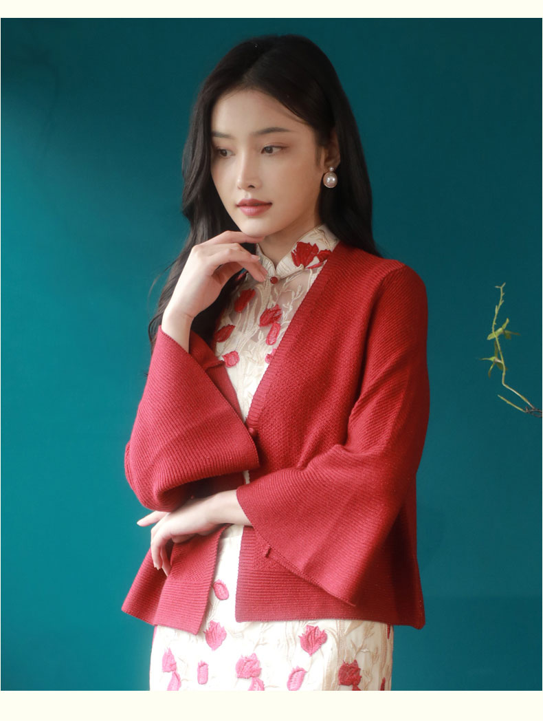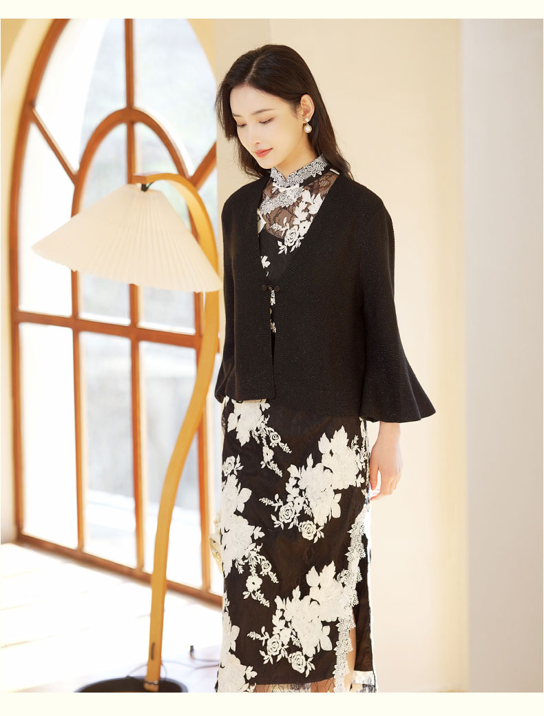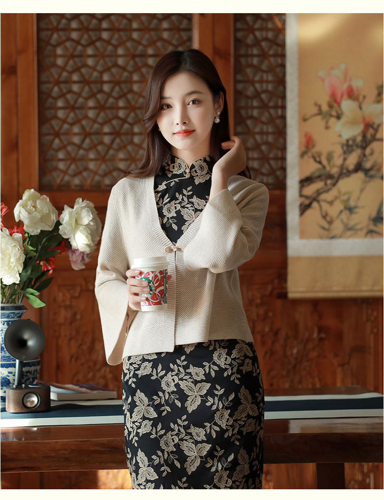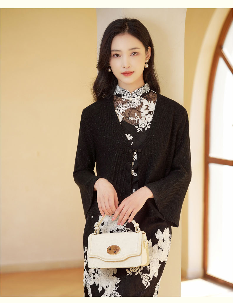 整件版型是A摆造型,搭配修身旗袍、吊带,叠穿营造空间层次感,显瘦飘逸。经典倒大袖,容量大,轻松容纳不同袖型旗袍,前中点缀玉石盘扣,精致复古。