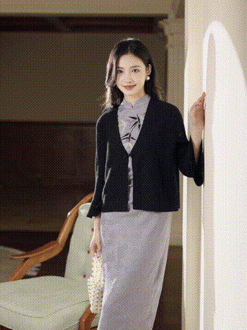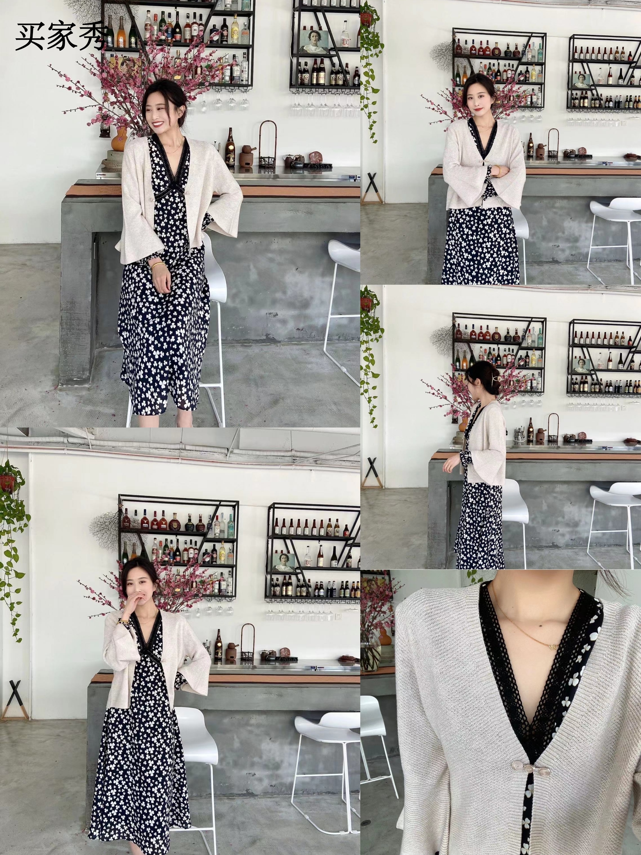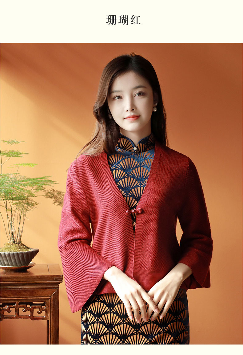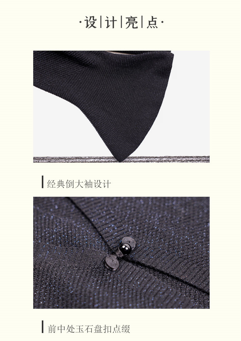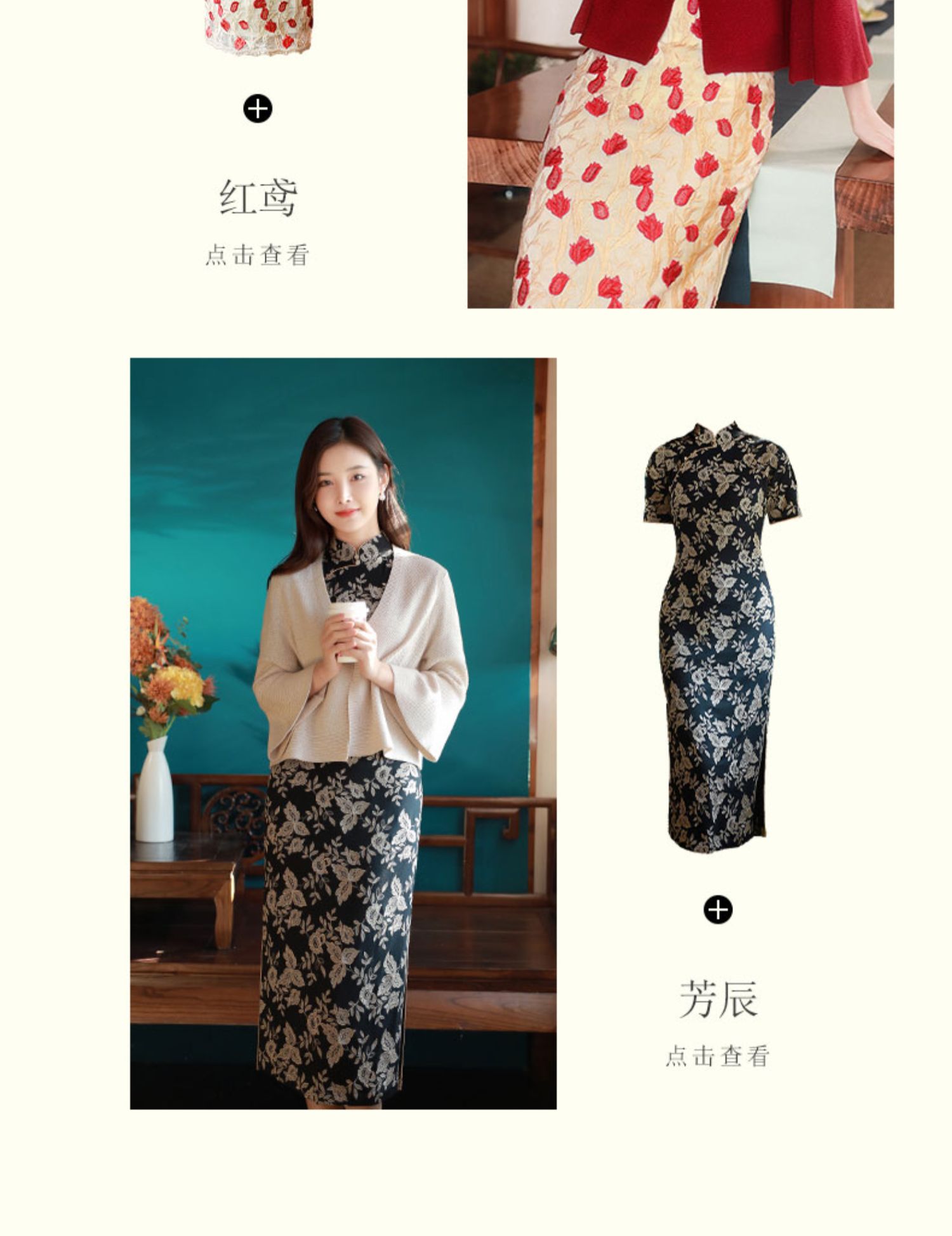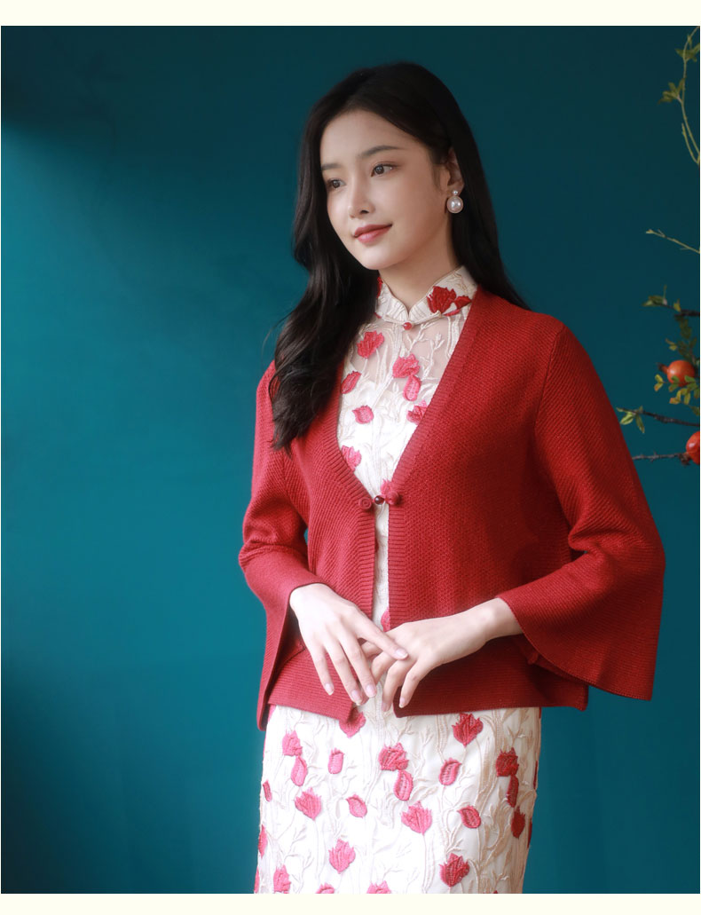 整件版型是A摆造型,搭配修身旗袍、吊带,叠穿营造空间层次感,显瘦飘逸。经典倒大袖,容量大,轻松容纳不同袖型旗袍,前中点缀玉石盘扣,精致复古。