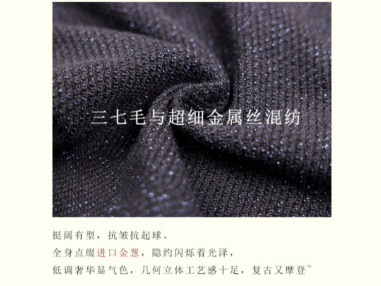 这款针织上衣选用的是三七毛+超细金属丝混纺,抗皱抗起球。全身点缀进口金葱,隐约闪烁着光泽,低调奢华显气色,几何立体工艺感十足,复古又摩登~