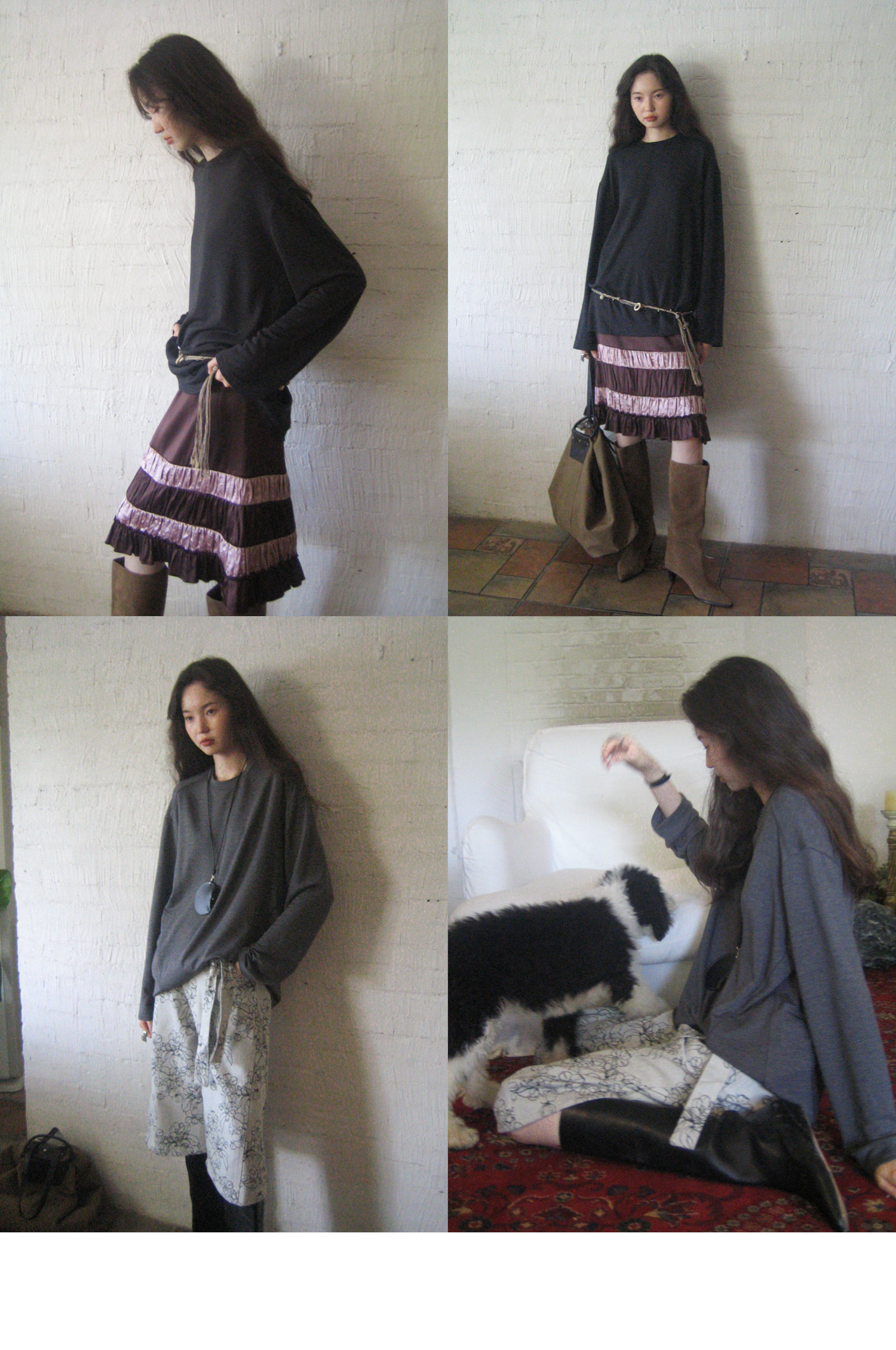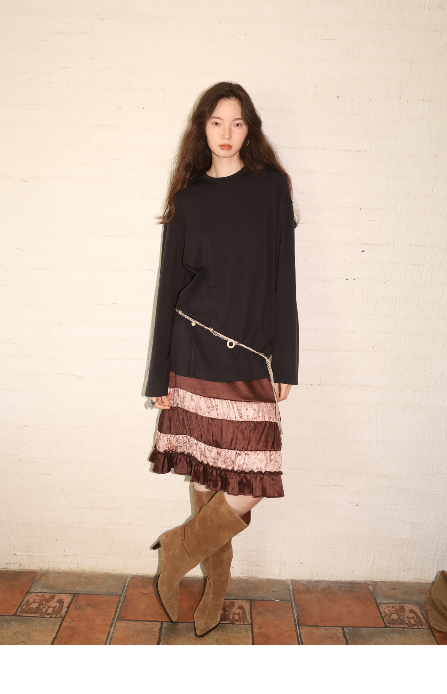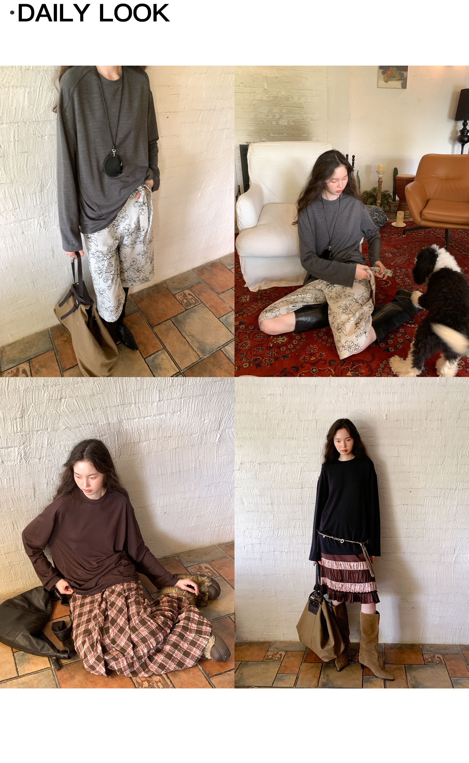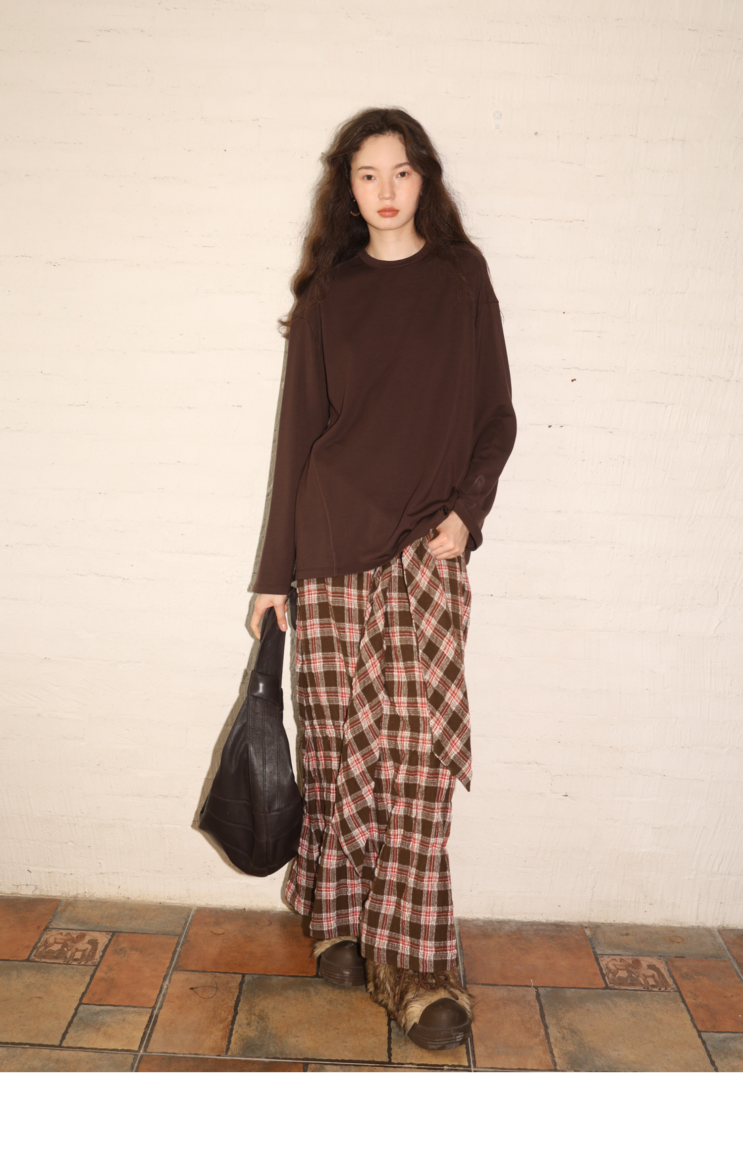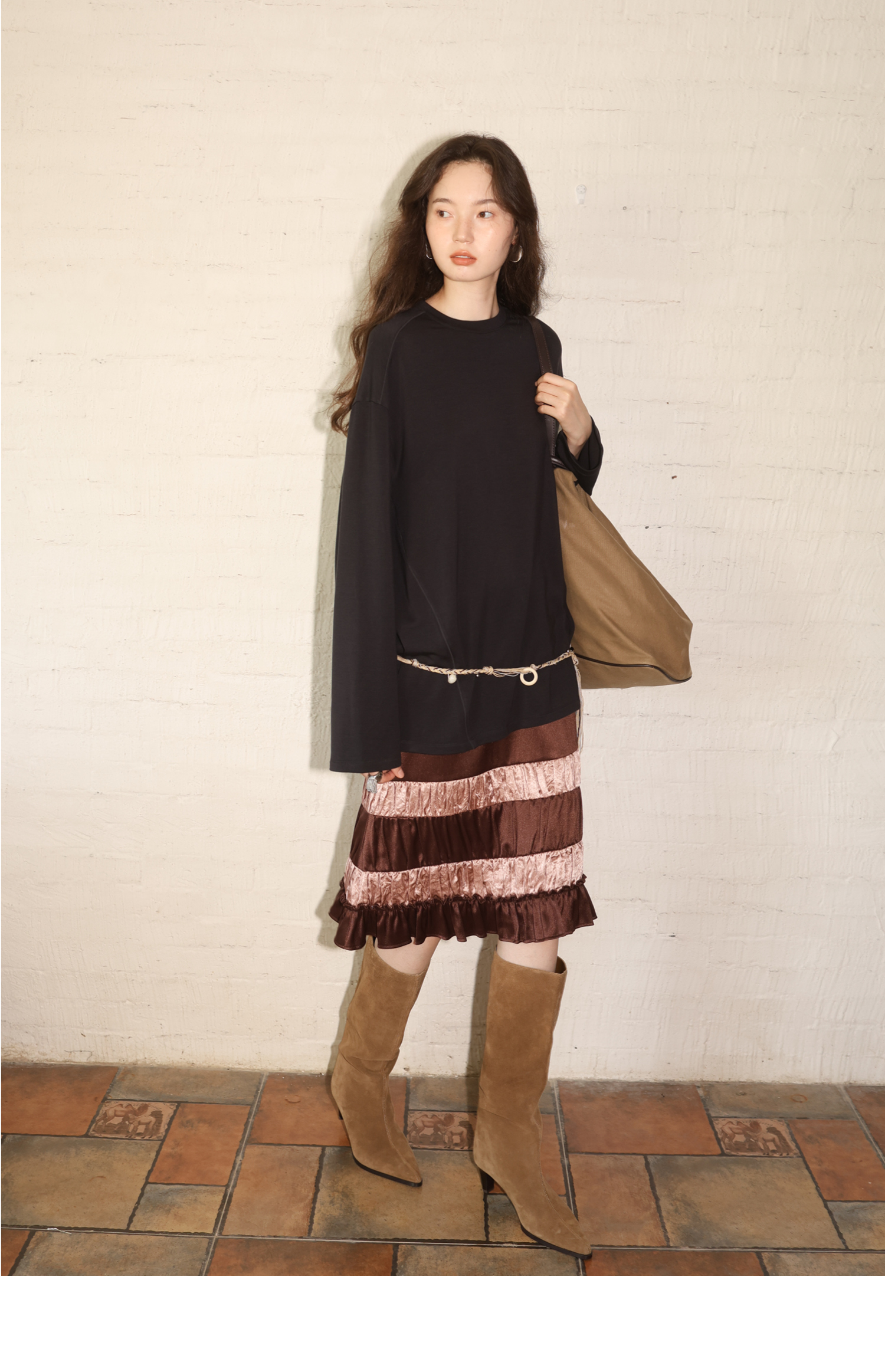 素舶 绵羊毛高弹亲肤双面针织圆领剪裁分割长袖T恤