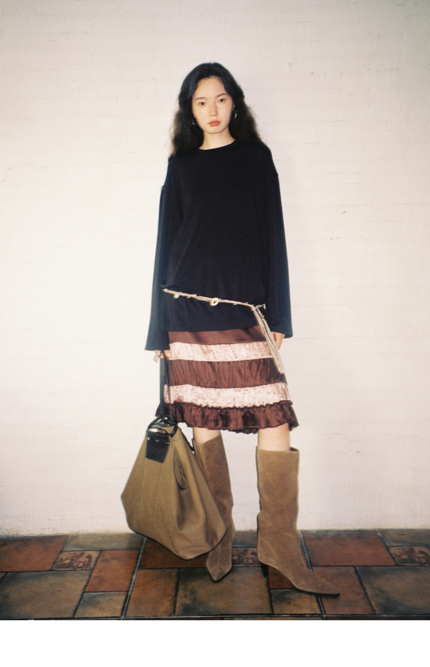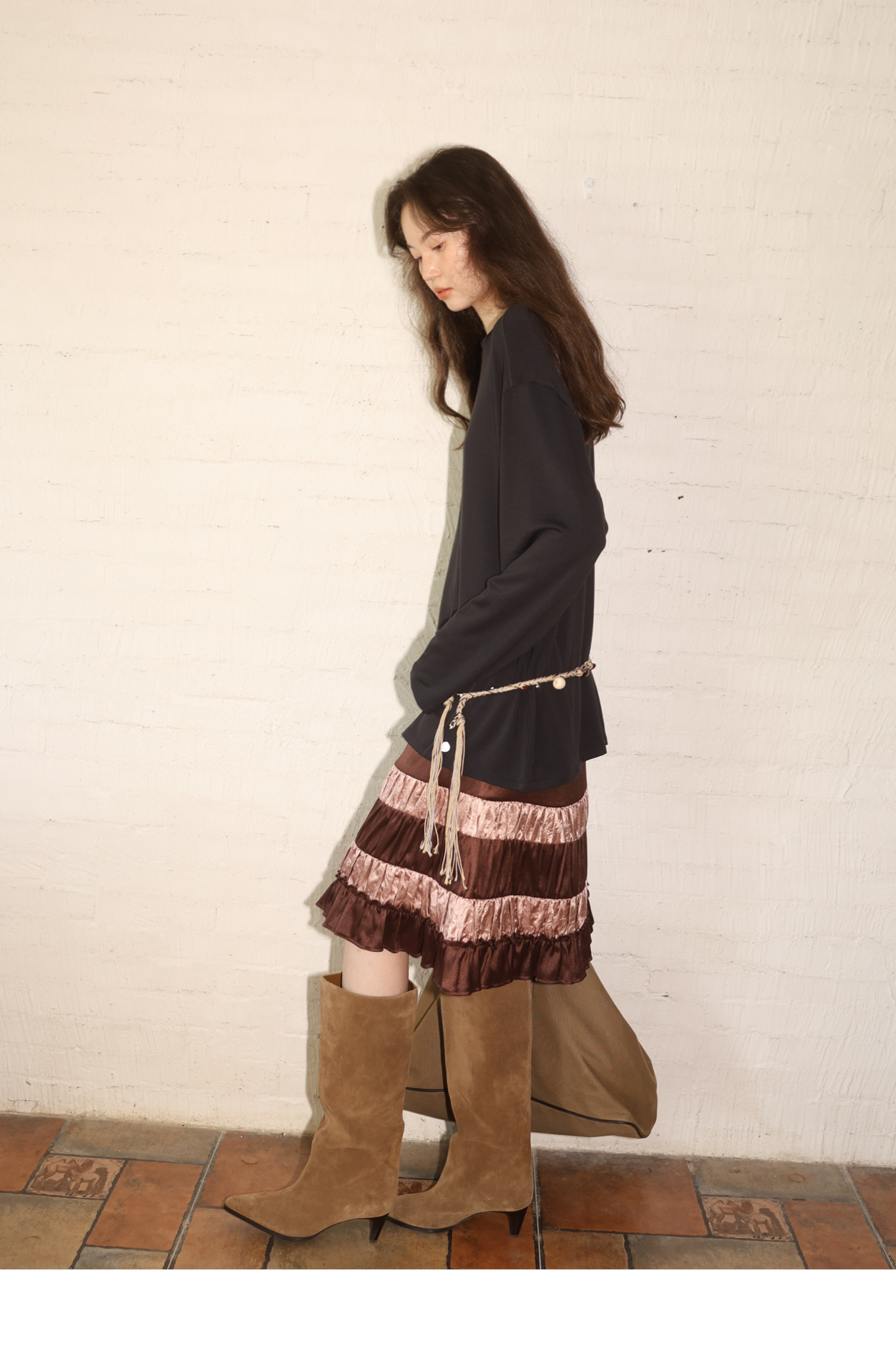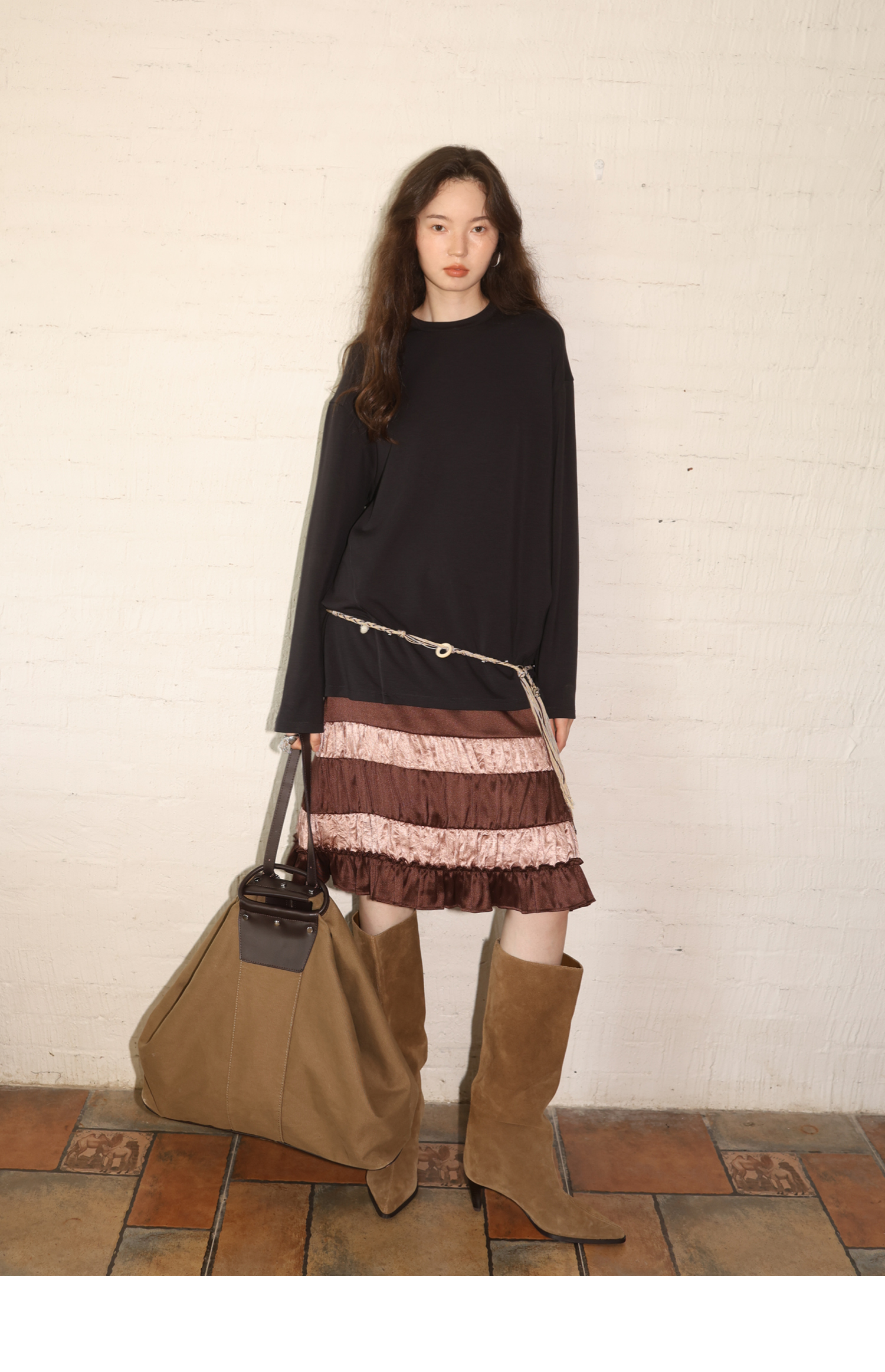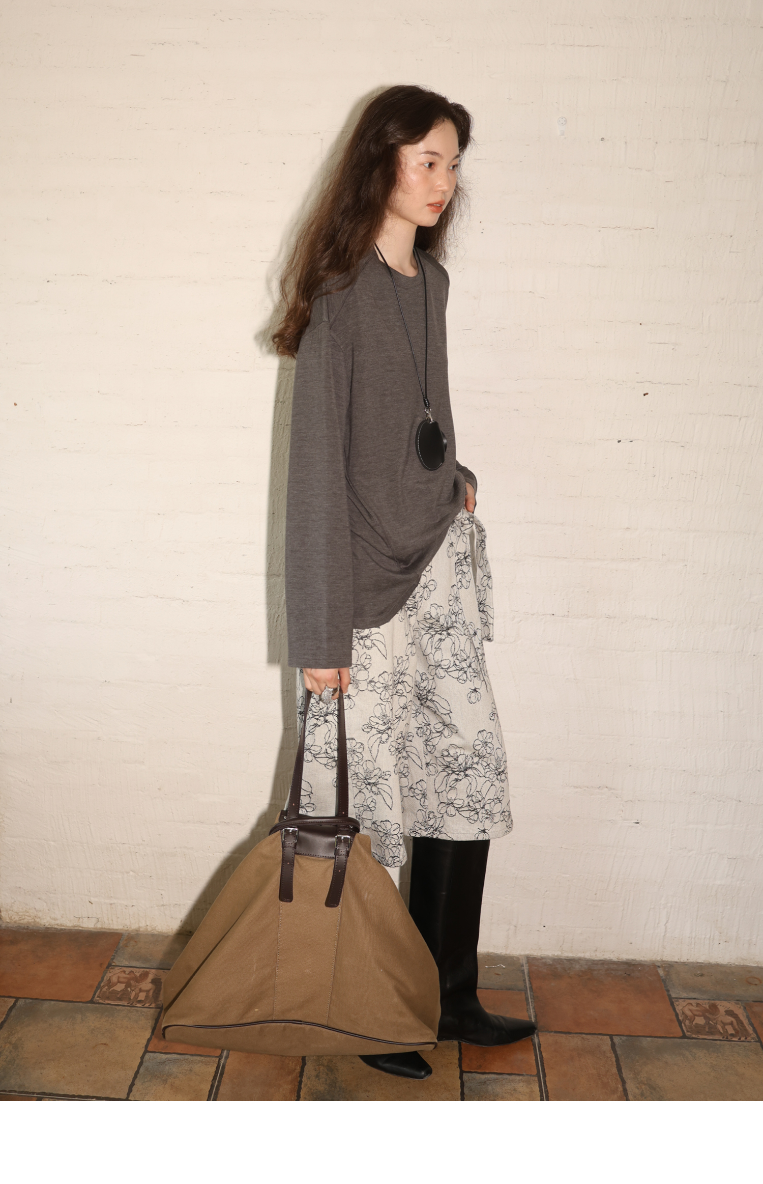 素舶 绵羊毛高弹亲肤双面针织圆领剪裁分割长袖T恤