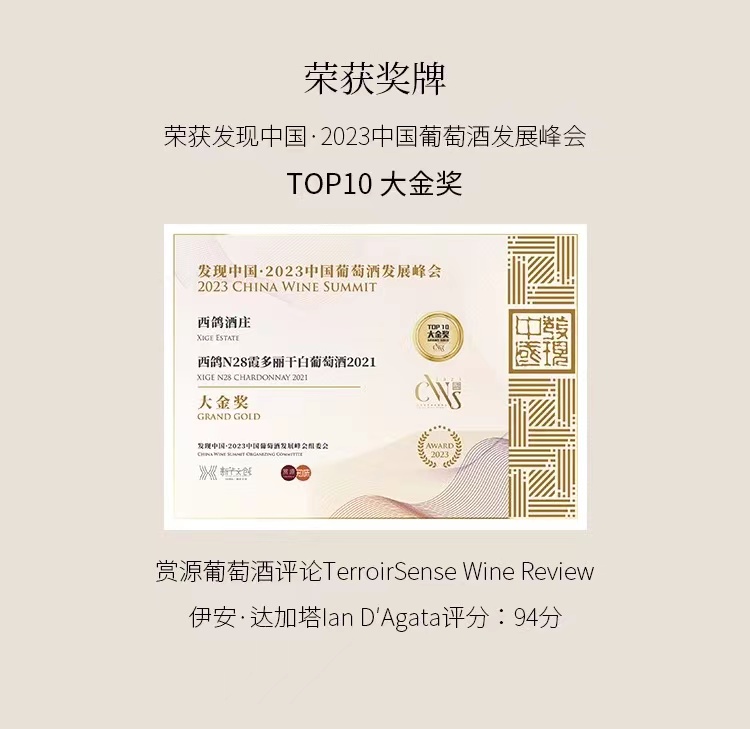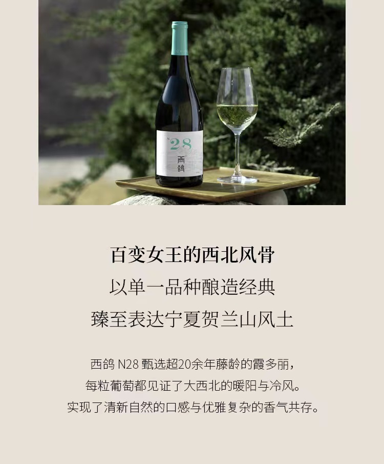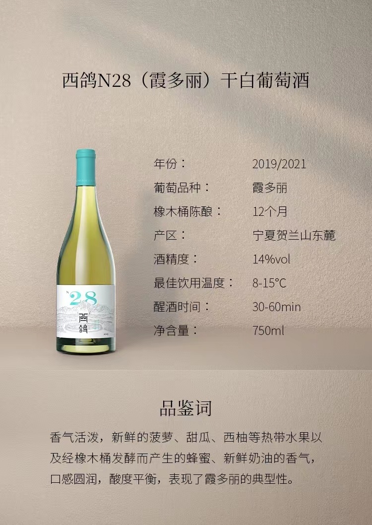 宁夏贺兰山东麓西鸽N.28霞多丽干白葡萄酒 |西鸽酒庄的N28霞多丽干白当选 “中国年度最佳白葡萄酒” “中国最具性价比葡萄酒”