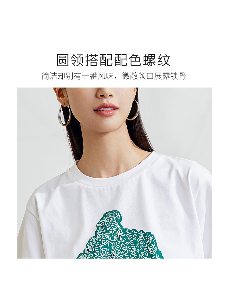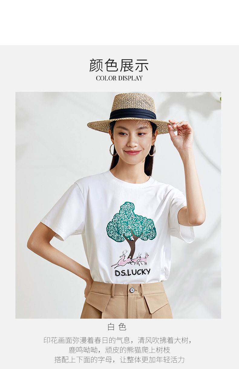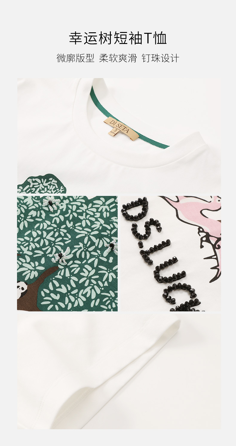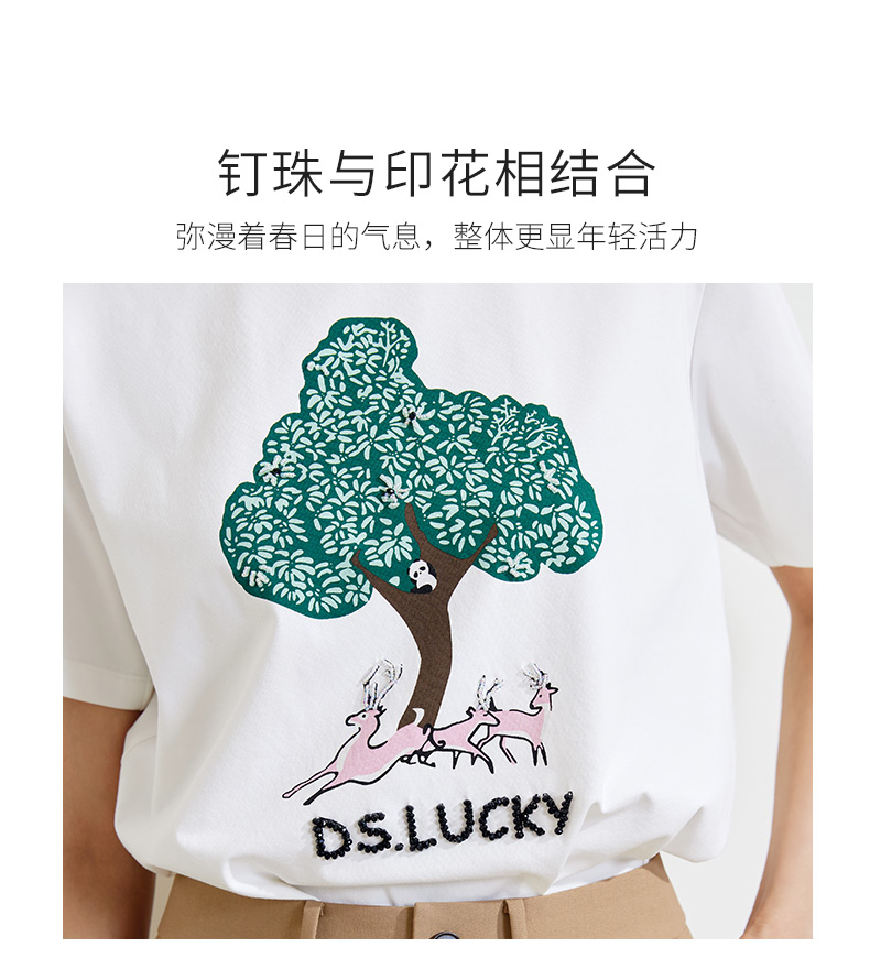玳莎钉珠印花设计感T恤女2024春季新款时尚圆领宽松显瘦短袖上衣 EA32101
