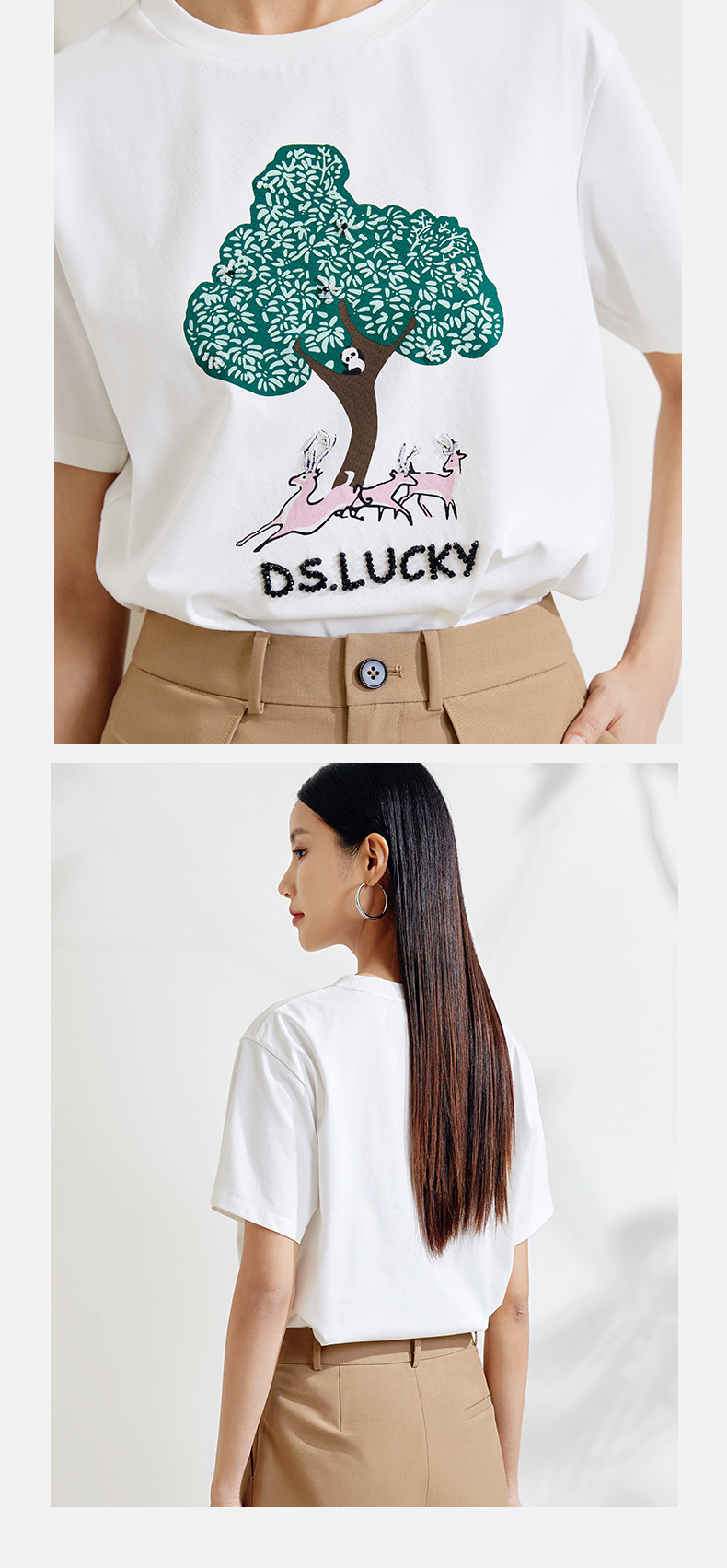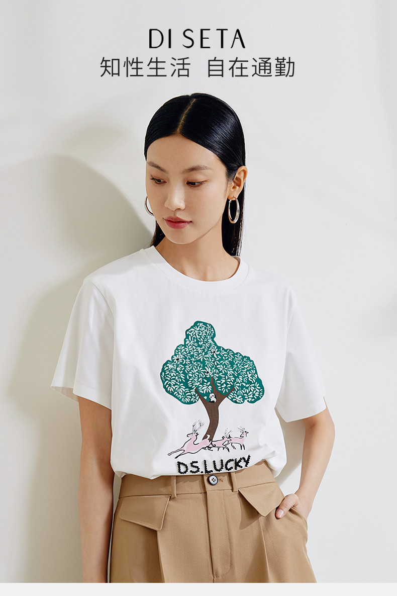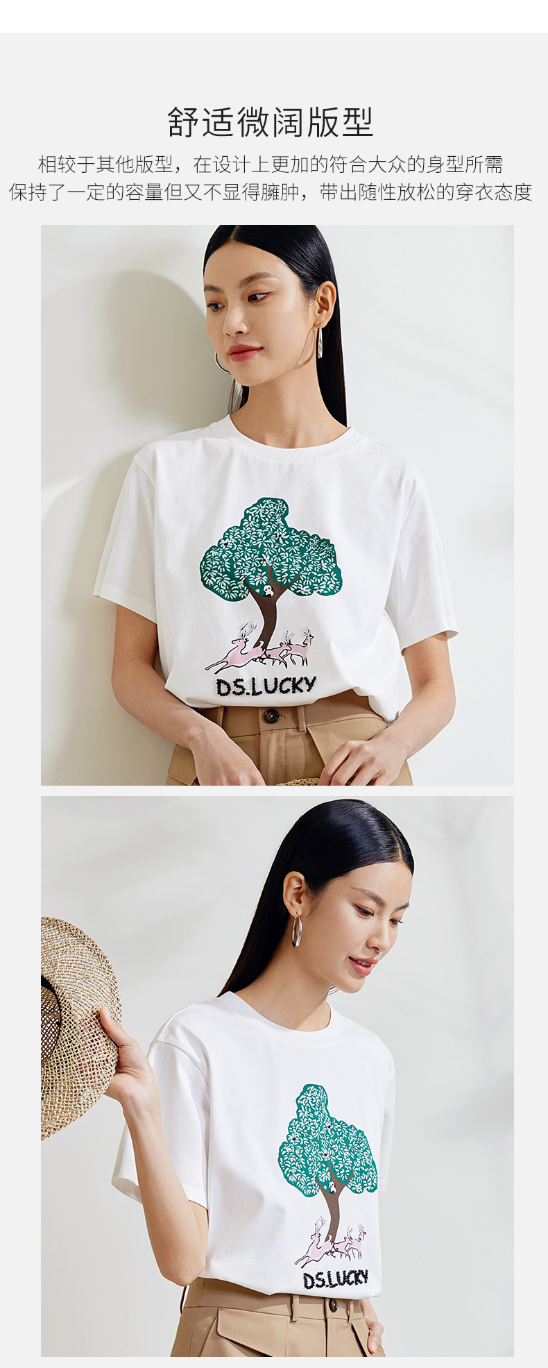 玳莎钉珠印花设计感T恤女2024春季新款时尚圆领宽松显瘦短袖上衣 EA32101