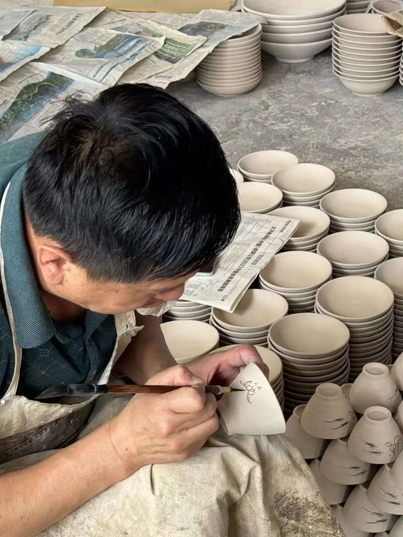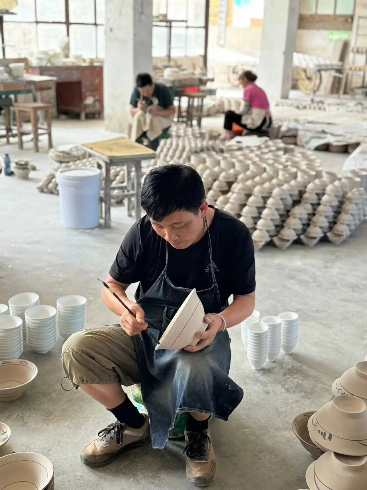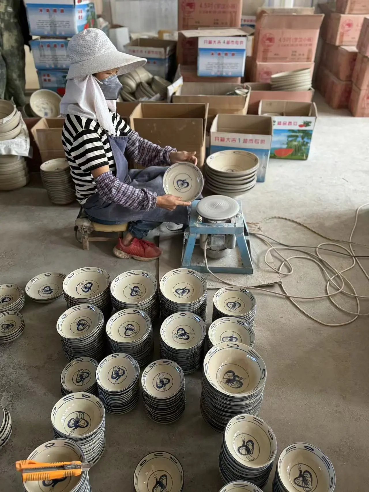和厂里的这些师傅交谈,他们都是本地人,两位绘图的师傅更是祖祖辈辈做碗的,他们就手工画碗就画了几十年,一坐下来就是一天,没有模板,没有样稿,所有的灵魂都在心里,然后通过笔尖表达 或简单或复杂,方圆之间,自有天地