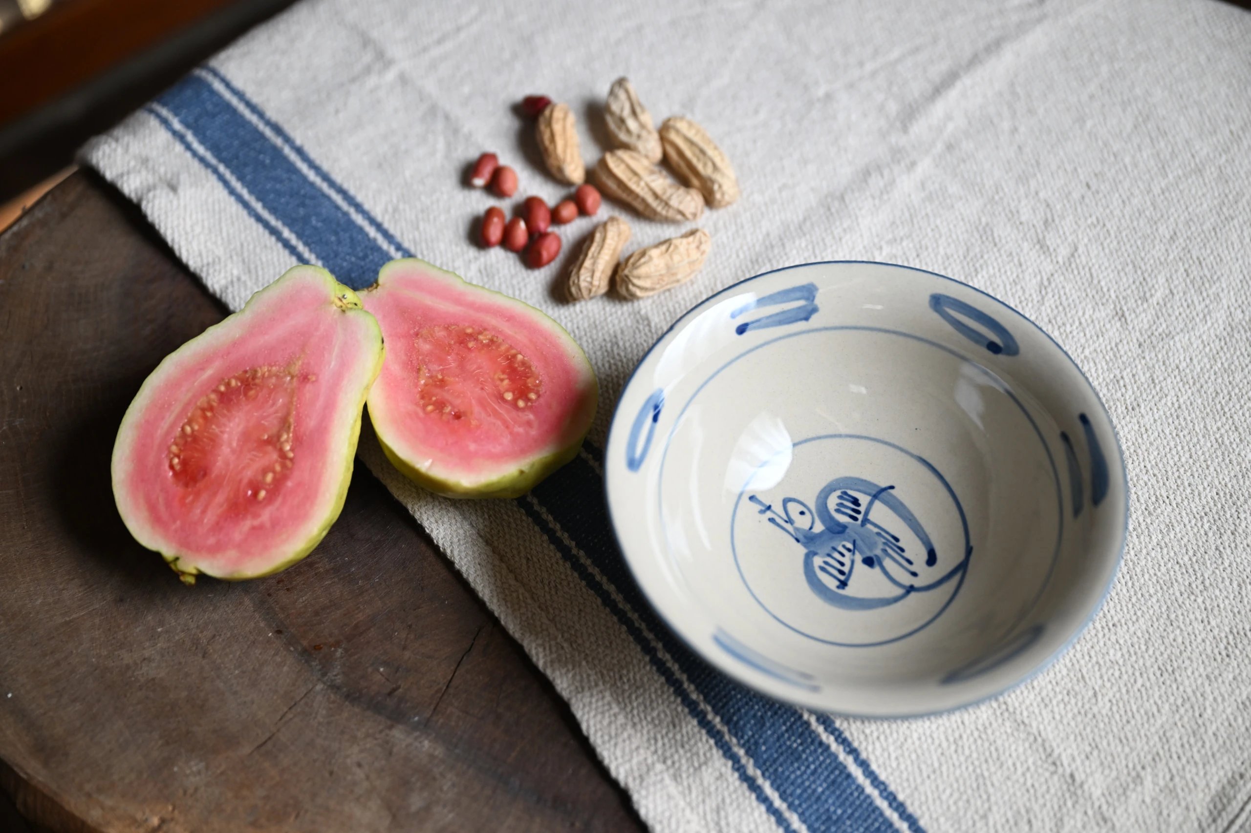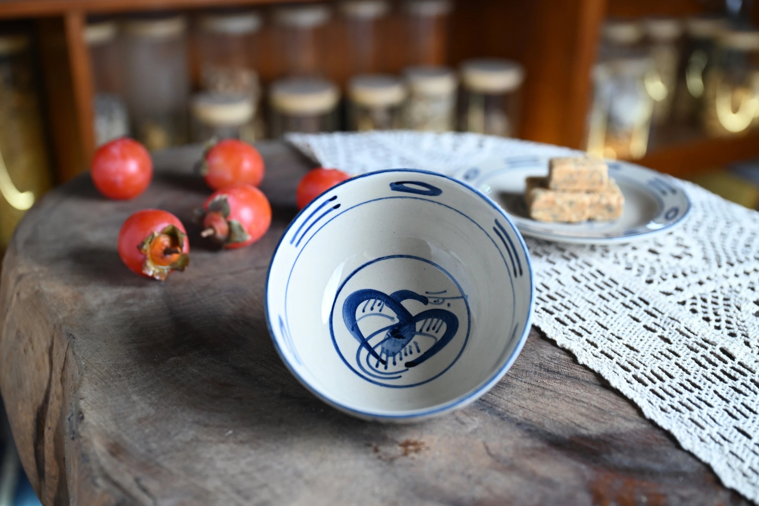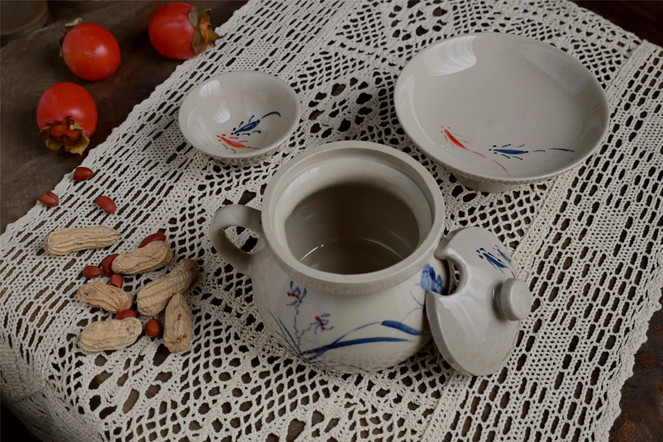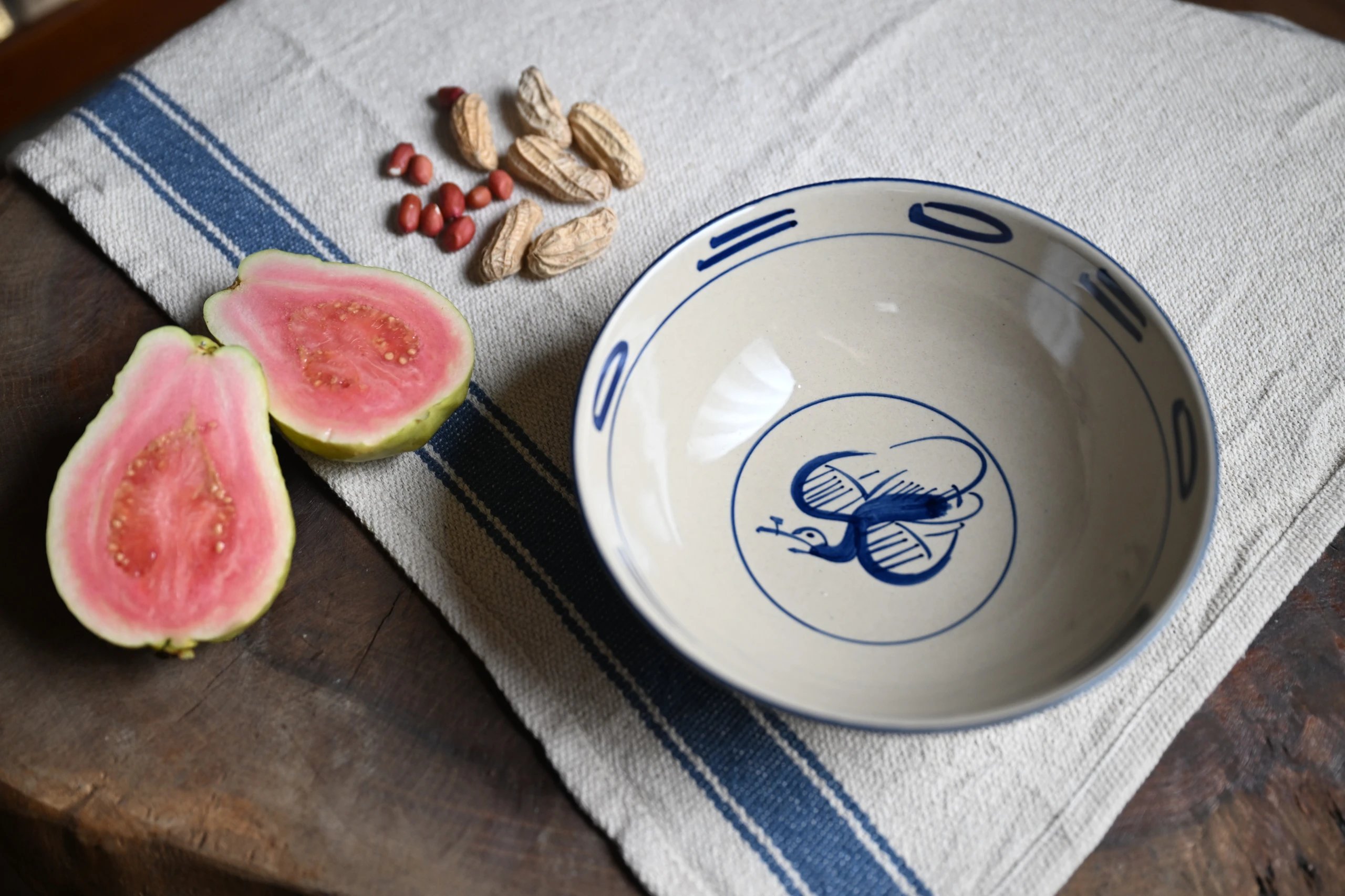 那么这么千好万好的器具,烧制出来是什么模样的呢? 整个系列,师傅们手绘了荷花图案,双鱼图案,仙鹤图案,竹节图案;每一副都蕴藏了美好的寓意。 【仙鹤】:这是最传统的图案,有人说是鸟,有人说是鹤,我更愿意相信它是一只鹤,鹤与”和“谐音, 器具上周围是0=(天地);将食物盛放在天地之间,表达对天地的崇敬与感激,我想这大概就是世界和平 【荷花】:”荷“与”和“谐音,家庭和睦,家和万事兴 【竹节】:淡雅,有节气 【双鱼】:”鱼“与”余“,希望大家年年有余