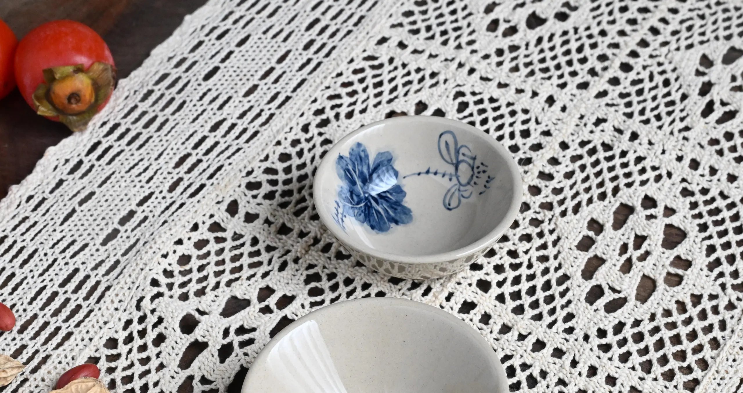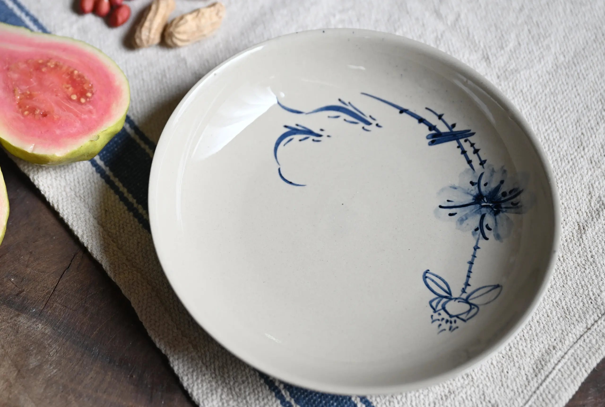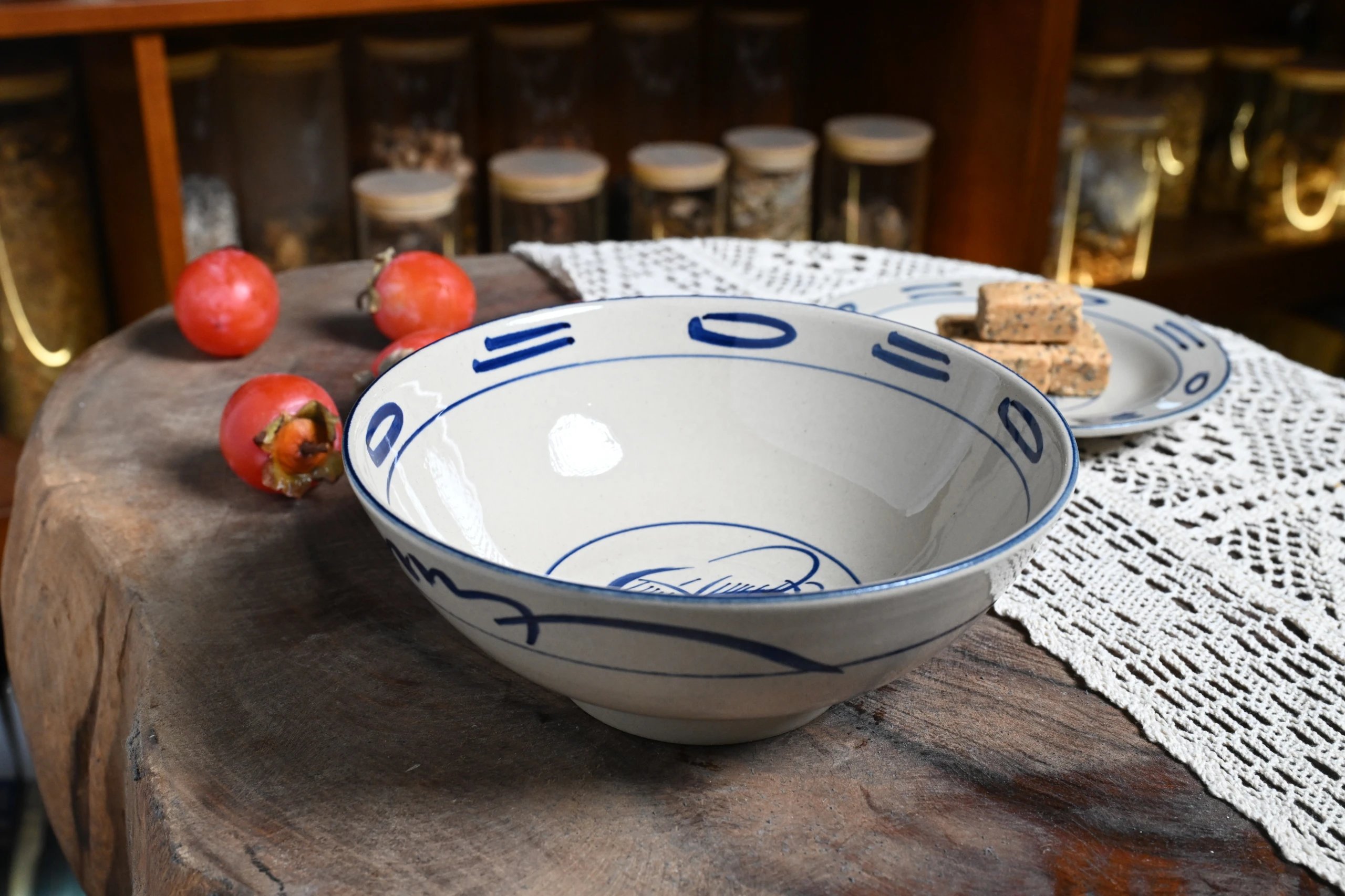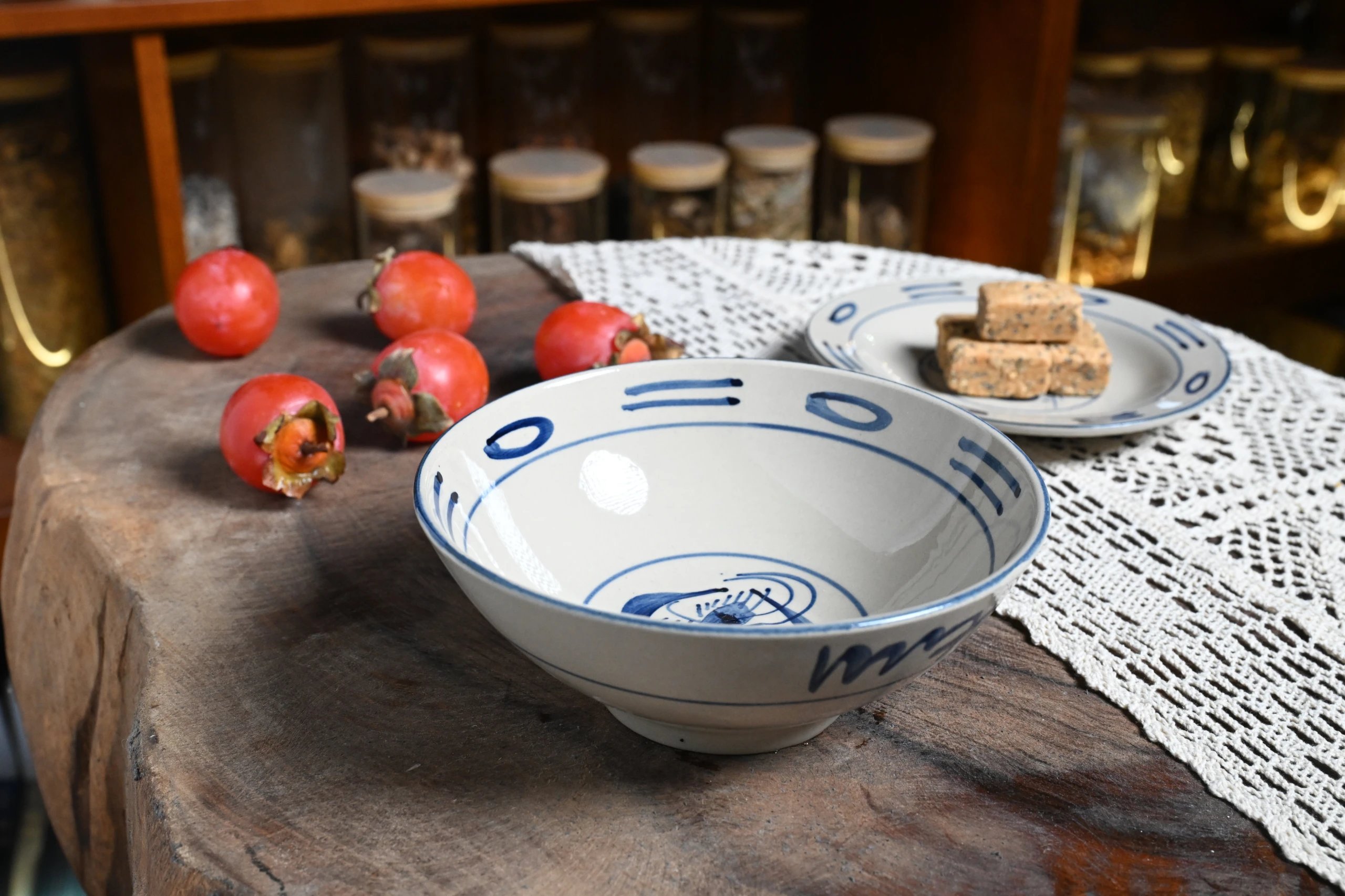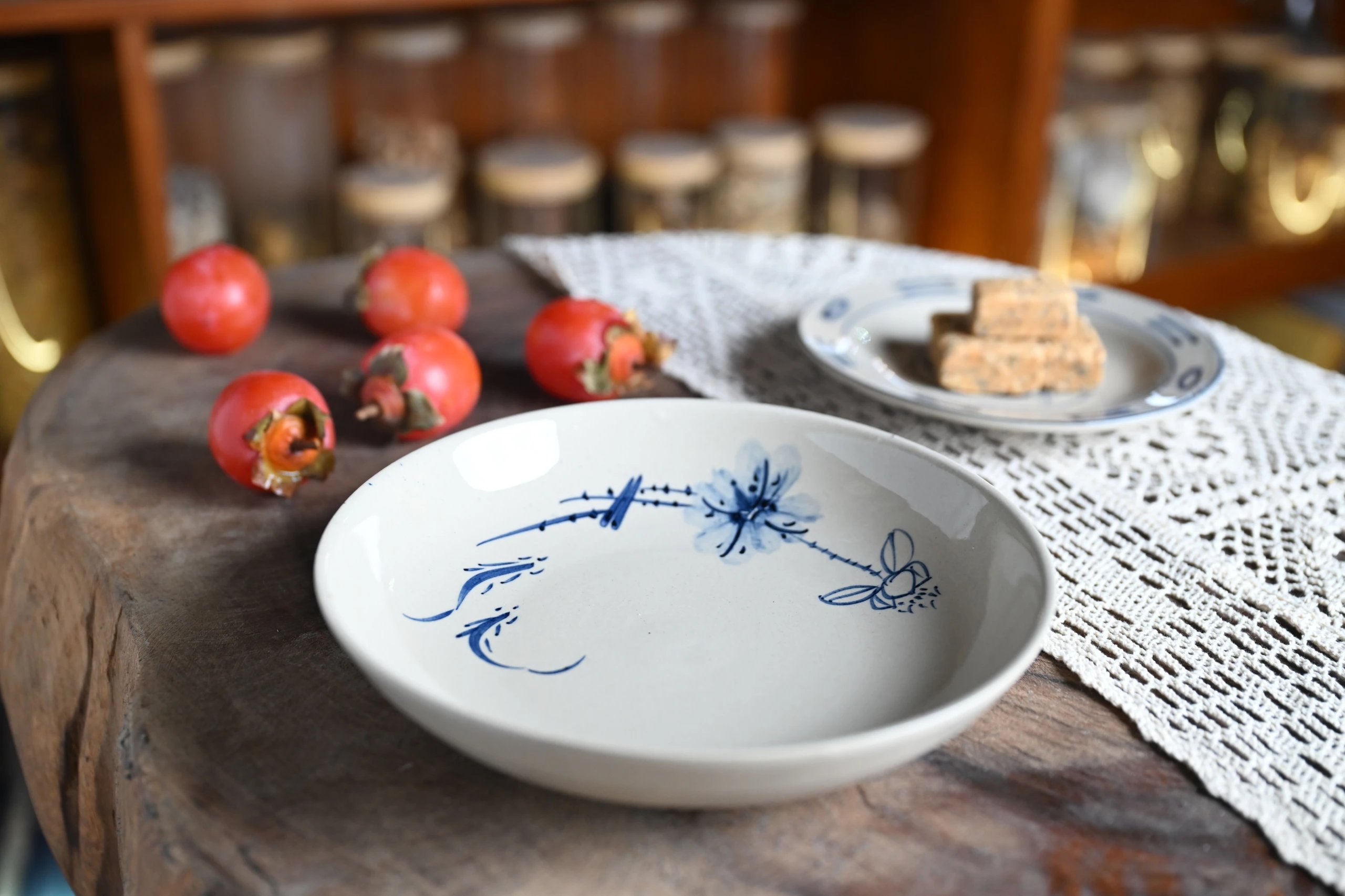 那么这么千好万好的器具,烧制出来是什么模样的呢? 整个系列,师傅们手绘了荷花图案,双鱼图案,仙鹤图案,竹节图案;每一副都蕴藏了美好的寓意。 【仙鹤】:这是最传统的图案,有人说是鸟,有人说是鹤,我更愿意相信它是一只鹤,鹤与”和“谐音, 器具上周围是0=(天地);将食物盛放在天地之间,表达对天地的崇敬与感激,我想这大概就是世界和平 【荷花】:”荷“与”和“谐音,家庭和睦,家和万事兴 【竹节】:淡雅,有节气 【双鱼】:”鱼“与”余“,希望大家年年有余