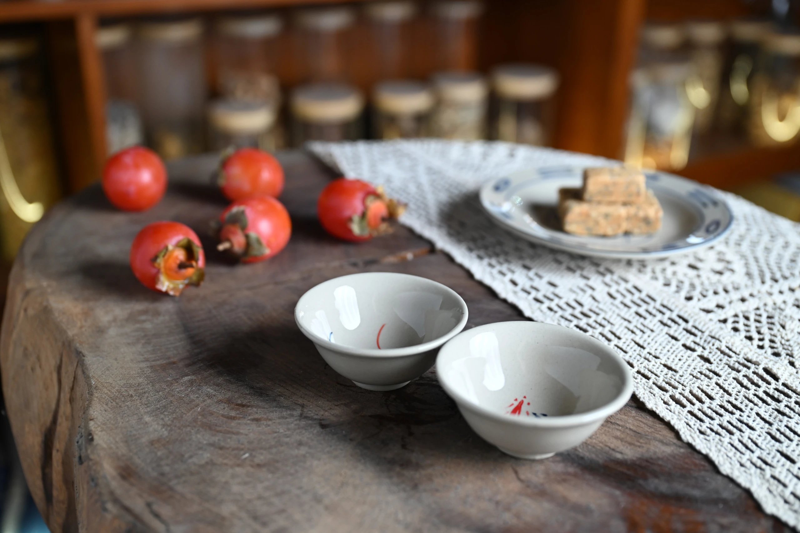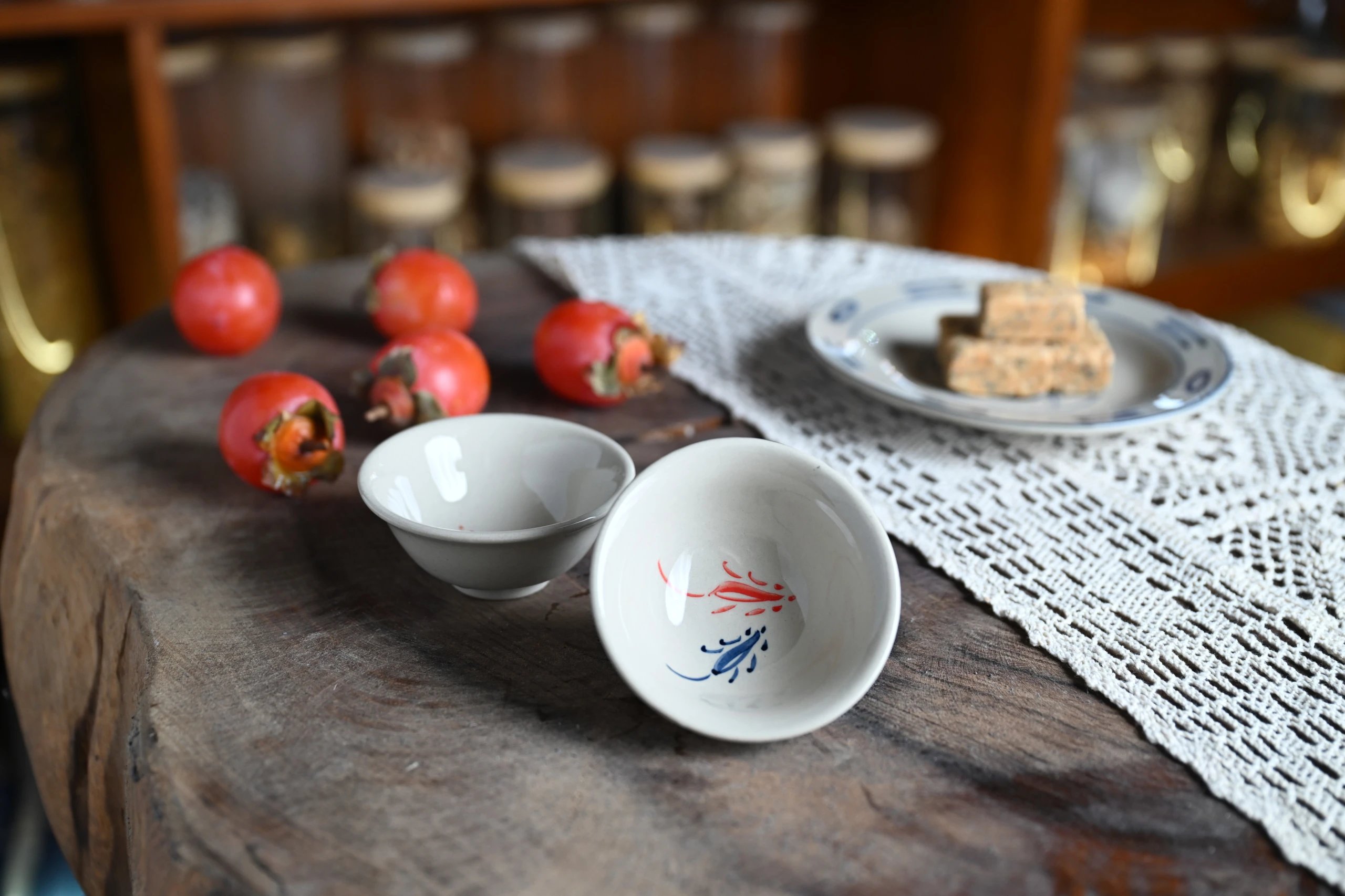 (3)、3寸小茶碗(双鱼图案) 尺寸:杯口直径7.5cm*高3.4cm;容量约50ml 使用场景推荐:茶杯,小白酒杯