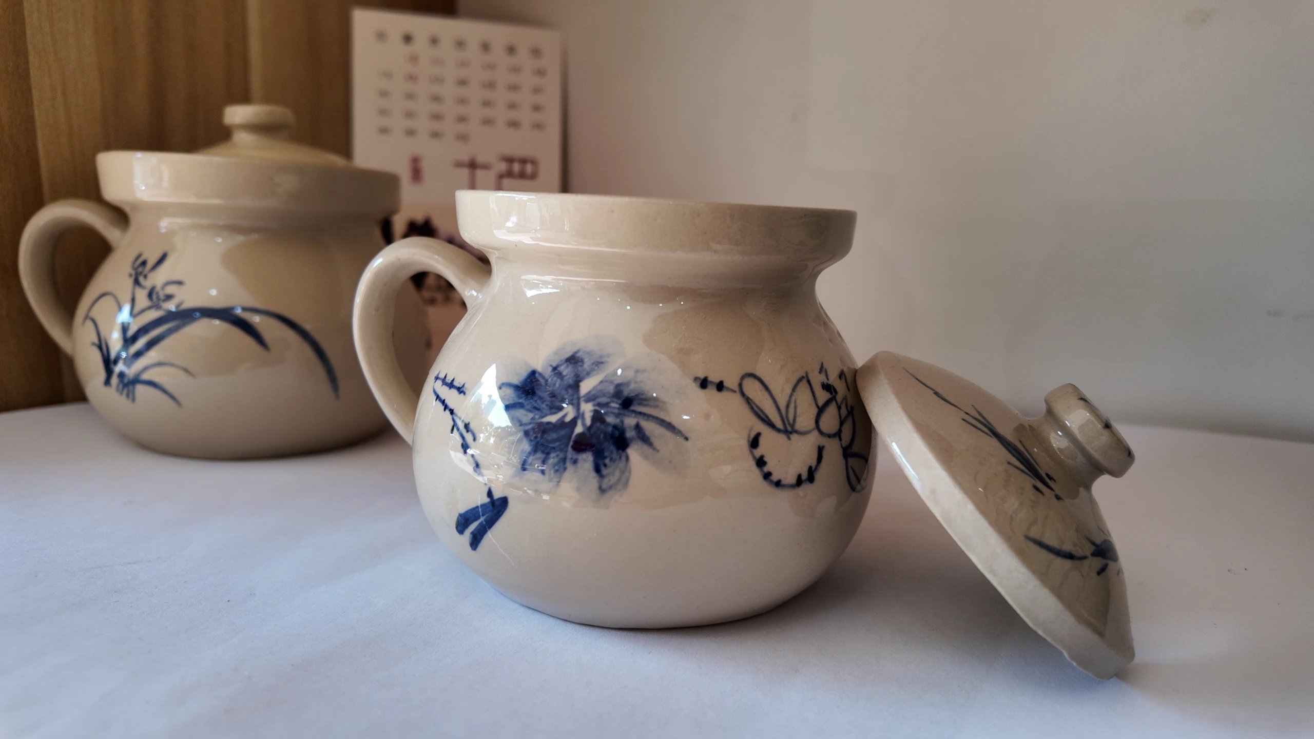 (1)、小胖罐(调料罐)(兰花图案/荷花图案) ***尺寸:罐口口径9cm,罐身高9cm,容量约410ml ***使用场景推荐:盐罐、油辣椒、早点帽子、肉酱 ***特点:陶罐适宜储存食物,防潮 ***重要提示:由于罐盖和罐身分开烧制,导致颜色略微不一致。切记,不可用明火。
