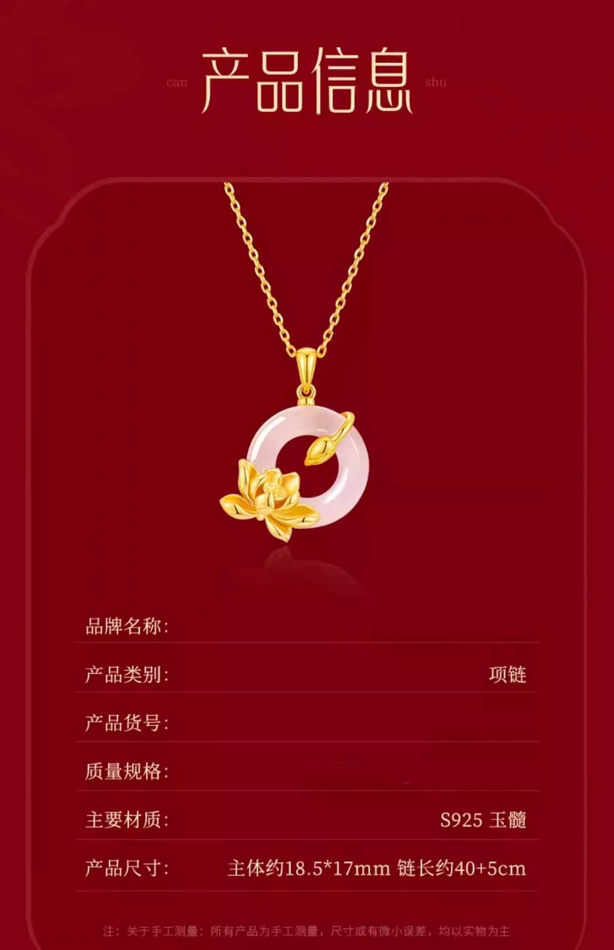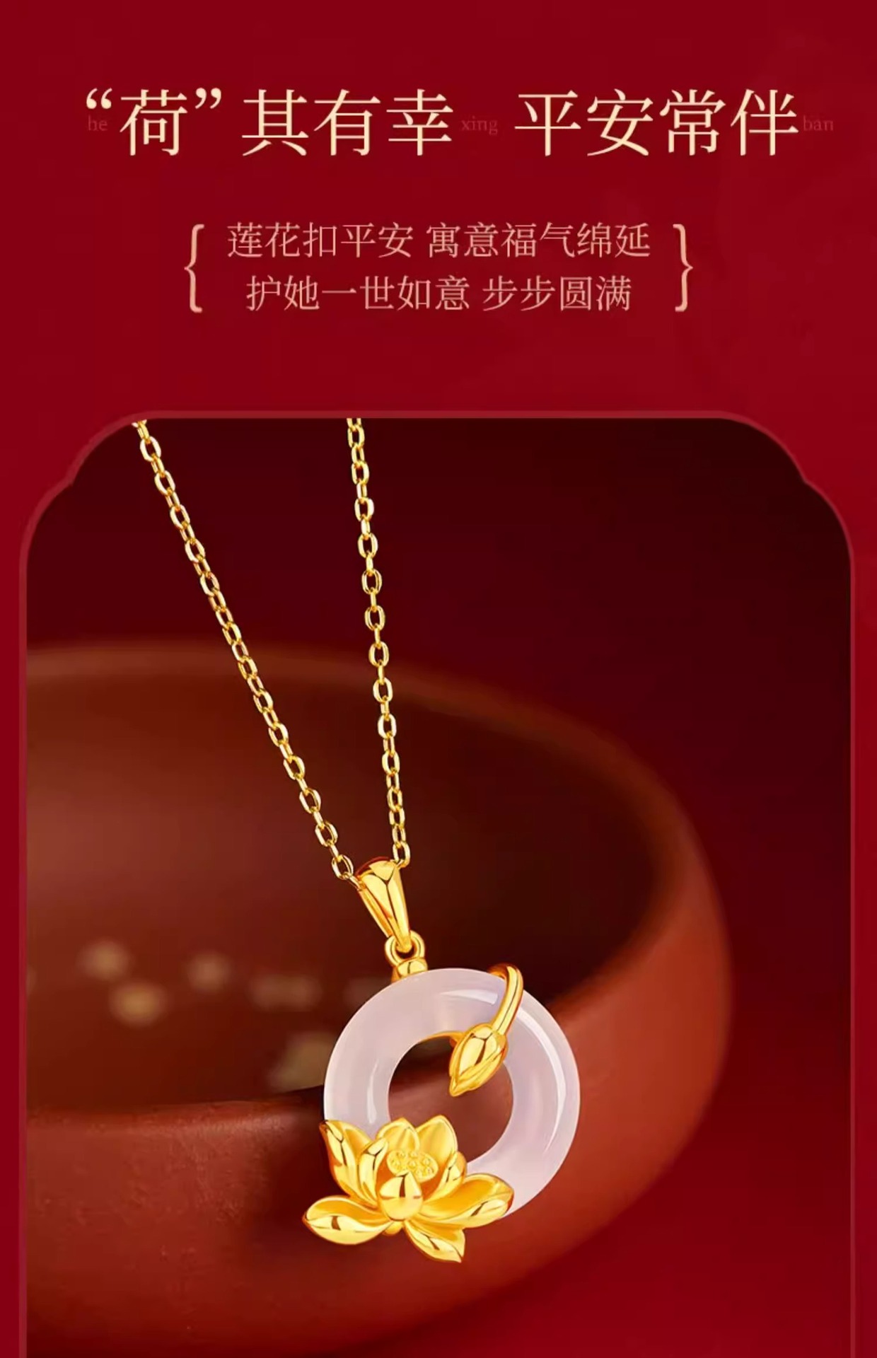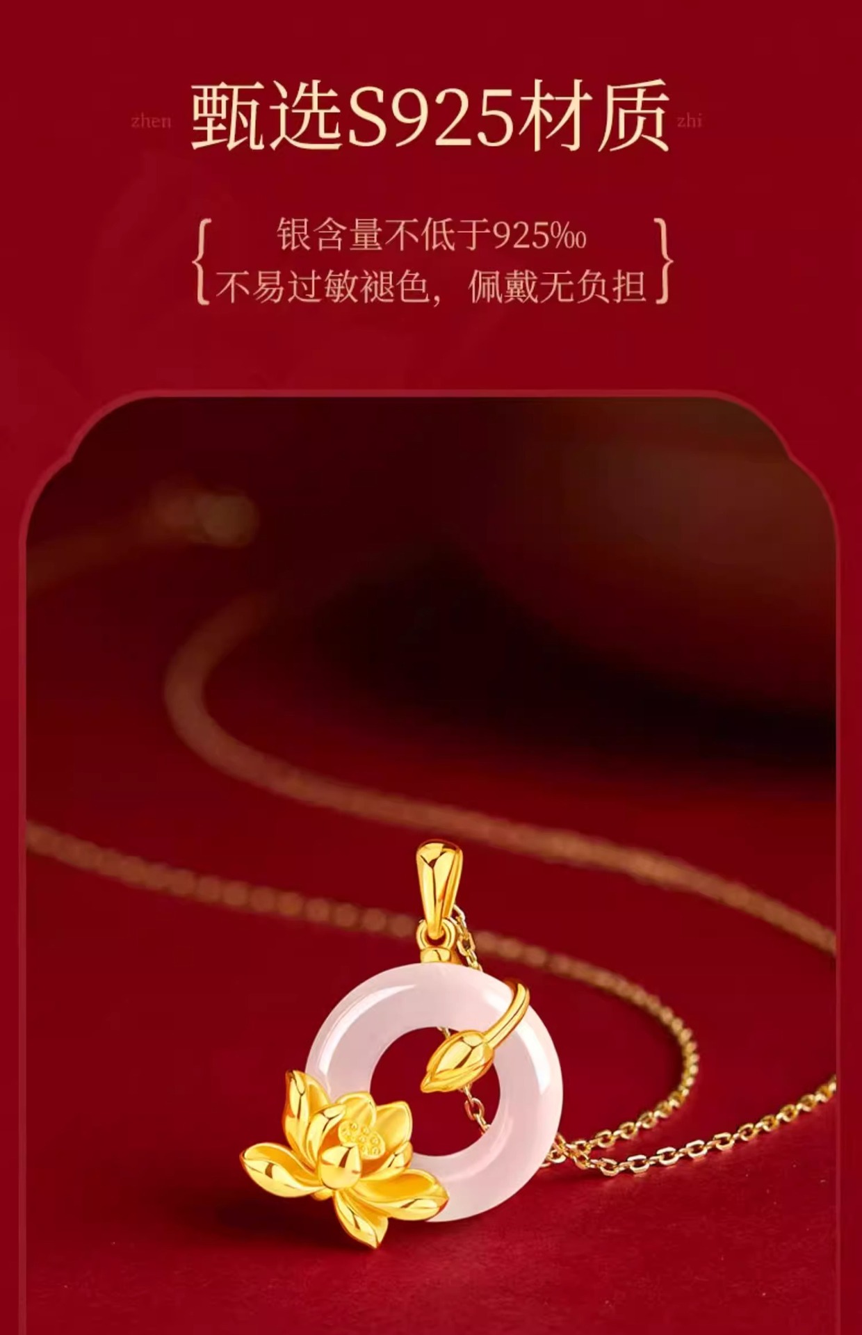 【母亲节礼物】六鑫珠宝 荷塘月色s925纯银平安扣项链 国潮新中式玉髓荷花吊坠 送妈妈礼物
