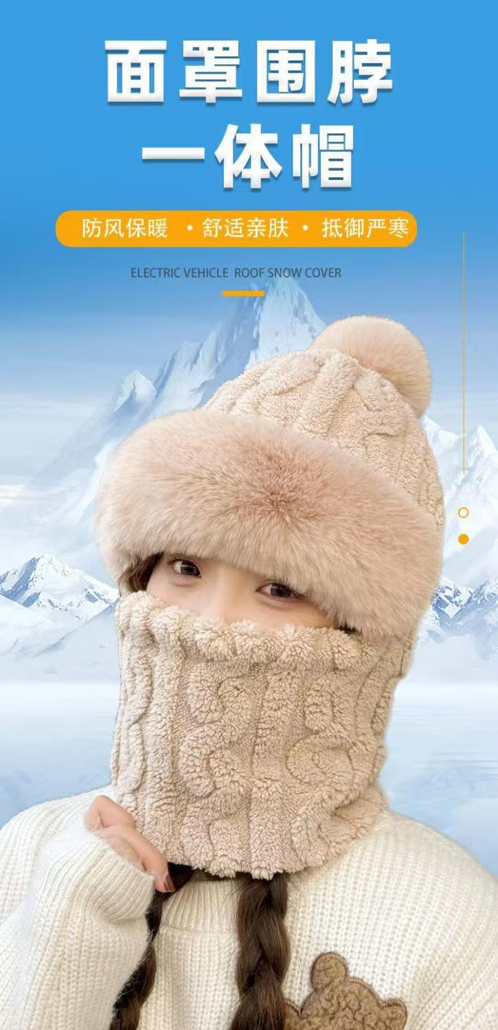 帽子围脖一体女冬2025新款加绒加厚骑车防风防寒电动车保暖套头帽