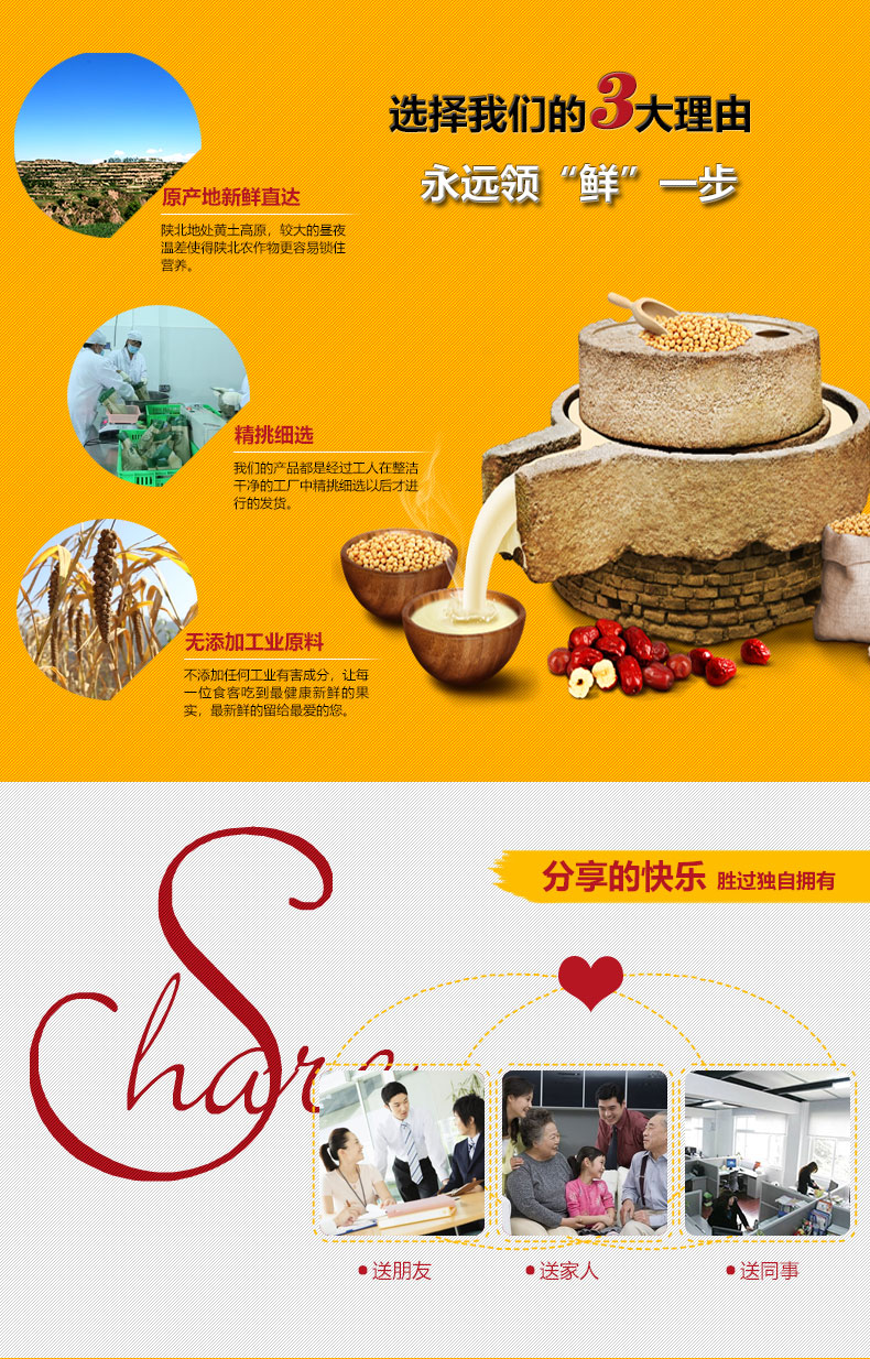 黄土情、真生活 建立苹果、红枣、小米及杂粮种植基地,通过自主专营、电商、超市、批发等渠道宣传推广延安地方产品,努力将延安的特色农产品、绿色食品、民间文化艺术产品推向全国市场