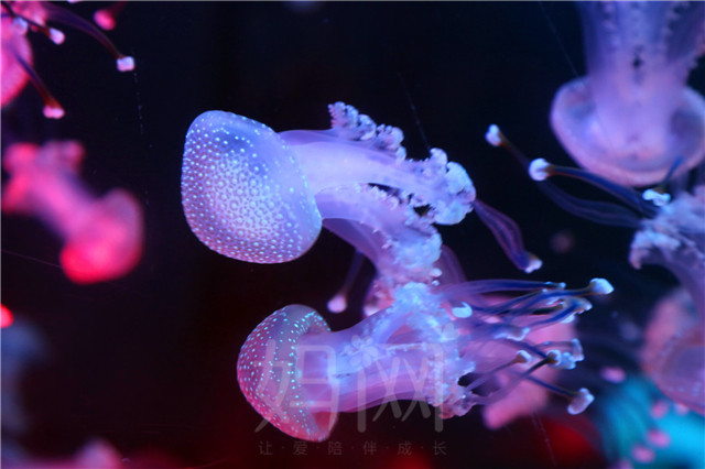 如梦似幻的海月水母、千姿百态的黑星海刺舒展着长长的触手,张弛有度,婀娜多姿,在光与影的交错中如水中精灵般翩翩起舞。