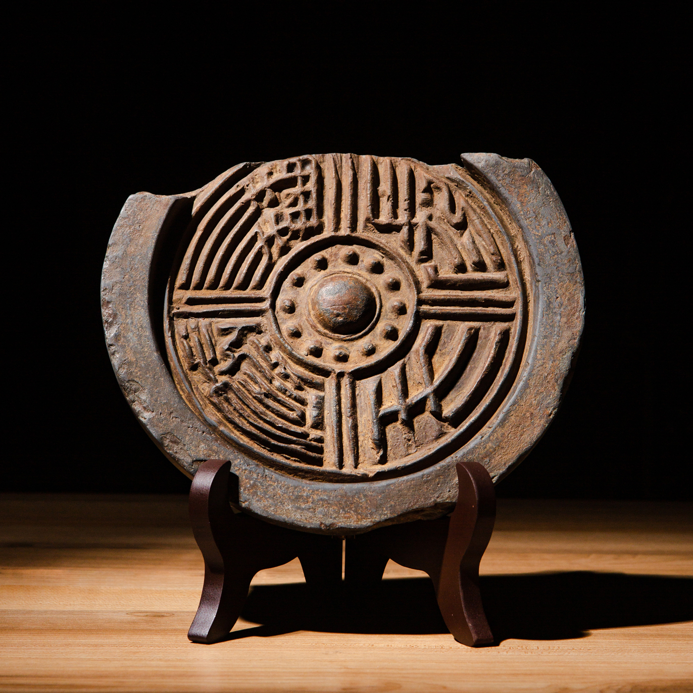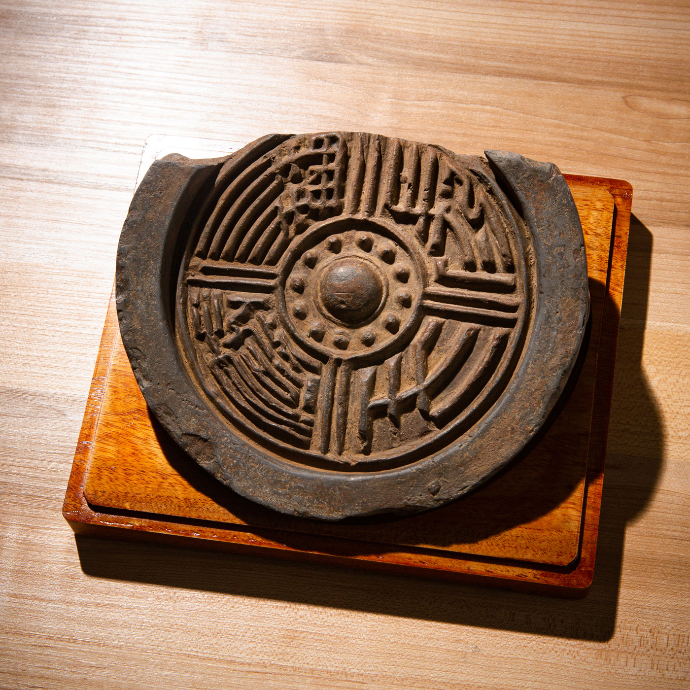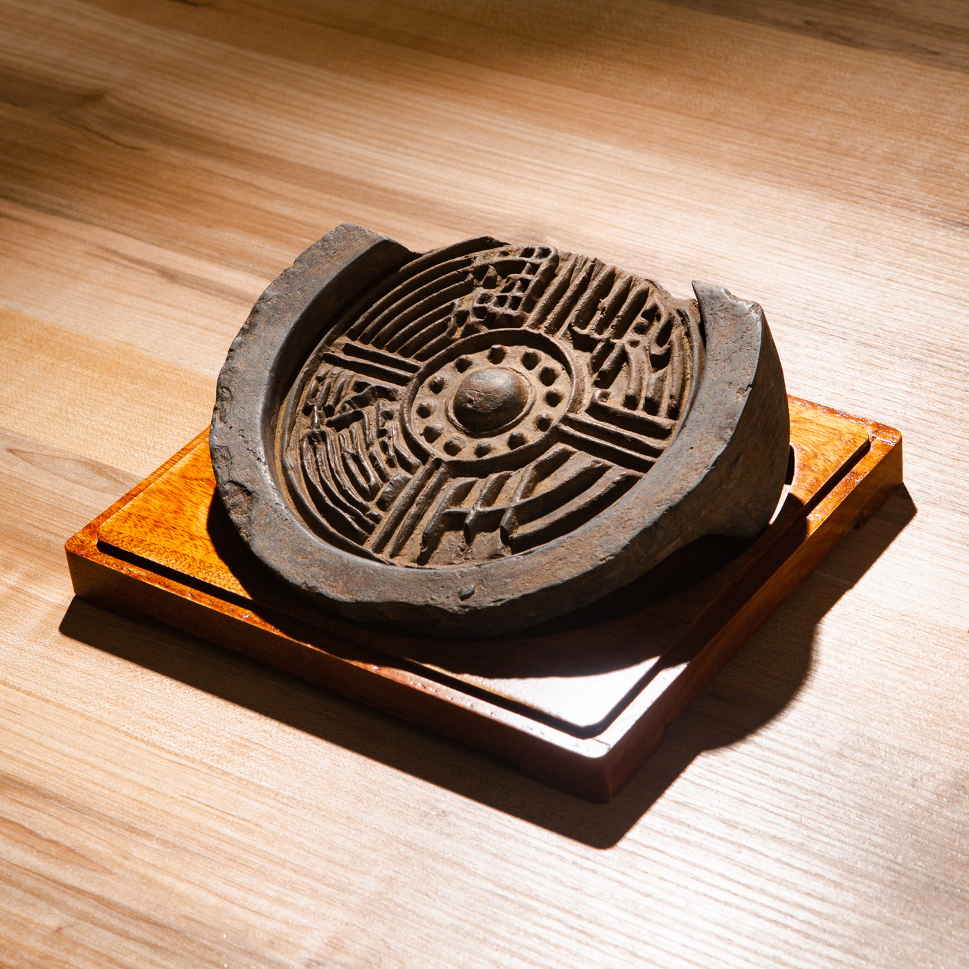 汉代“长生无极”瓦当制砚。其文字精美古拙,字口清晰有力度,胎质坚实细腻,整体呈现古朴之气息,且配有手工精制刻字木盒。