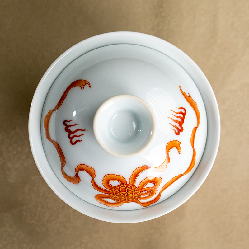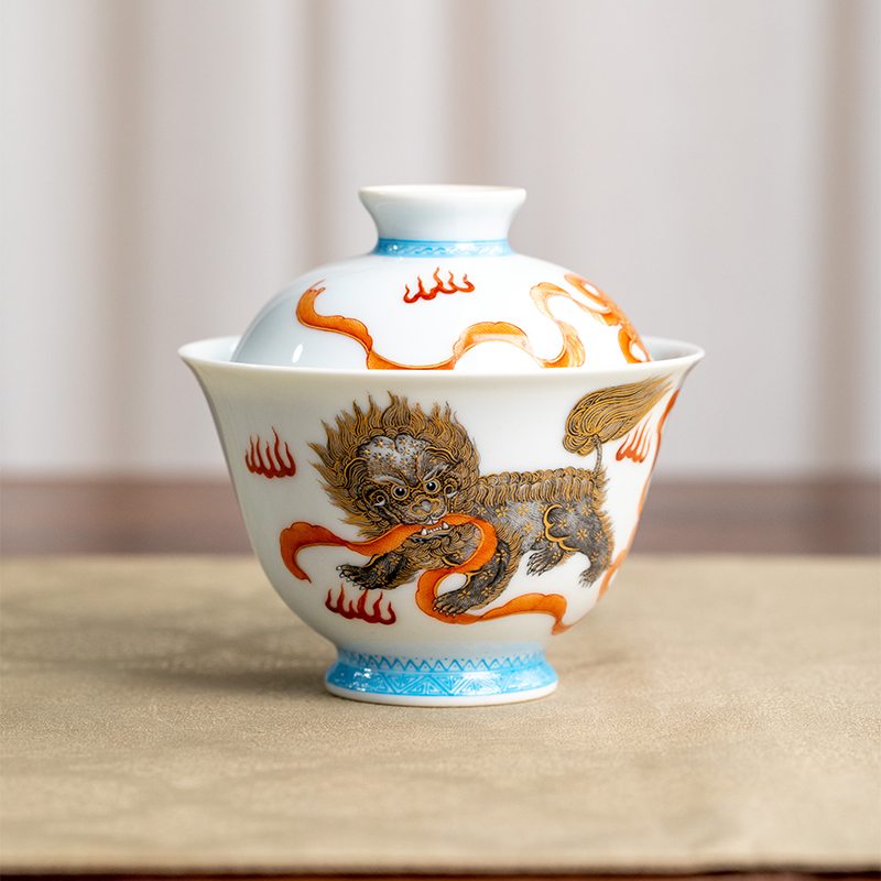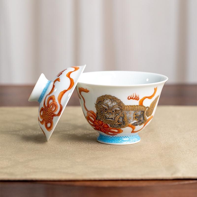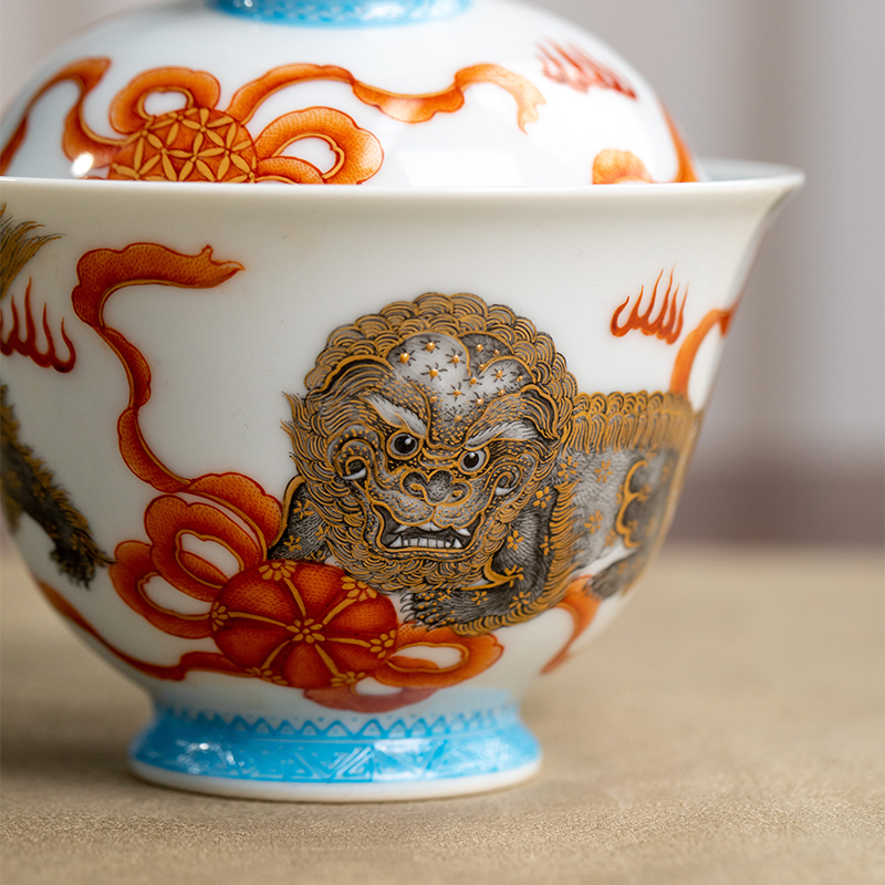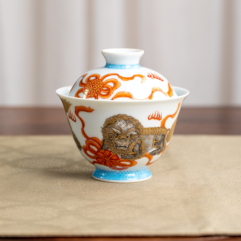 一儒堂珐琅料边墨彩描金双狮盖碗