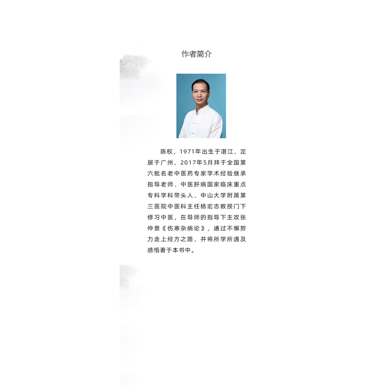 陈权,1971年出生于湛江,定居于广州,为家人苦疾不惑之年拜师研习中医,师承于全国第六批老中医药专家学术经验指导老师、广东省名中医、中山大学博士后导师、国家临床重点专科中医肝病学科带头人、中山大学附属第三院中医科大科主任杨宏志教授。
