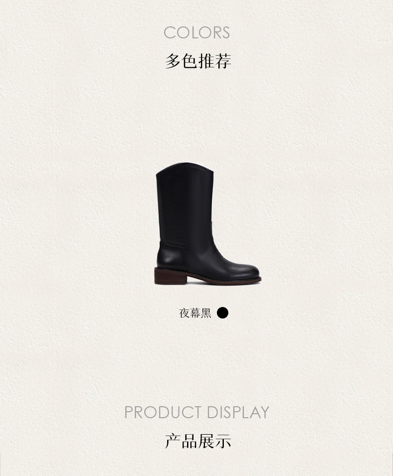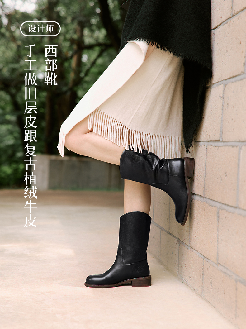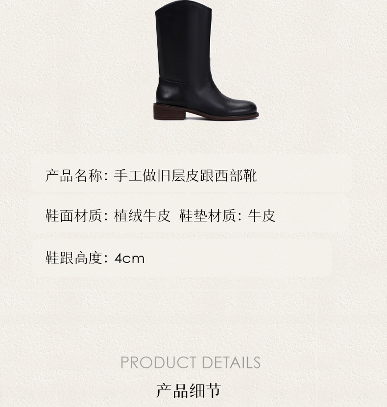 heelz设计师手工鞋履 |手工做旧层皮跟复古植绒牛皮西部靴 4公分