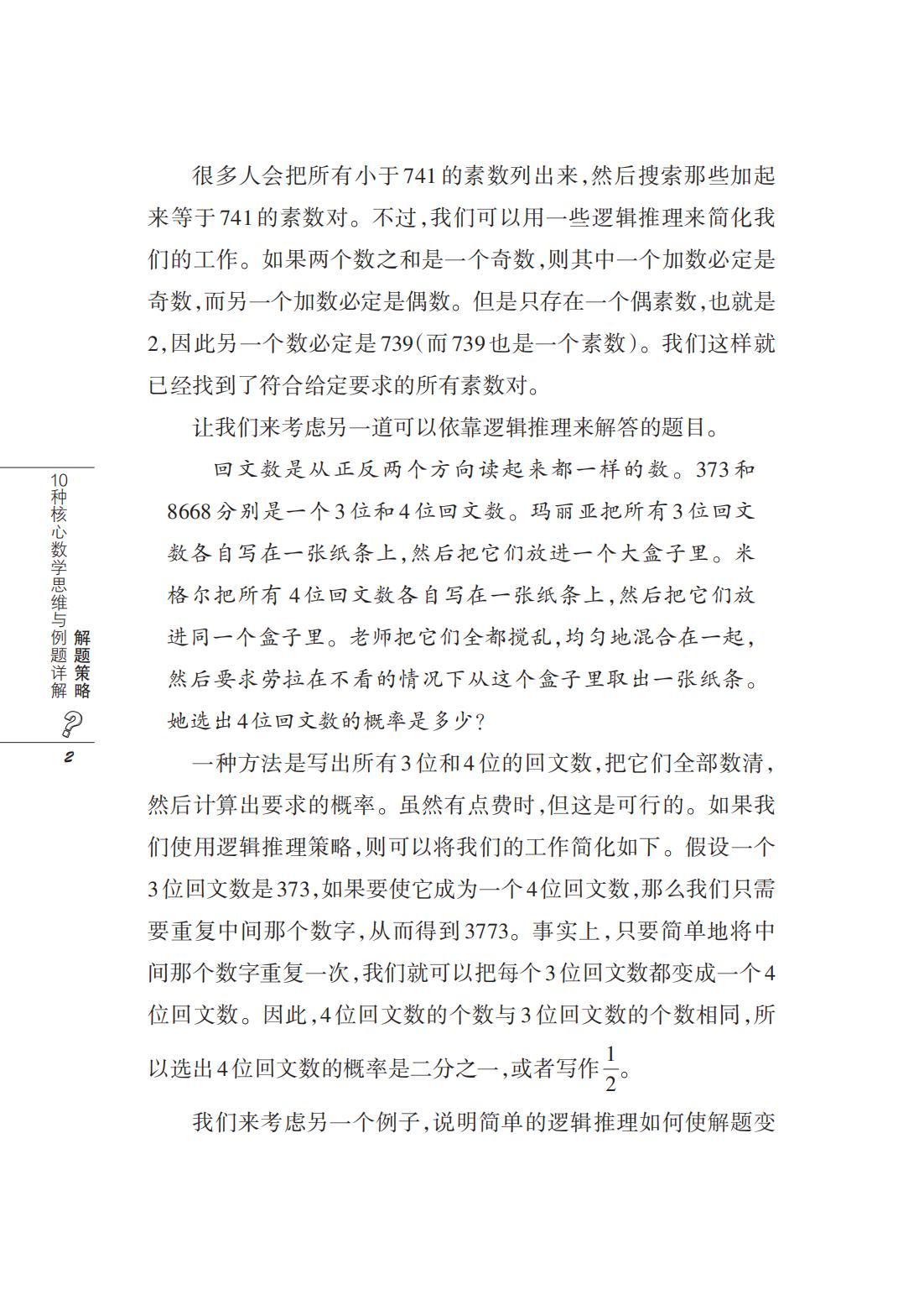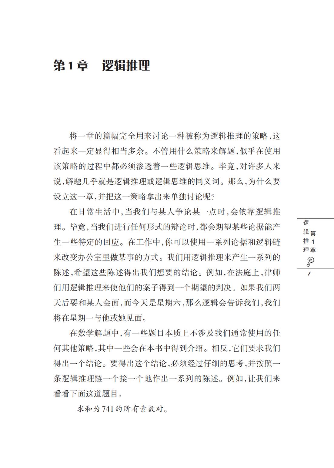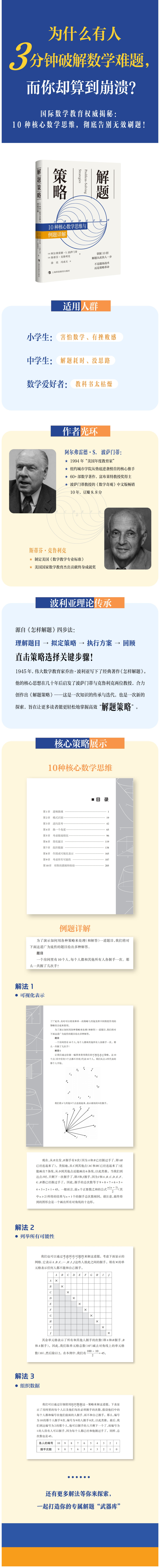 本书堪称将波利亚的解题理念运用到实际的最佳指南,并深入探讨寻找解题策略的这一关键步骤。本书重点分析了作者认为最有价值的10种策略,每种策略独立成章。书中例题通常先展示常见解法(常涉及复杂代数或计算),再演示运用特定策略得出更优雅、高效的解答。