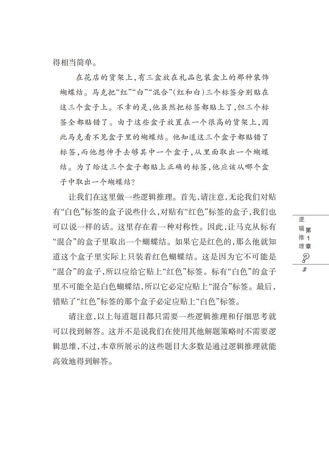 在开始谈论解题之前,我们应该先确定是什么构成了题目。题目是个人所面临的一种需要解决的情况,但对此没有现成的解决办法。注意,这里的短语是“没有现成的解决办法”。毕竟,当我们中的许多人在美国上学时,学校里教我们解的那些题目往往是“类型化”的。也就是说,“年龄问题”用一种方法解决,“运动问题”用另一种方法解决,还有“混合问题”“液体测量问题”等,每一类题目都是用一种特定的方法去解决的。事实上,一旦我们学会了恰当的方法,这些题目甚至不能算作真正解题意义上的题目。我们要做的只是识别出题目的特定类型,再应用合适的、不假思索的过程去演算。