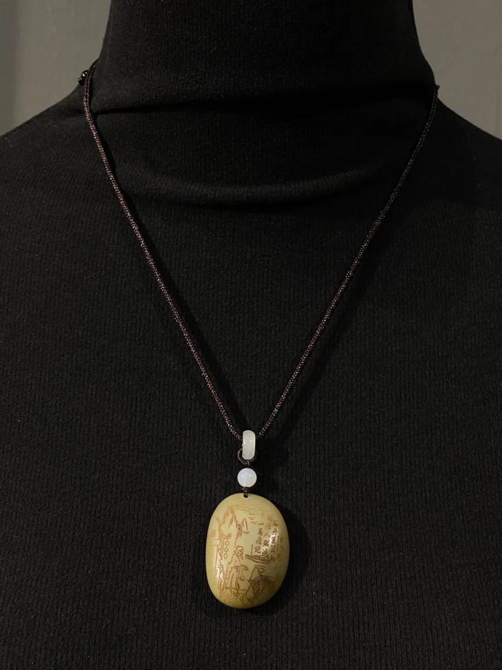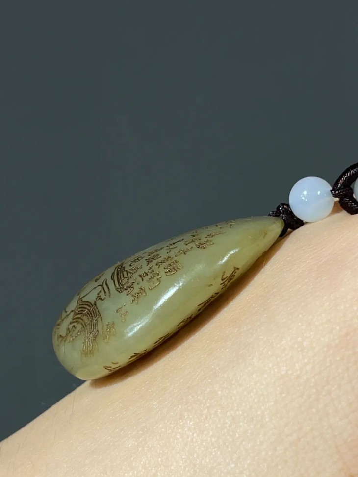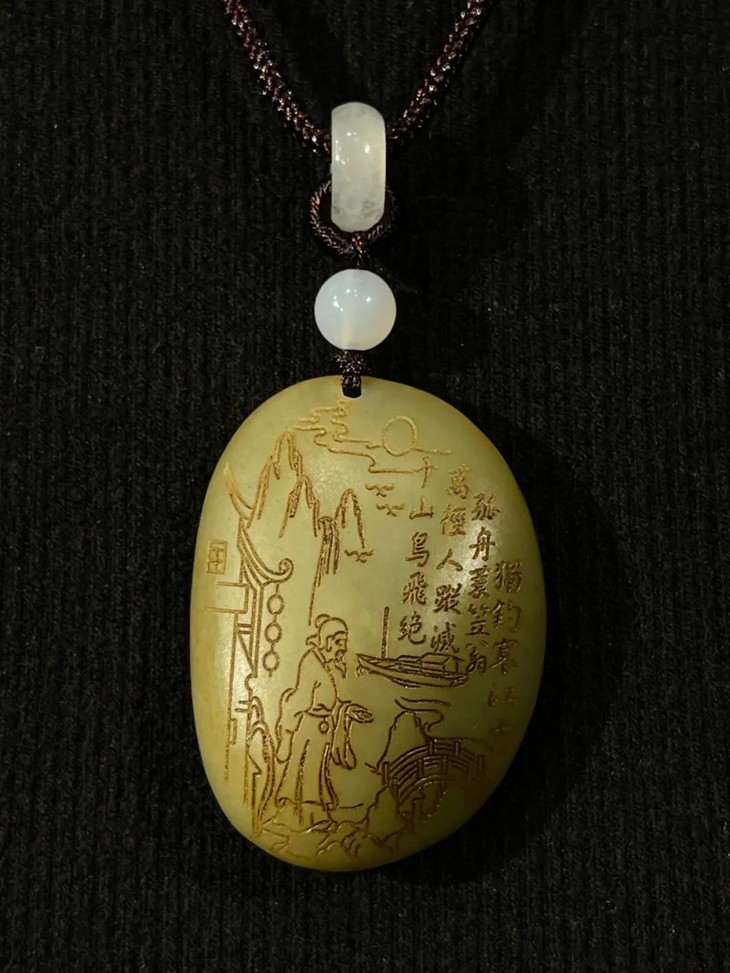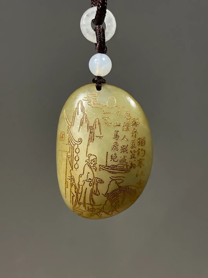 此青黄玉原石雕诗文高仕图吊坠/把玩件,质地堅硬,比重高,青黄玉肉质细嫩无瑕疵、毛孔清晰自然、籽料青黄玉色泽柔美清新,雕诗文与纹饰剛劲典雅,上手盘玩特感压手,油润度高如凝脂,包浆皮壳温润细腻,精致贵气堪比珠玉珍。