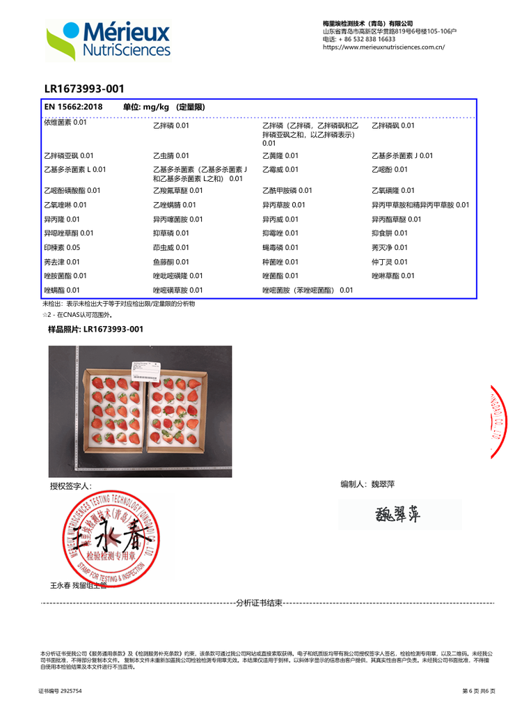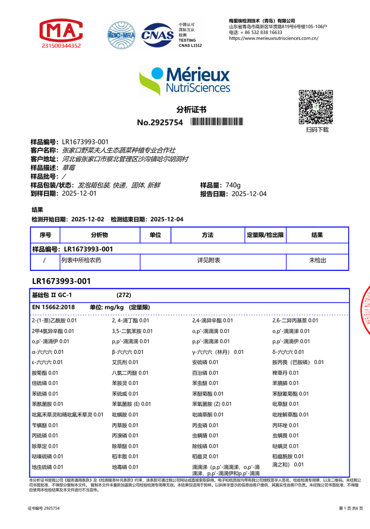草莓今年做了有机认证和631项农残检测,均无检出。