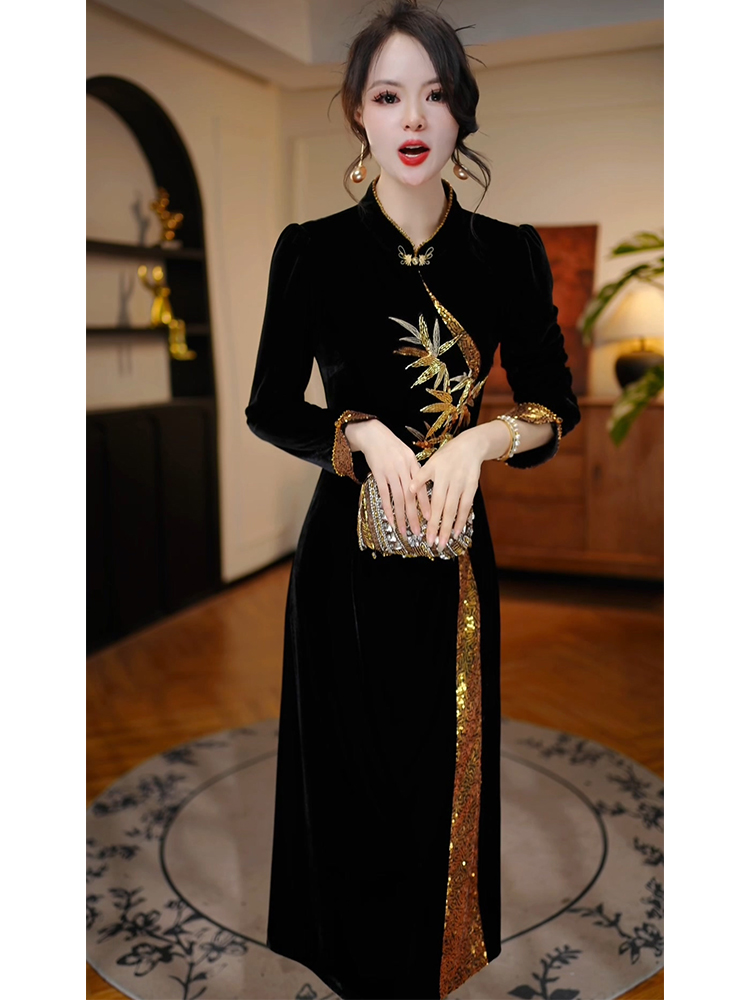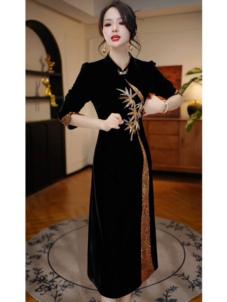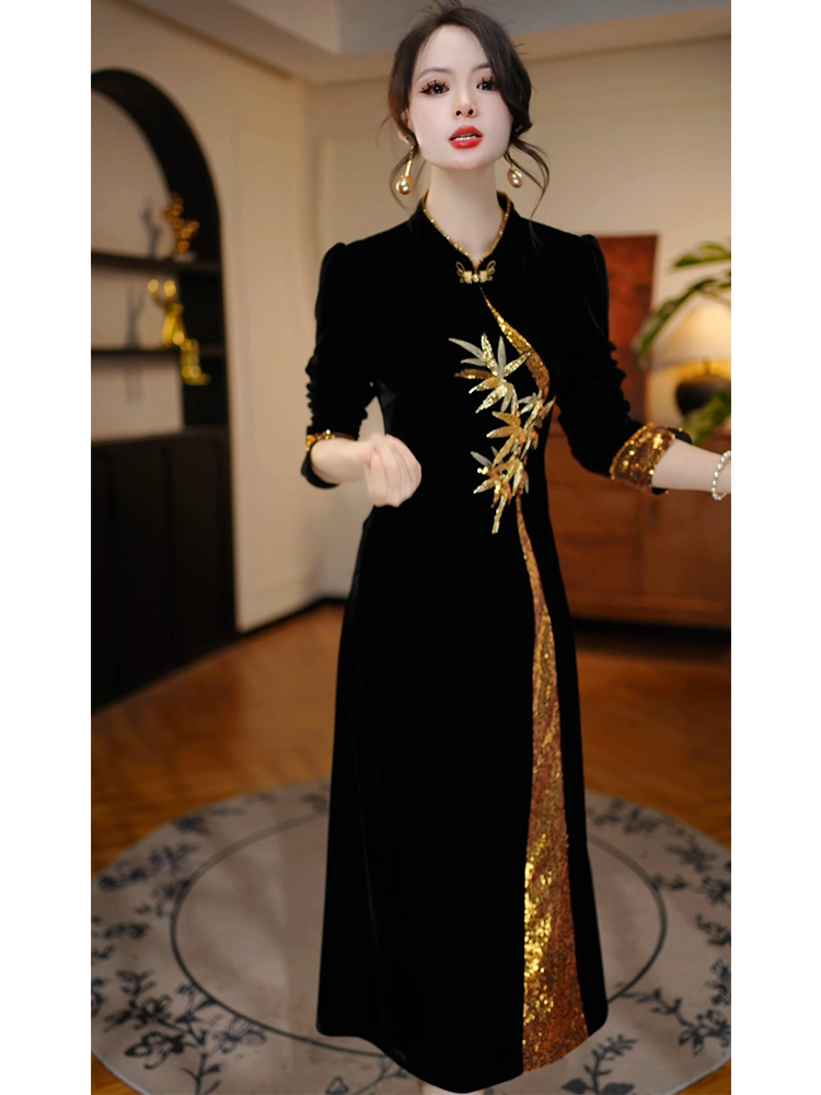 QYM 新中式国风改良连衣裙气质修身显瘦中长款裙