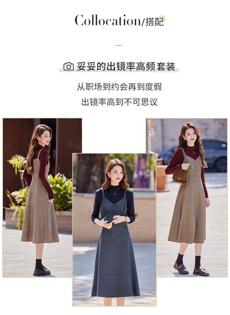 HR ABS25171法式时尚两件套裙洋气复古格纹长袖吊带裙两件套 商品图2
