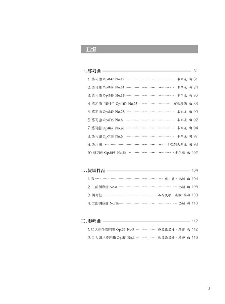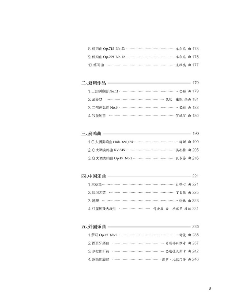 这是一套非常实用、完整的钢琴教材,包括5本钢琴教程、2本技巧教程,吸收了国内外同类教材的先进理念,思路清晰,结构缜密。本册是钢琴教程第二册,程度相当于4—6级,共89首作品,包括练习曲、复调、奏鸣曲、中国乐曲和外国乐曲,练习曲精选了车尔尼、莱蒙、海勒、卡巴列夫斯基、克拉莫等作曲家的作品,复调由浅入深选了巴赫的《小前奏曲与赋格》《二部创意曲》里的作品,奏鸣曲根据教学进程优选了克列门蒂、库劳、贝多芬及莫扎特的作品,中国乐曲则选了一些我国经典的民歌及优秀作曲家创作的作品,如《阿拉木汗》《庆翻身》《南泥湾》《水草舞》《红星照我去战斗》等,外国乐曲精选了各国民歌及优秀作曲家的创作作品,如《叶塞尼亚》《森林波尔卡》等。为加强学生相互合作的能力,作者还特别精选了四手联弹和双钢琴作品,如《草原小姐妹》《沃尔塔瓦河》,都是经典之作,具有较高的实用性和艺术性。