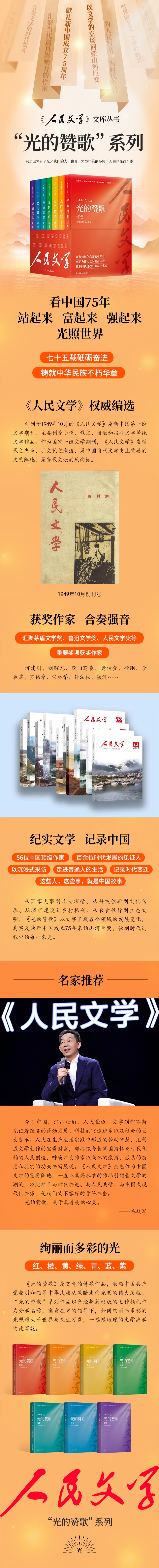 2021年,在庆祝中国共产党成立一百周年的热烈喜庆气氛中,《人民文学》杂志特别设立了“光的赞歌”栏目,讲述一百年来党领导人民在祖国各地、条条战线矢志不移渝续奋斗的动人故事。