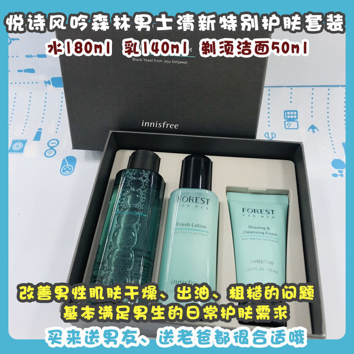 悦诗风吟森林男士清新特别护肤套装#2019新版👍悦诗风吟森林系列🍃在老款的基础上从配方和外包装都进行了升级和改良🔝,由之前的蓝色和绿色套盒合二为一👏,减少了繁琐的选择。这个套盒针对男性肌肤研制👨,改善男性肌肤干燥、出油、粗糙的问题✔,基本满足男生的日常护肤需求,💯买来送男友、送老爸都很合适哦!套装包括:水180ml➕乳140ml➕剃须洁面50ml