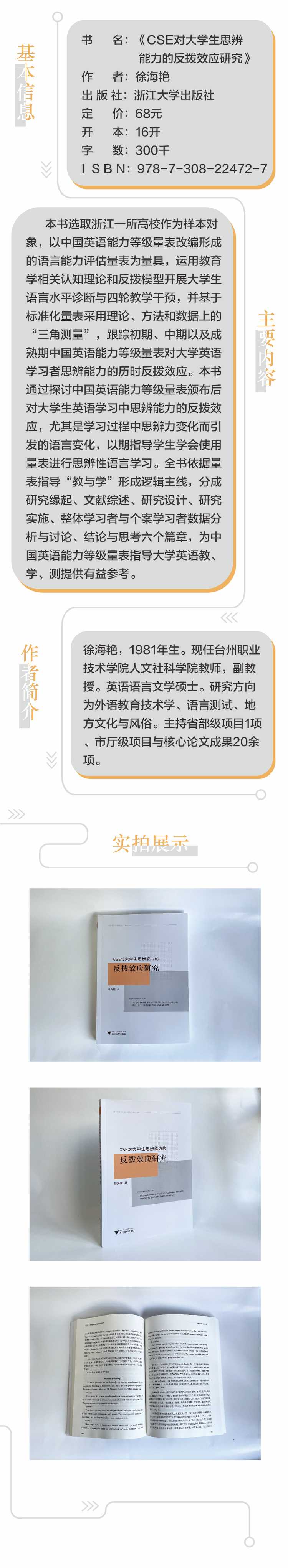 本书选取浙江一所高校作为样本对象,以中国英语能力等级量表改编形成的语言能力评估量表为量具,运用教育学相关认知理论和反拨模型开展大学生语言水平诊断与四轮教学干预,并基于标准化量表采用理论、方法和数据上的“三角测量”,跟踪初期、中期以及成熟期中国英语能力等级量表对大学英语学习者思辨能力的历时反拨效应。本书通过探讨中国英语能力等级量表颁布后对大学生英语学习中思辨能力的反拨效应,尤其是学习过程中思辨力变化而引发的语言变化,以期指导学生学会使用量表进行思辨性语言学习。全书依据量表指导“教与学”形成逻辑主线,分成研究缘起、文献综述、研究设计、研究实施、整体学习者与个案学习者数据分析与讨论、结论与思考六个篇章,为中国英语能力等级量表指导大学英语教、学、测提供有益参考。
