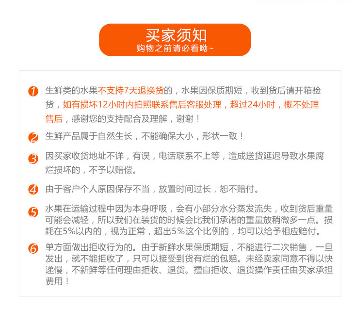 4.生鲜水果因为客户原因无法收取或者拒收一律不予赔付。