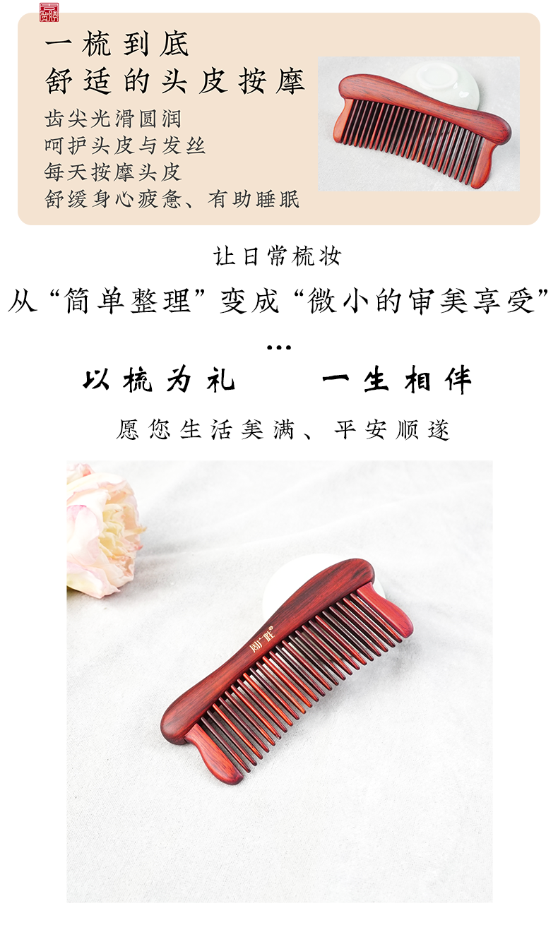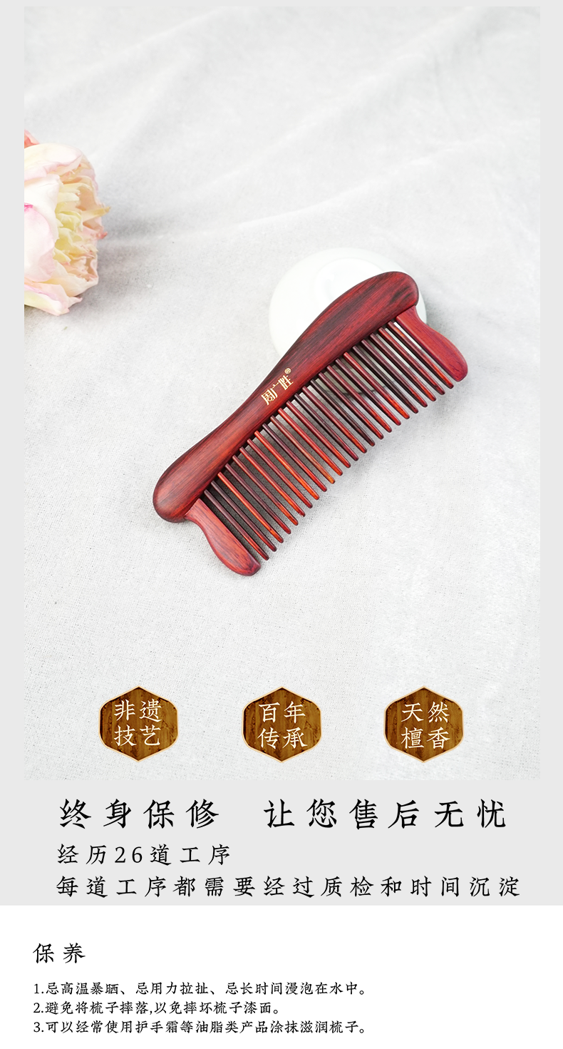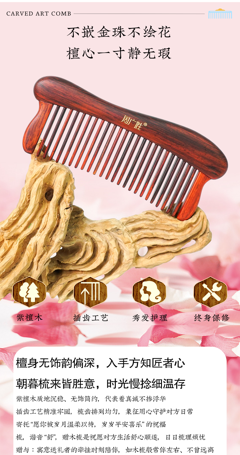 周广胜紫檀雕花珠语防静电按摩插齿梳子女士专用护发顺发礼盒