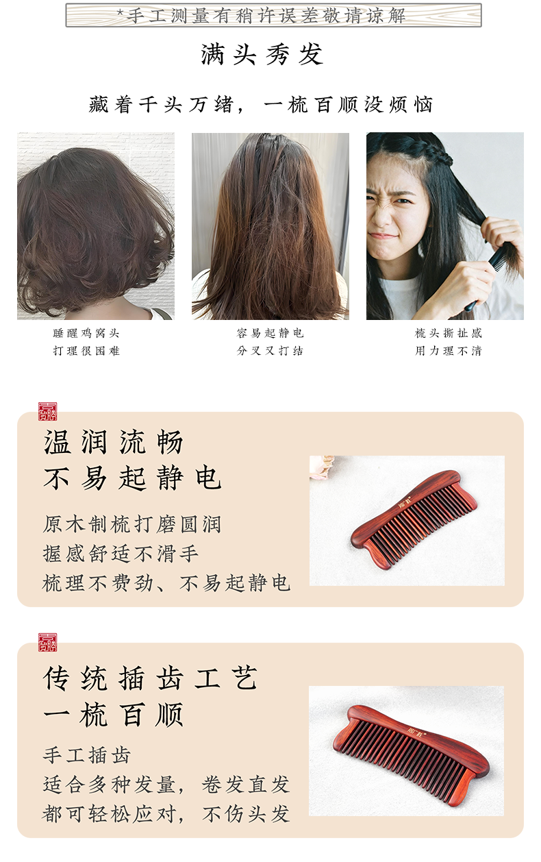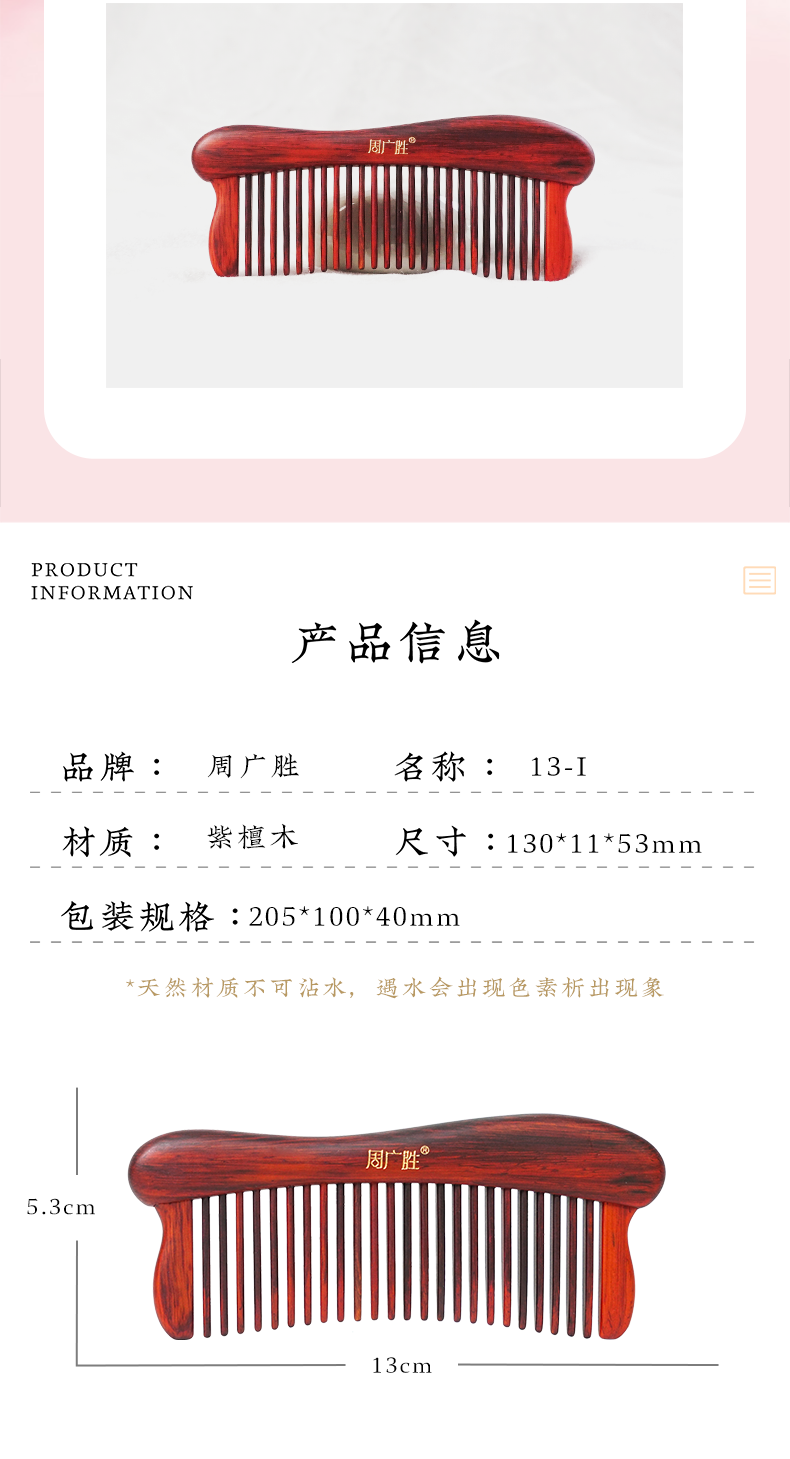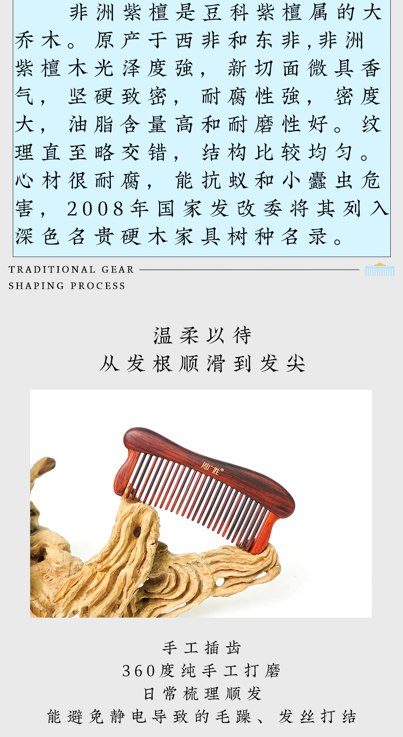 周广胜紫檀雕花珠语防静电按摩插齿梳子女士专用护发顺发礼盒