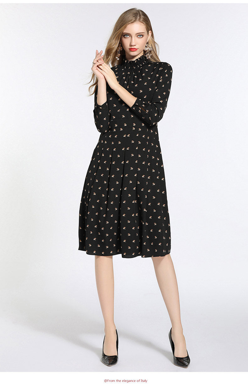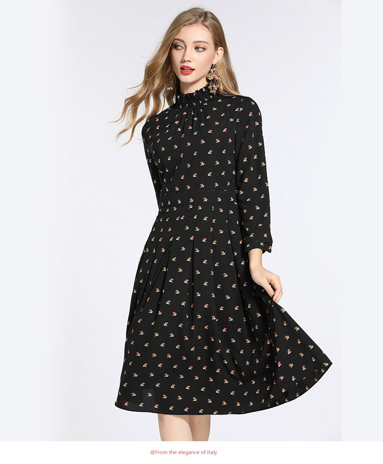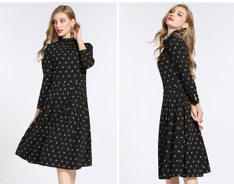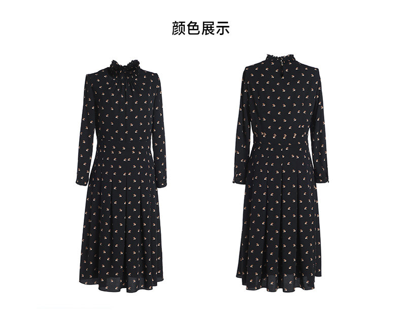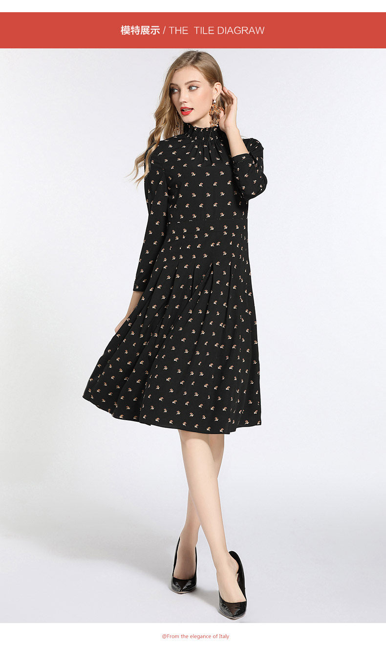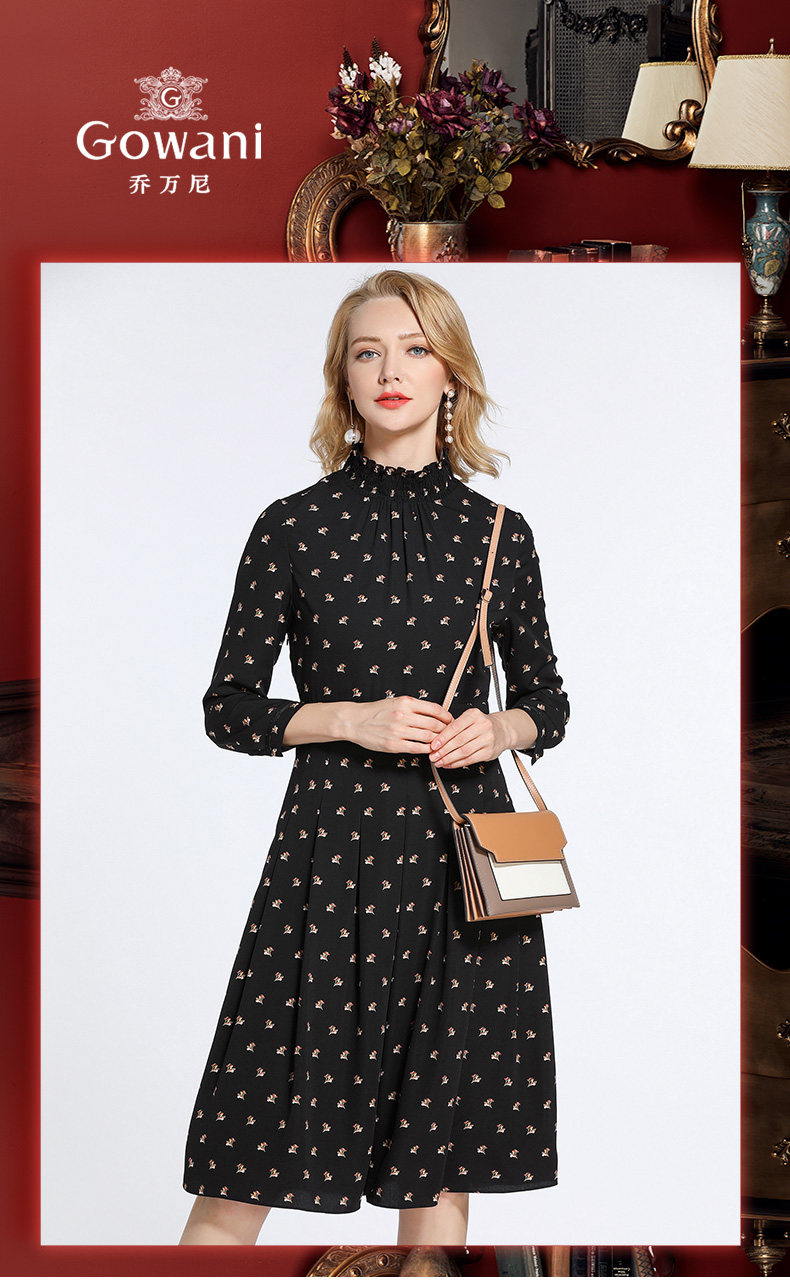 乔万尼春装女 复古高领修身气质碎花长袖连衣裙长裙EB3E203