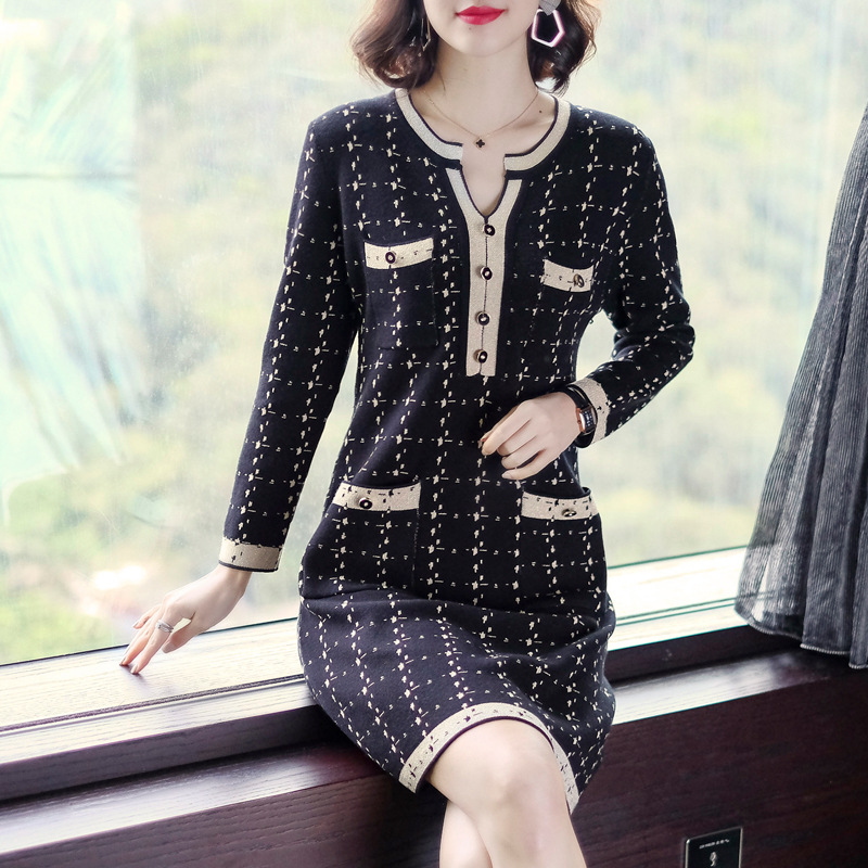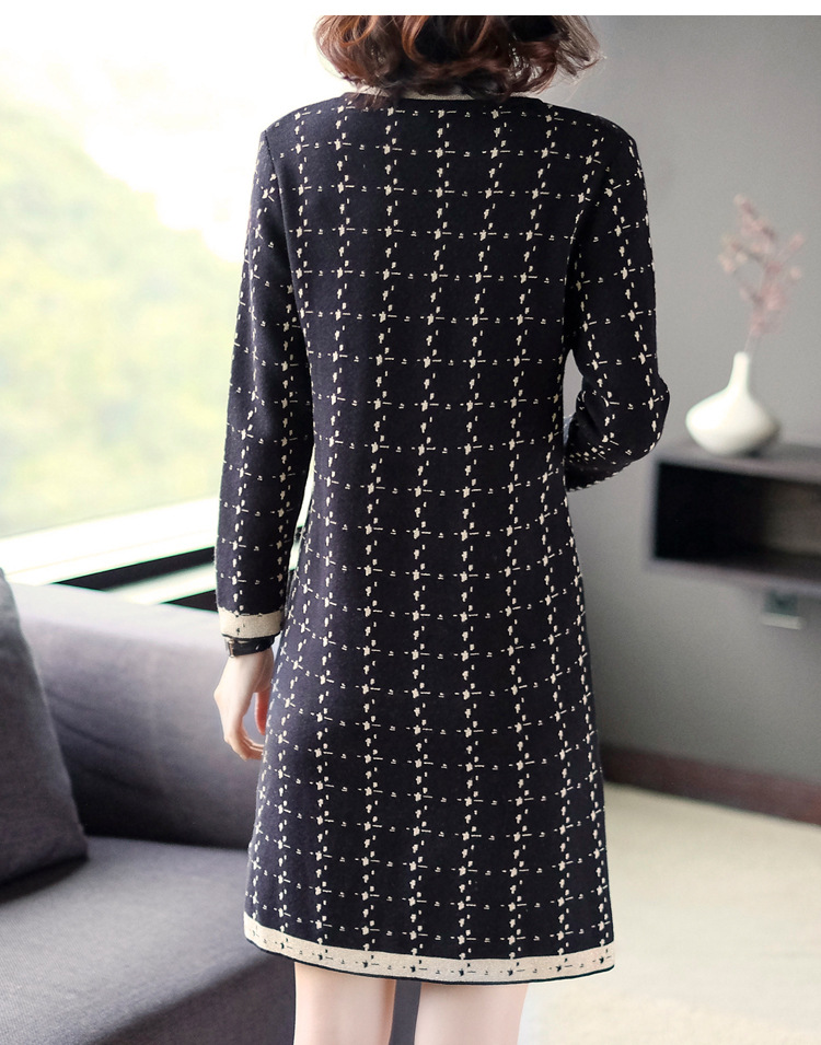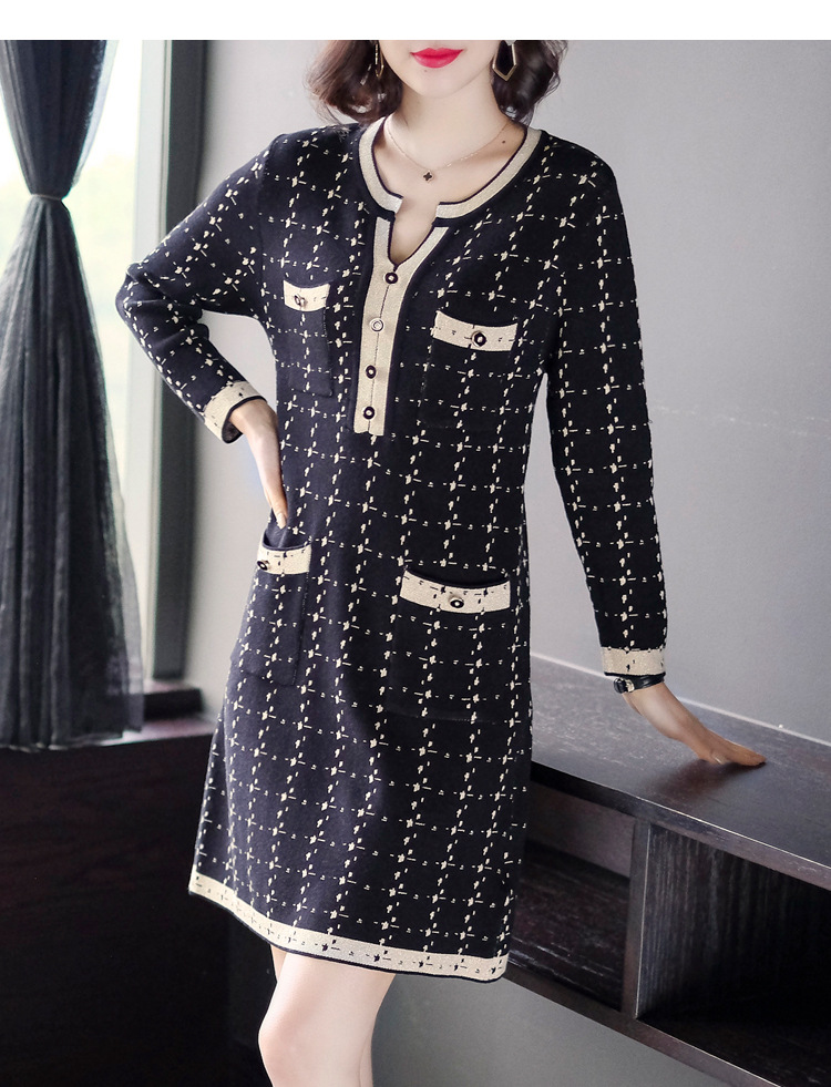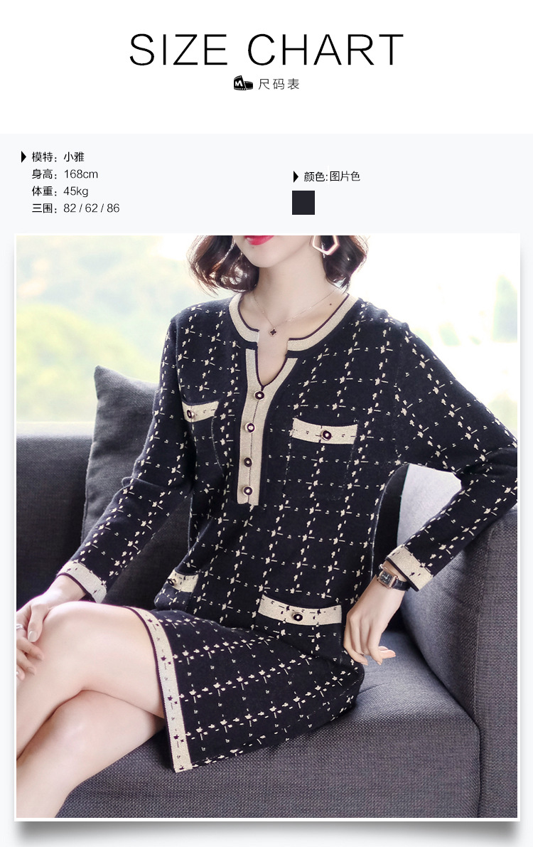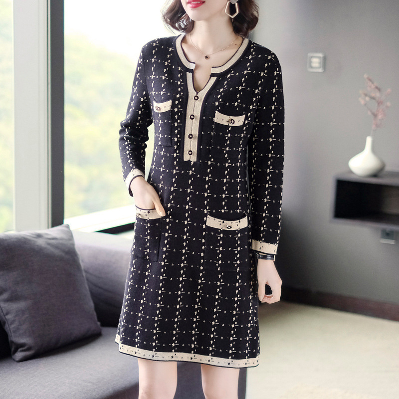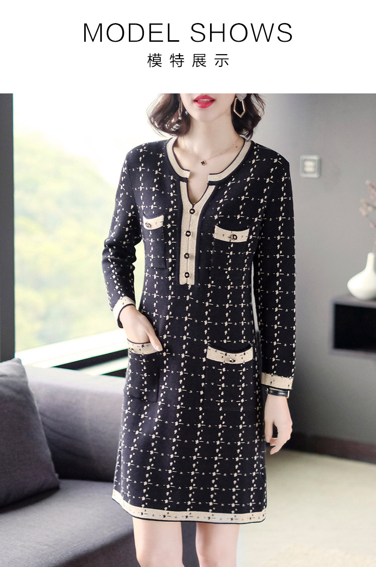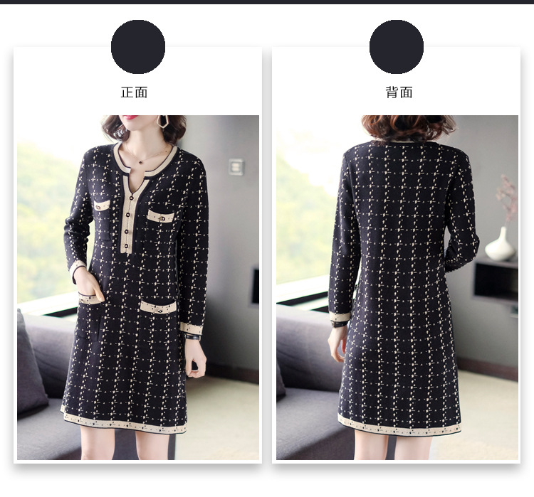 NYL-4633003新款格子长袖V领修身显瘦中长裙