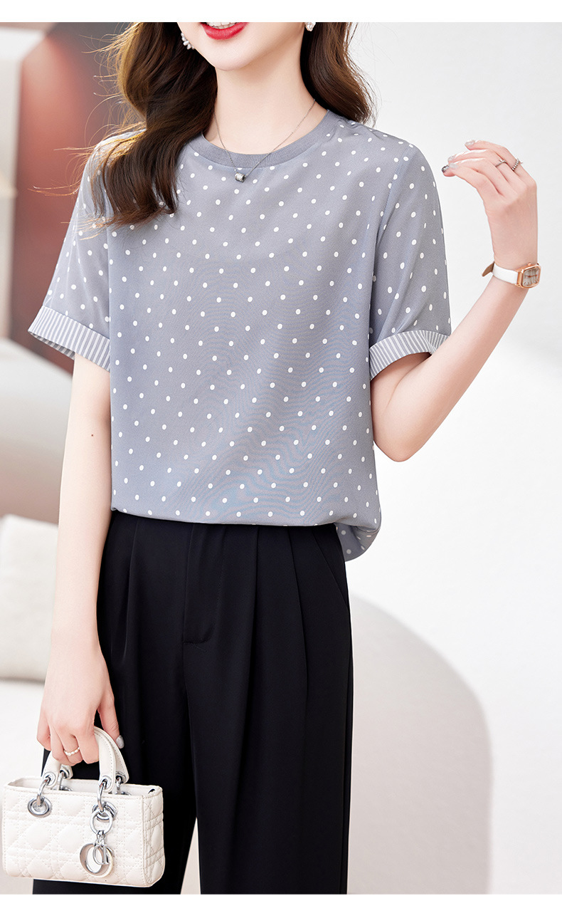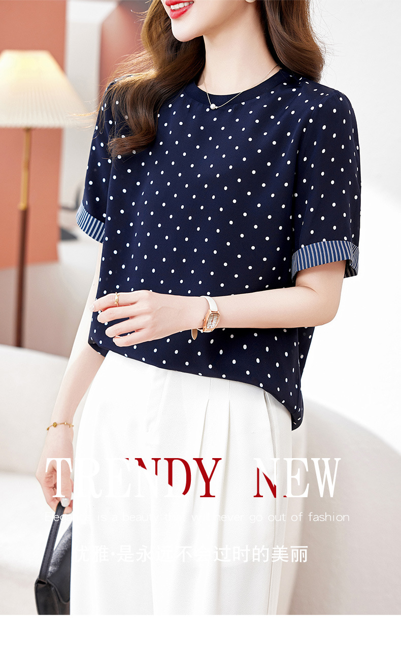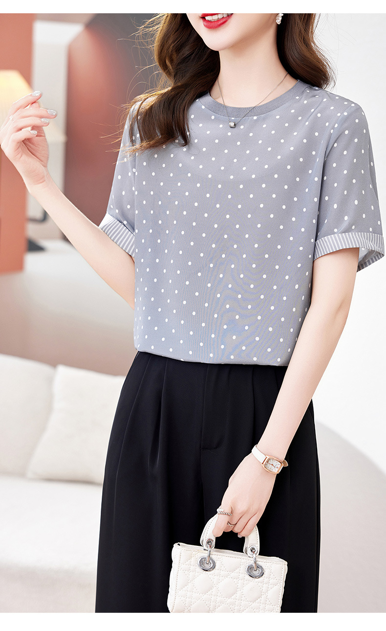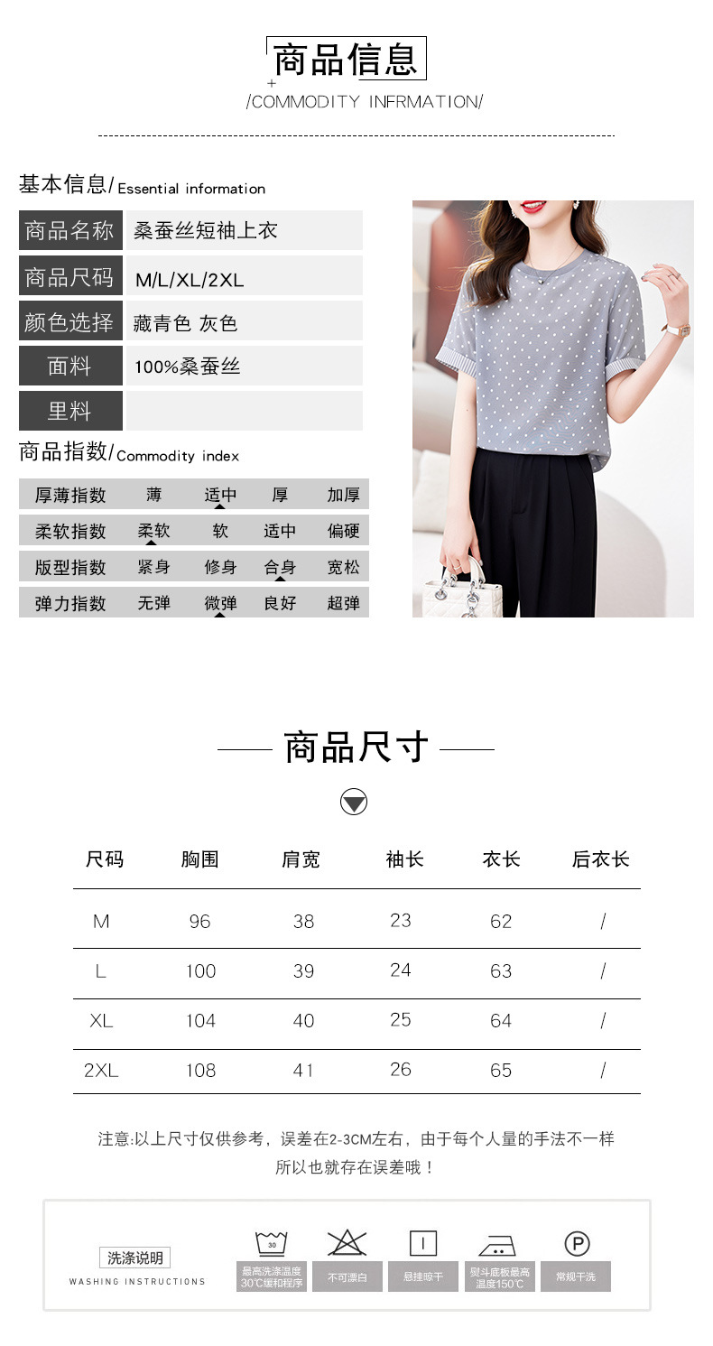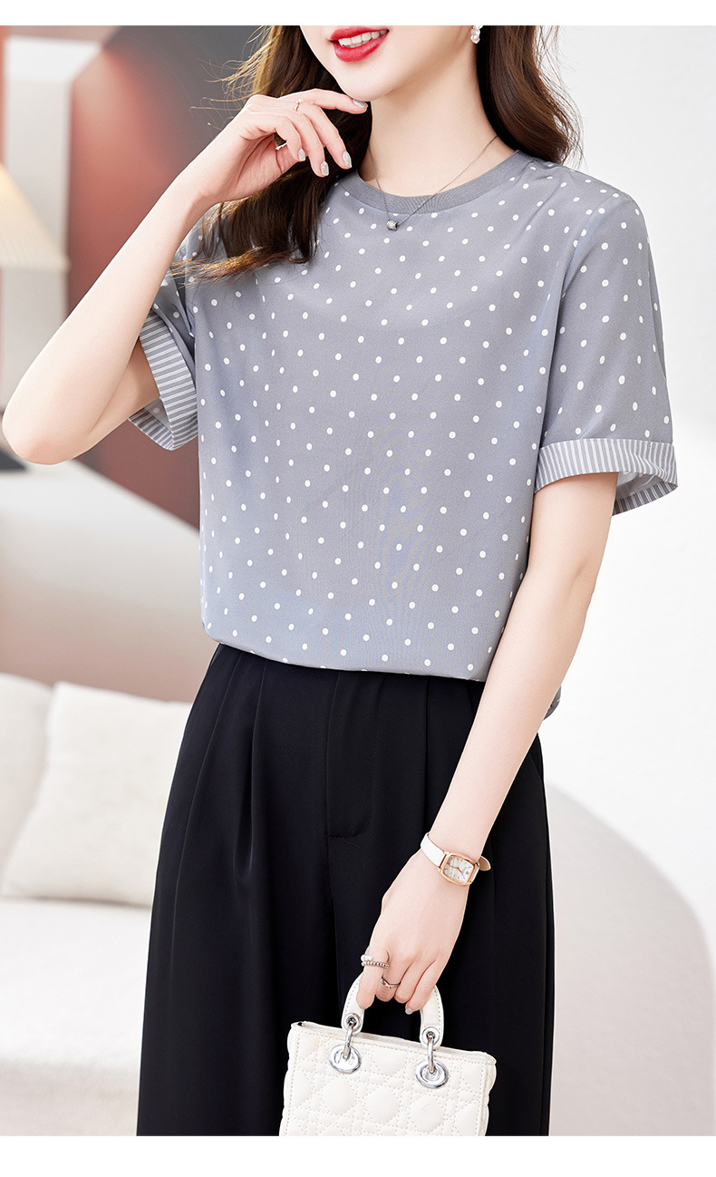 丁摩 真丝波点圆领设计感夏正肩短袖T恤9679