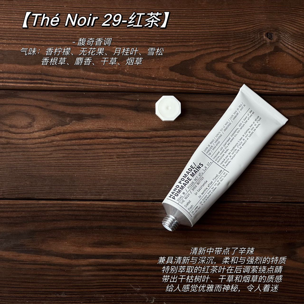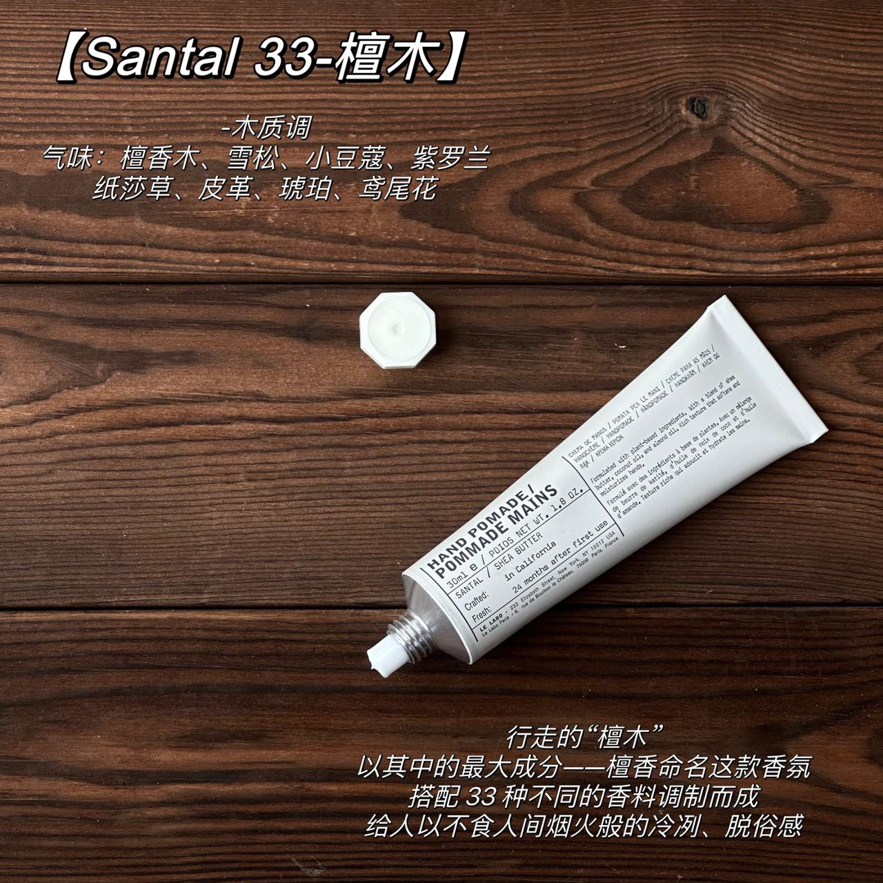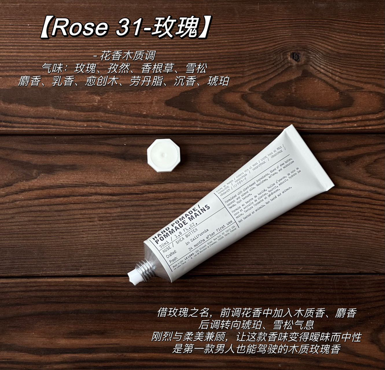 【内含香型】Hinoki-桧木;Basil-罗勒;Santal 33-檀木Rose 31-玫瑰;Thé Noir 29-红茶;Bergamote 22-佛手柑工业风铝管设计搭配环保个性包装6款限定香型,是男生也会爱上的宝藏护手霜