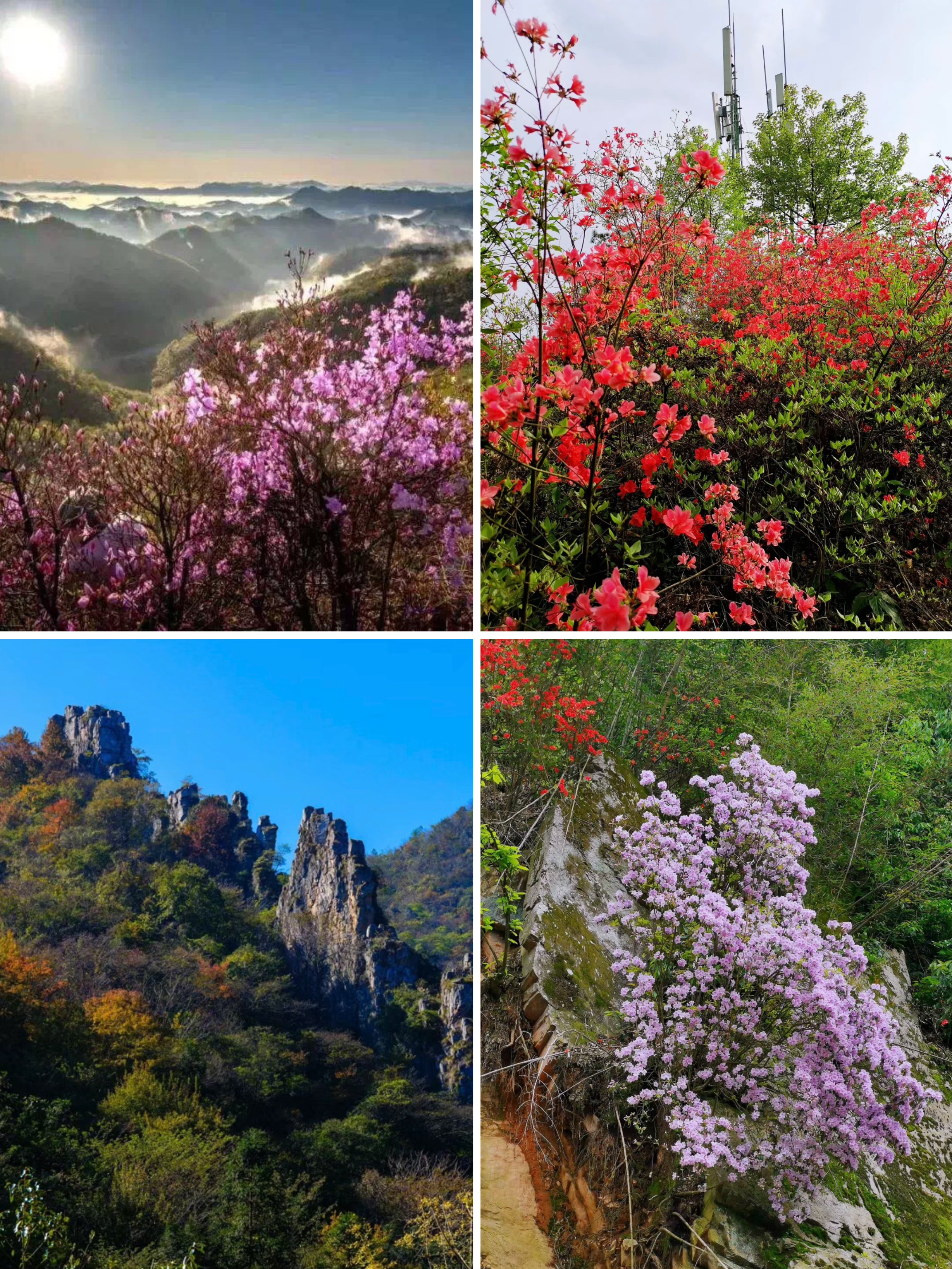 除了美好山色,更冲击视觉的是,在唐峰尖有一大片的野生映山红,以紫色和红色为主。