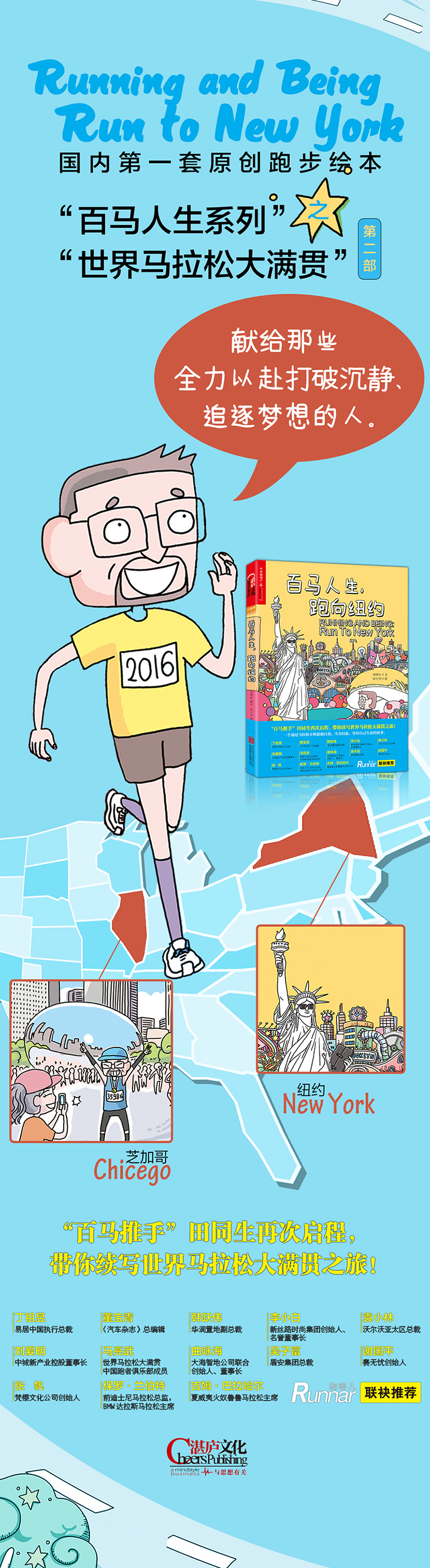 摆在您面前的这本《百马人生,跑向纽约》是我和十川合著的第三本绘本书,述说的是芝加哥马拉松和纽约马拉松。