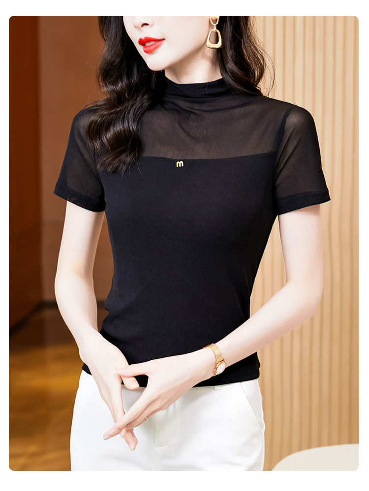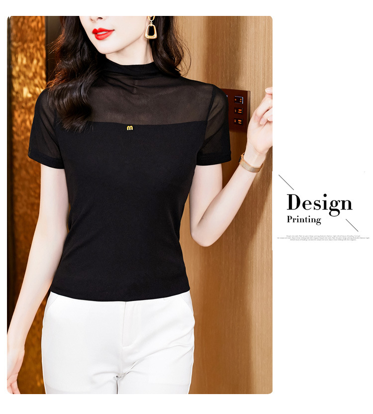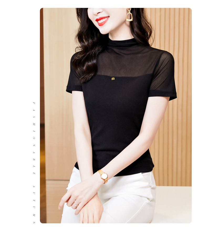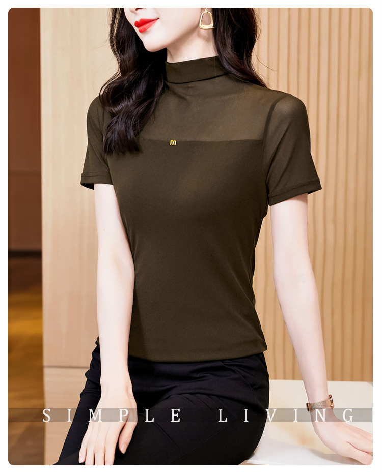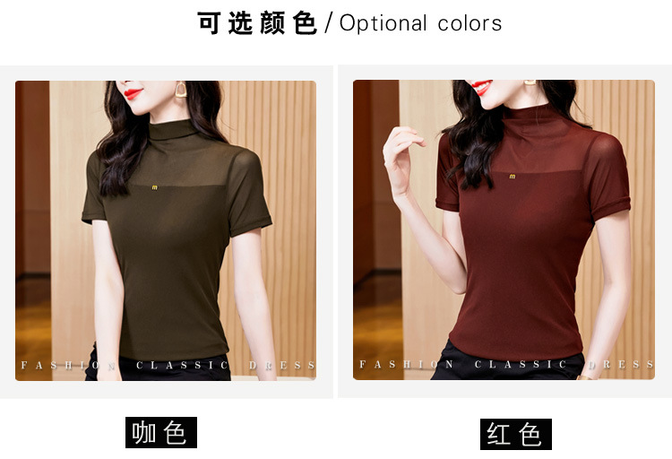 百搭半高领纯色短袖网纱打底衫上衣t恤K-E37M2768