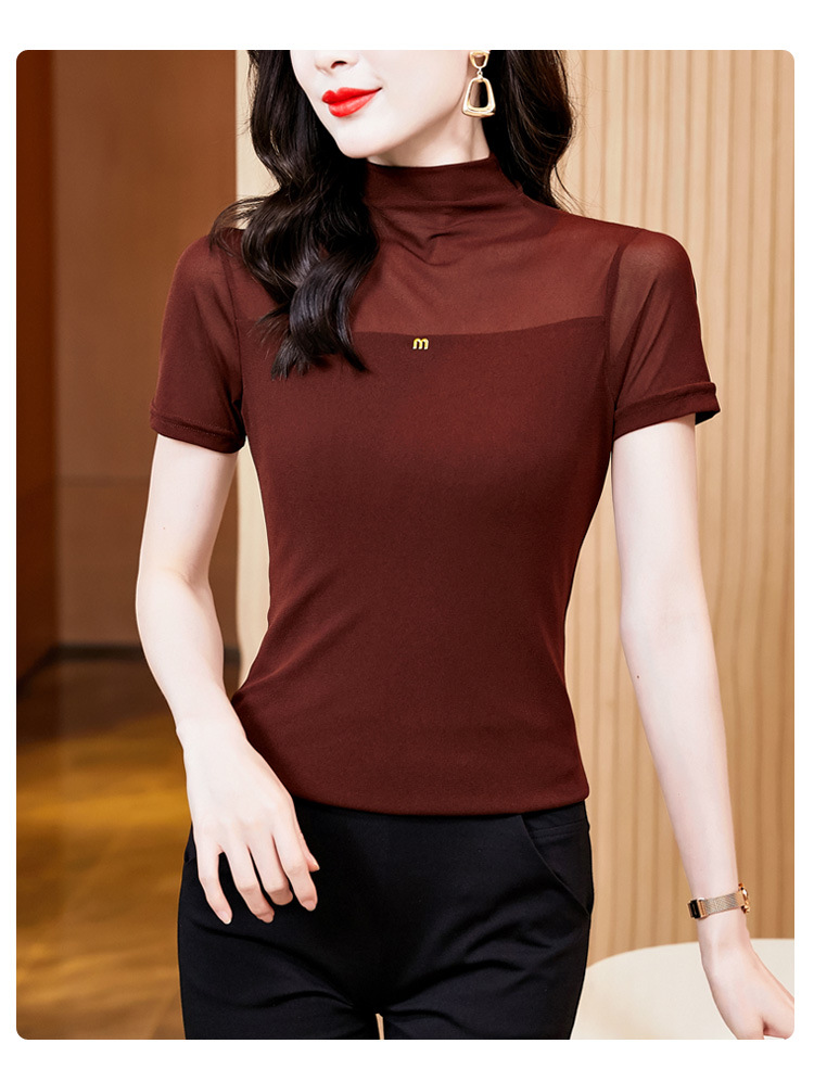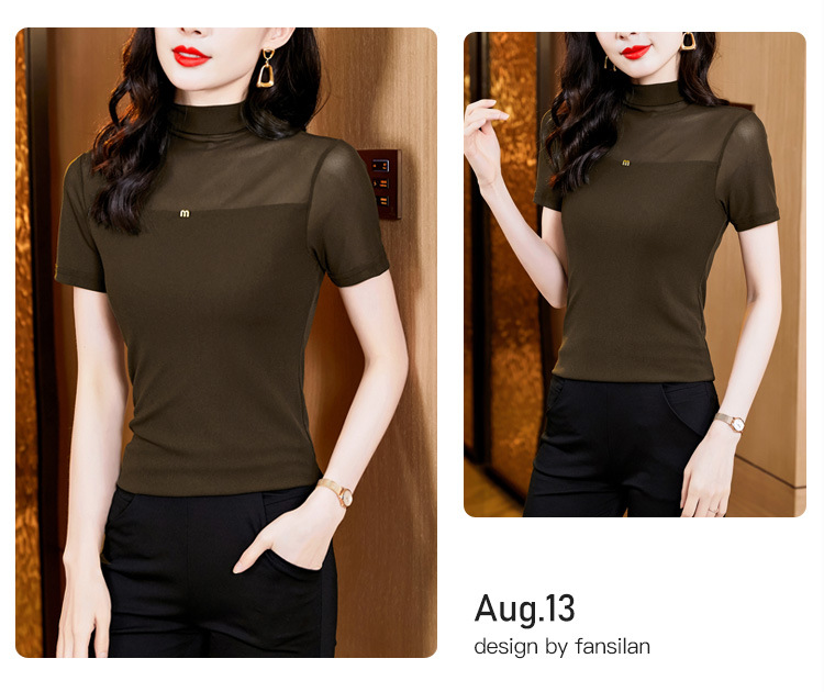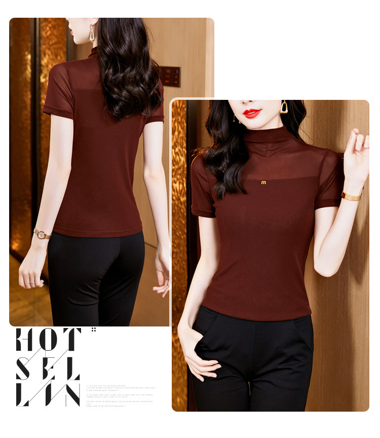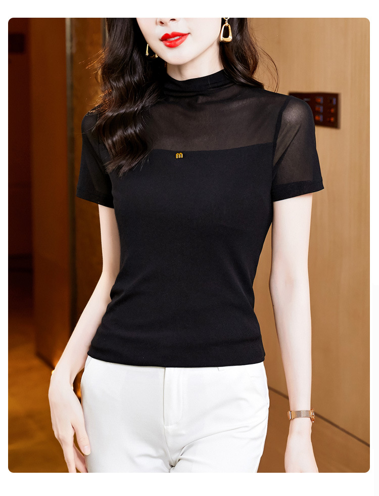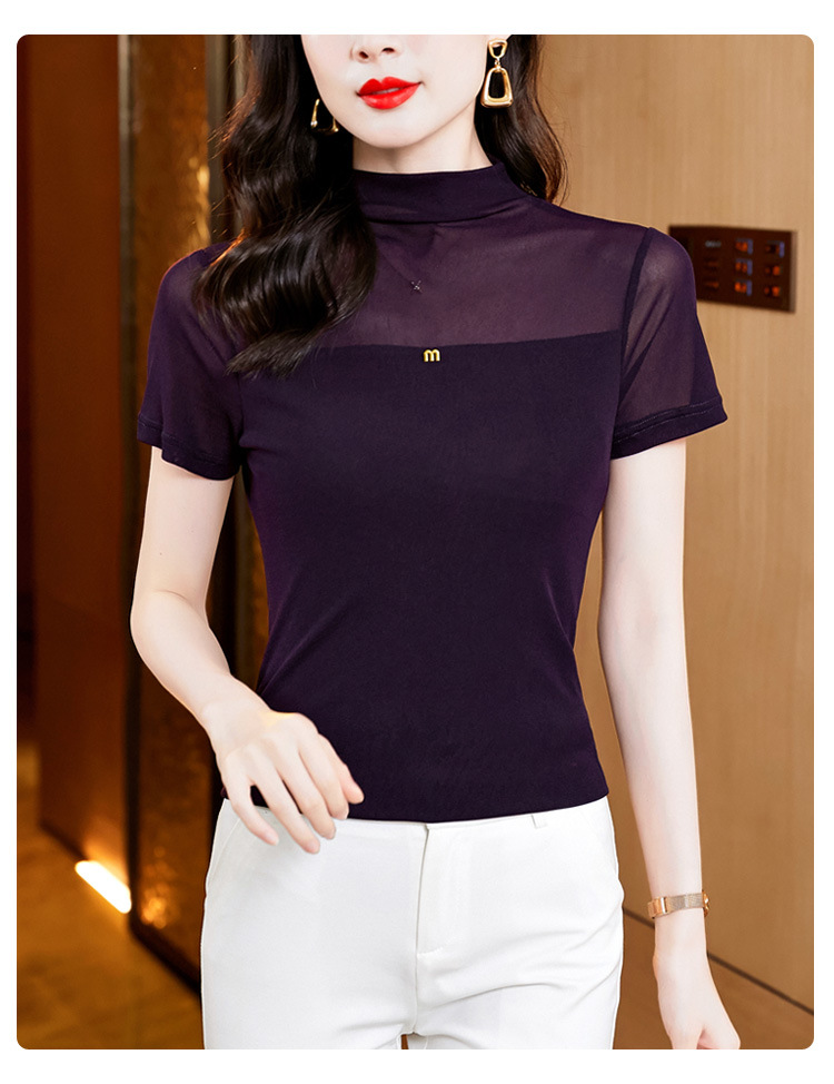 百搭半高领纯色短袖网纱打底衫上衣t恤K-E37M2768