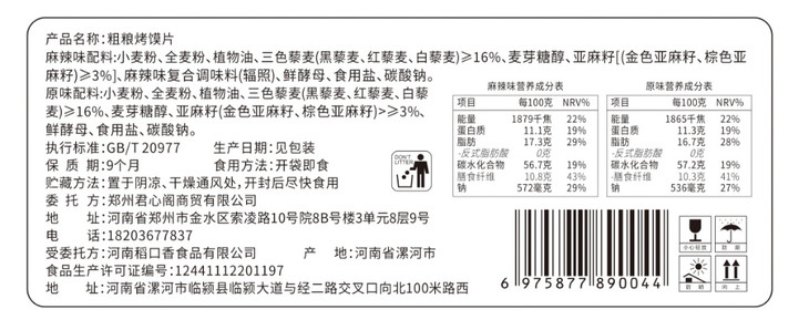 【品牌】:漠漠有礼 【产品名称】:漠漠有礼粗粮烤馍片 【规格】:原味500g/箱(约54片)、麻辣味500g/箱(约54片)、混合口味500g/箱(约54片) 【口味】:麻辣/原味 【产品类型】:烤馍片 【保质期】:9个月 【贮藏方法】:常温 【生产日期】:2025年3月 【产地】:河南漯河 【安全库存】:5000 【发货地】:河南漯河 【发货快递】:中通、圆通随机 【不发货地区】:新疆、西藏、港澳台 【加运费地区】:青海省、甘肃省、宁夏、海南省,内蒙+2/单 【发货时长】:72小时 【售后说明】:食品不支持7天无理由。因顾客原因导致,拦截,改地址,拒收,需要支付3元/组快递费。签收有质量问题等情况,请在24小时内售后。需提供清晰可见的:快递面单图,快递包装图,产品问题图。(未提供凭证货超过售后24小时时效的将不予处理,还请理解!)
