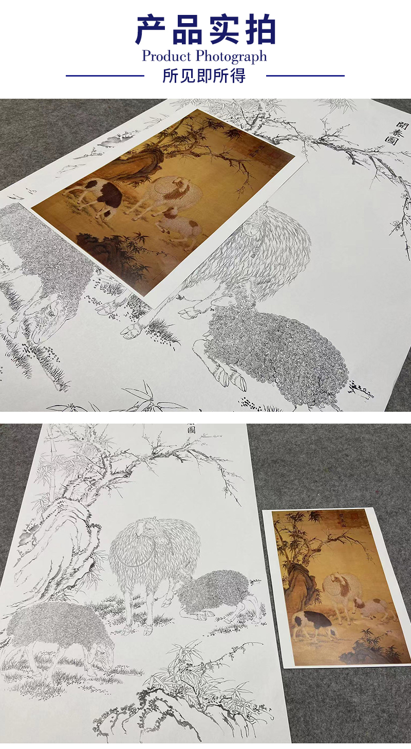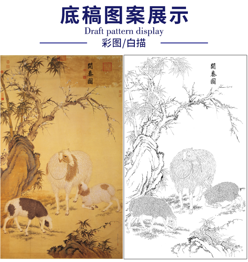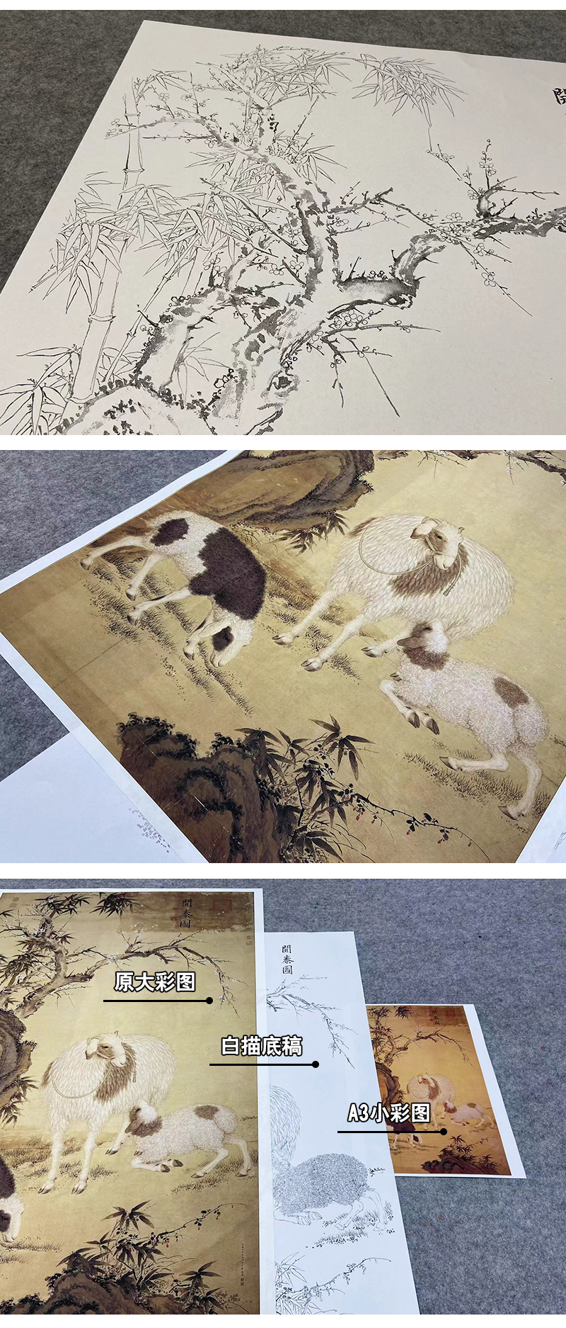 【大彩图】郎世宁工笔画白描底稿《开泰图轴》绵羊临摹勾线高清打印稿LS07