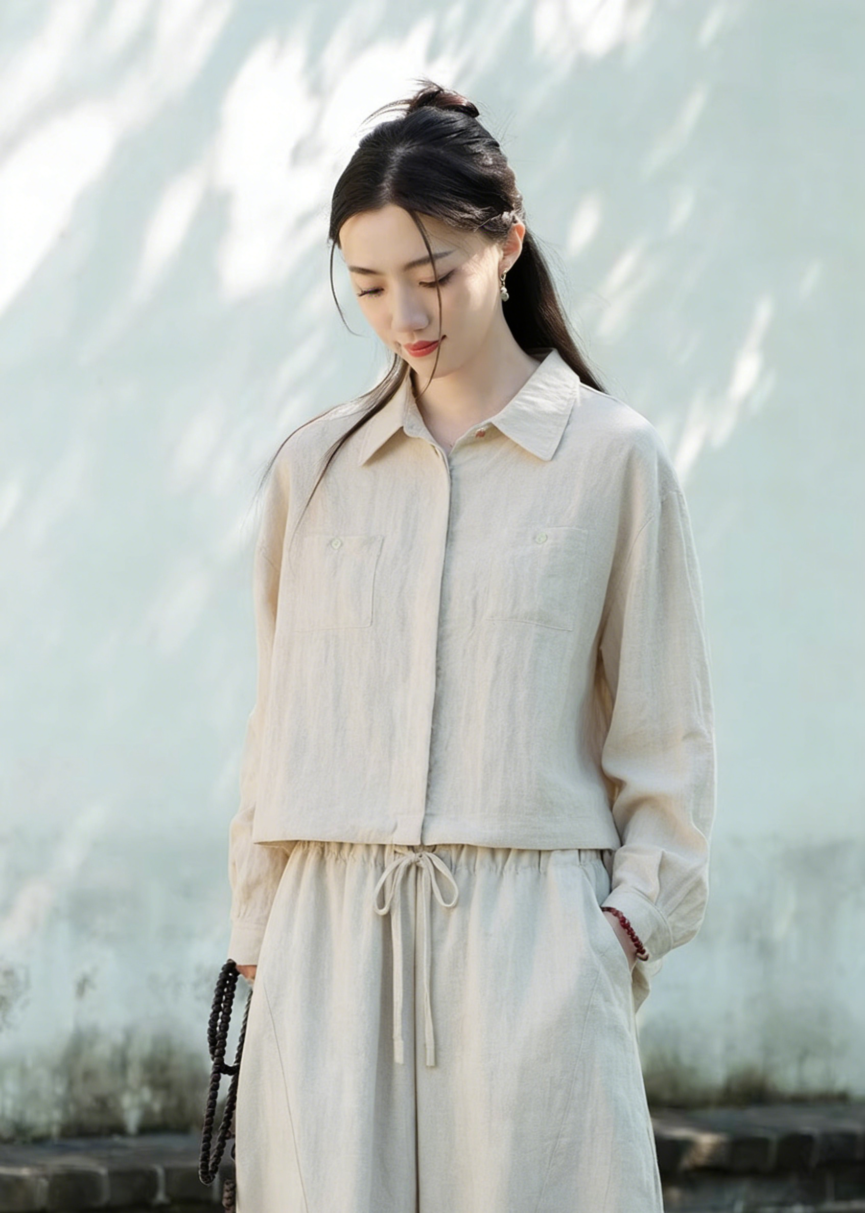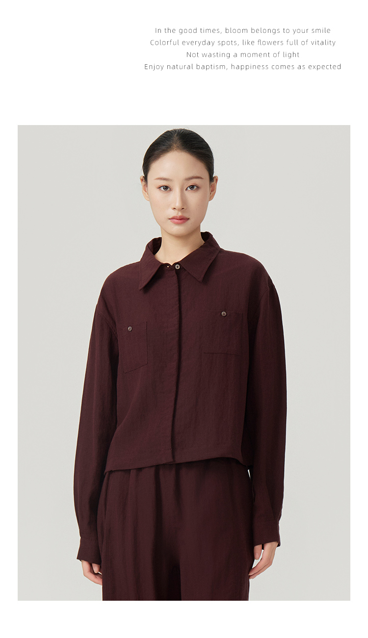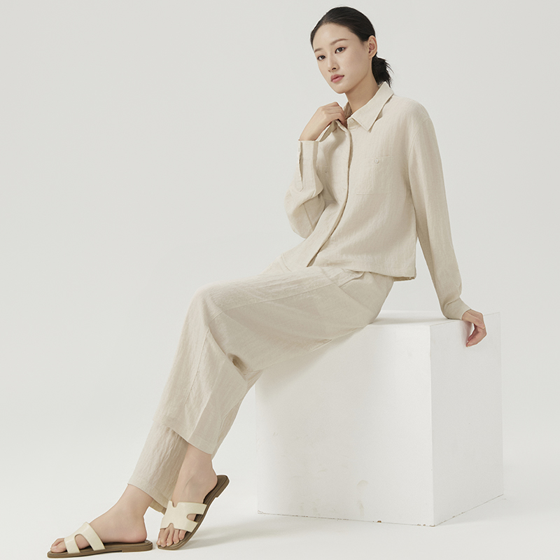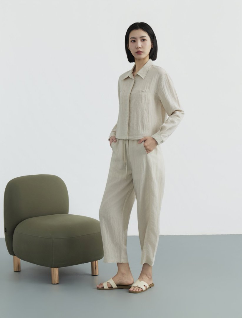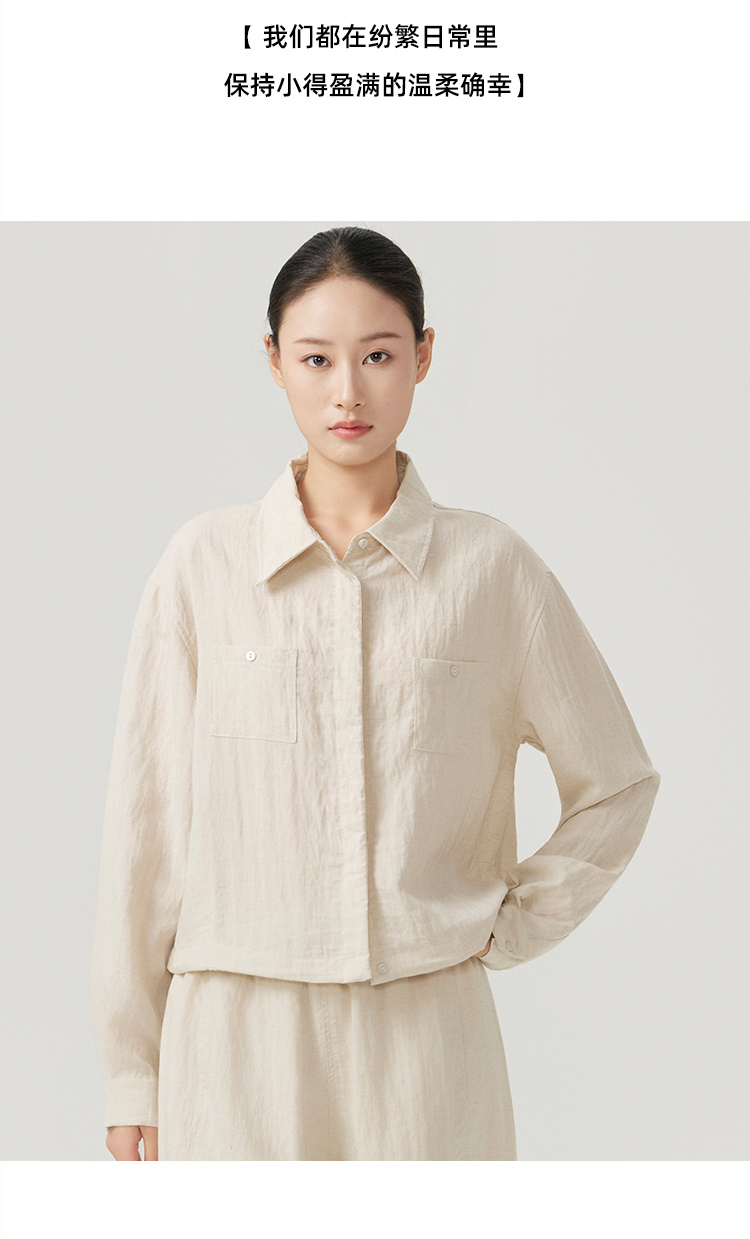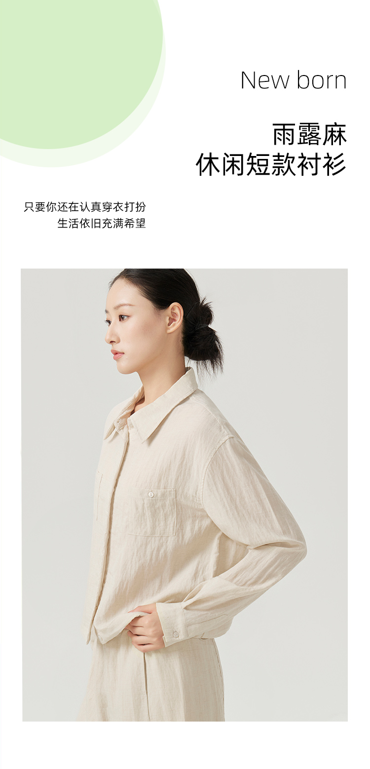 下单3-7天发货!Mylyis 雨露麻休闲短款衬衫/九分裤 短款衬衫翻领利落 双口袋点缀细节 搭配松紧腰九分裤 随性垂坠 适配日常通勤