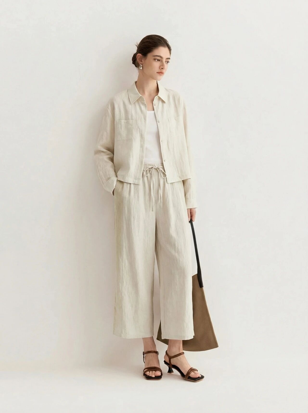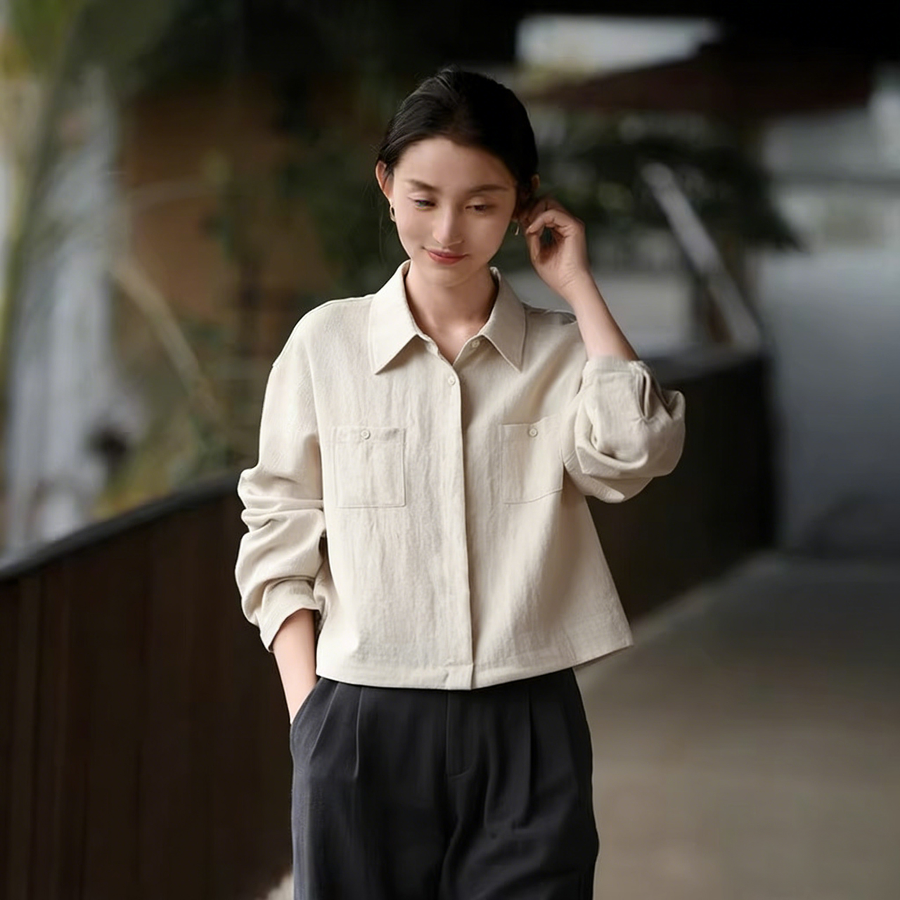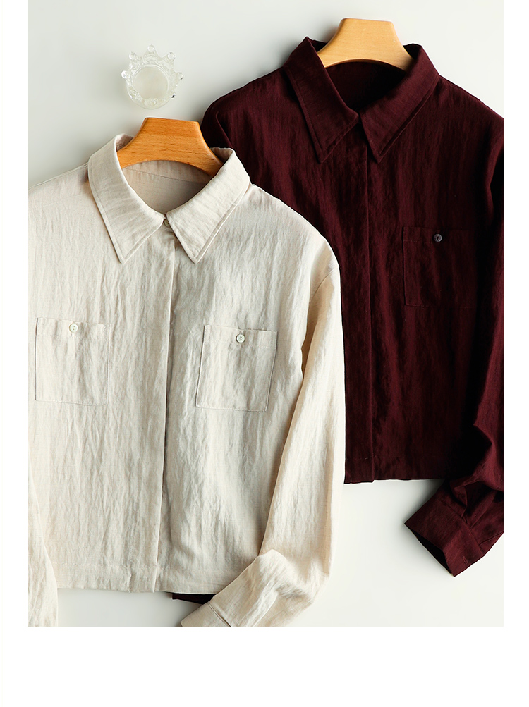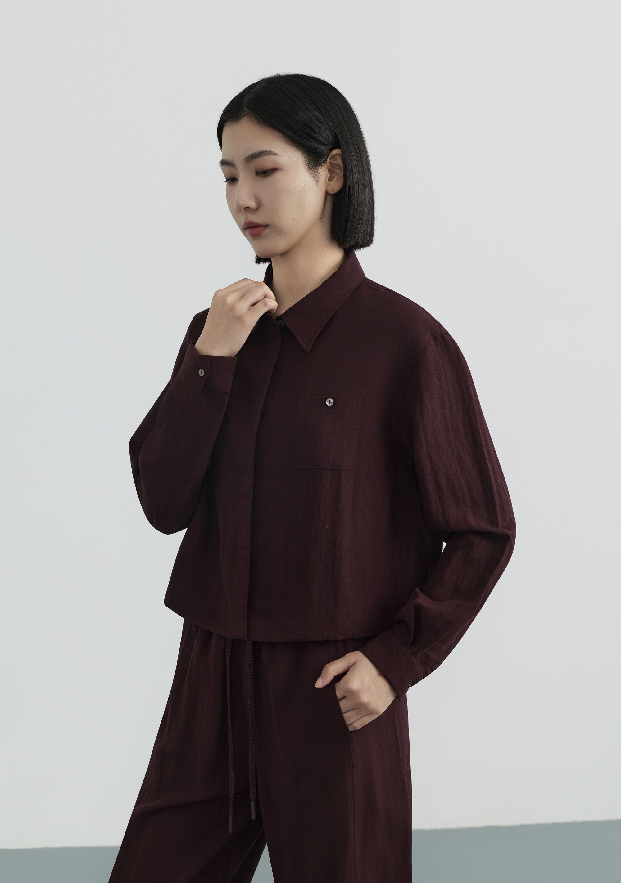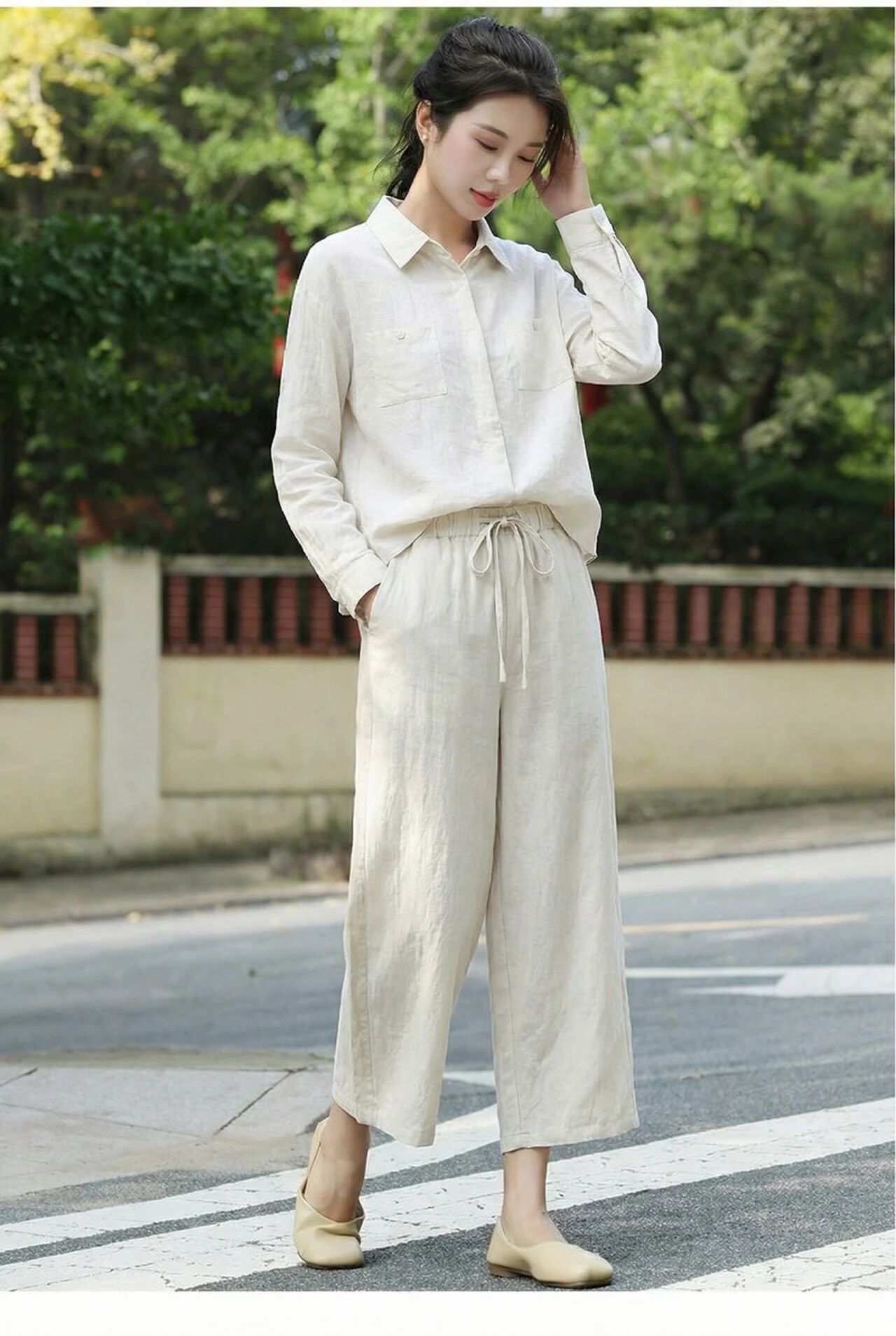 下单3-7天发货!Mylyis 雨露麻休闲短款衬衫/九分裤 短款衬衫翻领利落 双口袋点缀细节 搭配松紧腰九分裤 随性垂坠 适配日常通勤