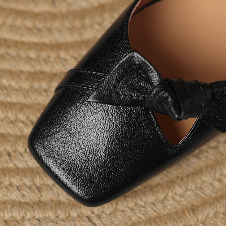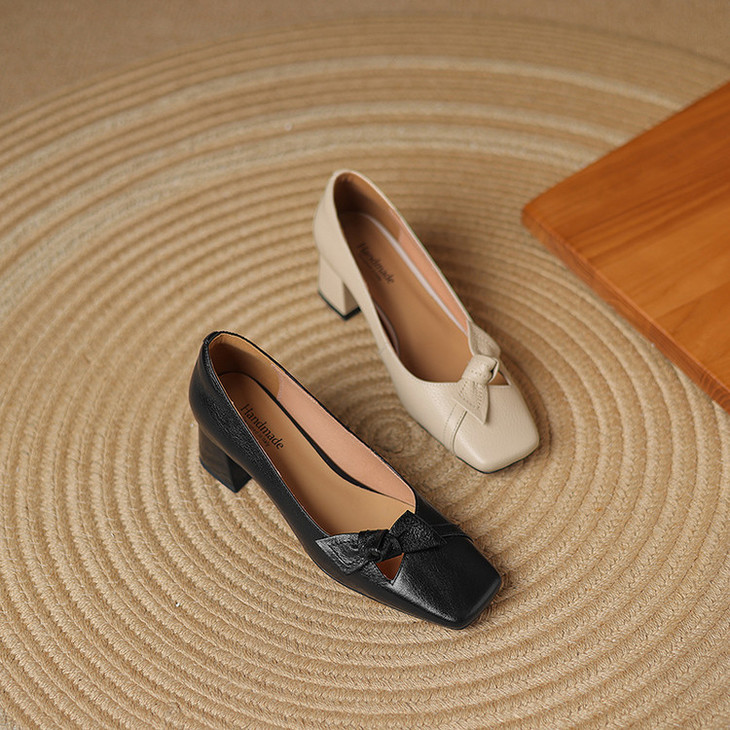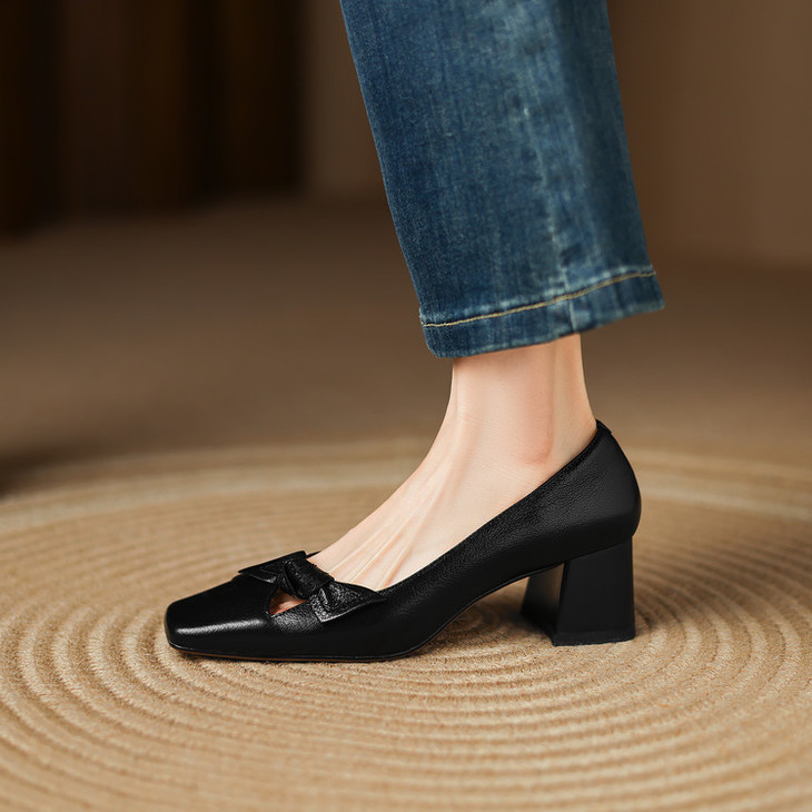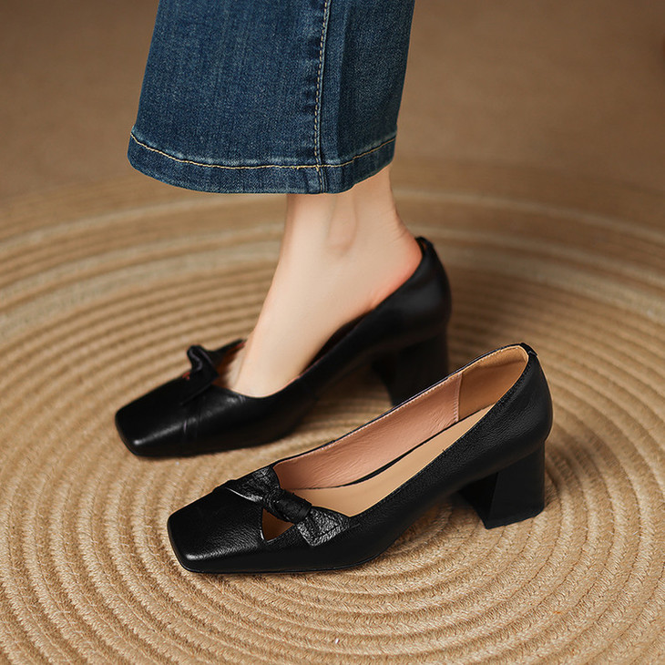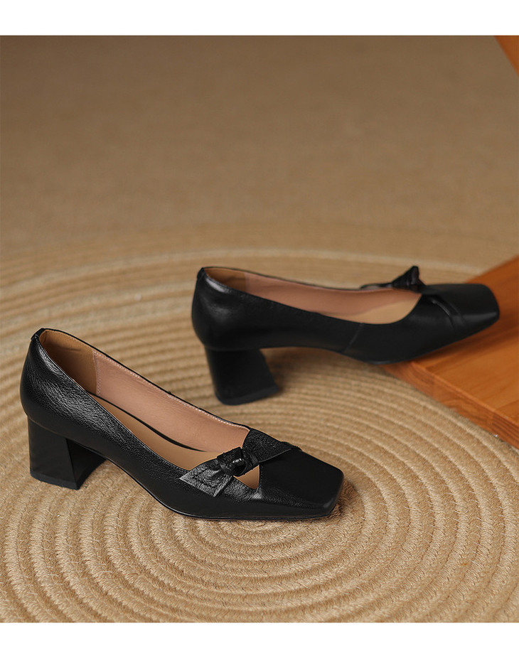 【预售5天】小清新复古方头粗跟单鞋真皮时尚镂空蝴蝶结气质高跟鞋软底中跟工作鞋女LD&7268